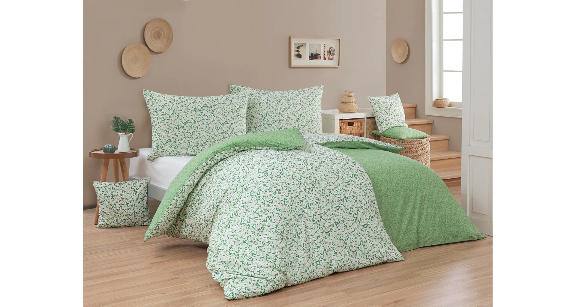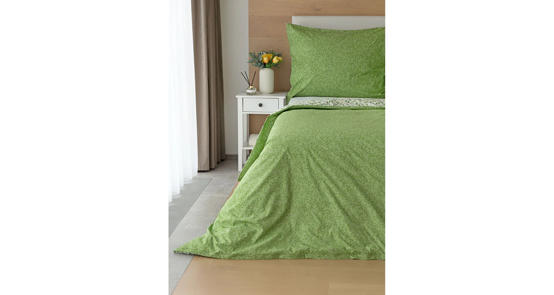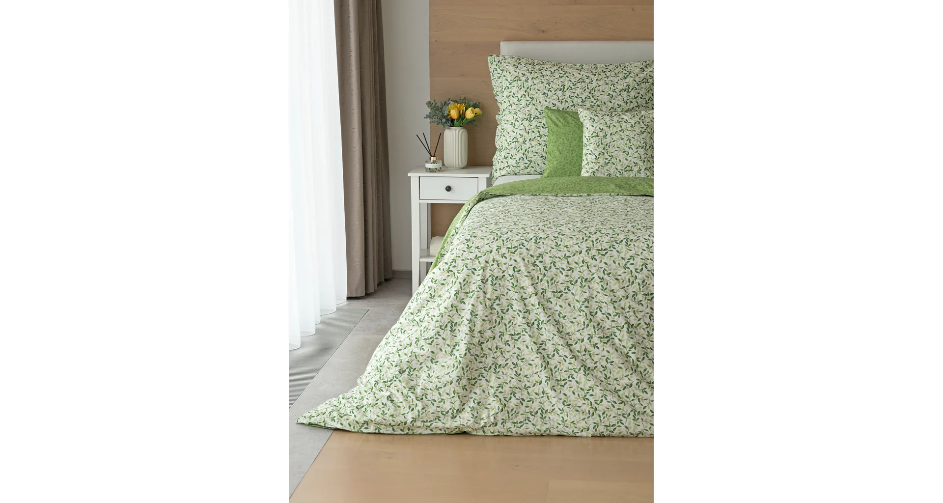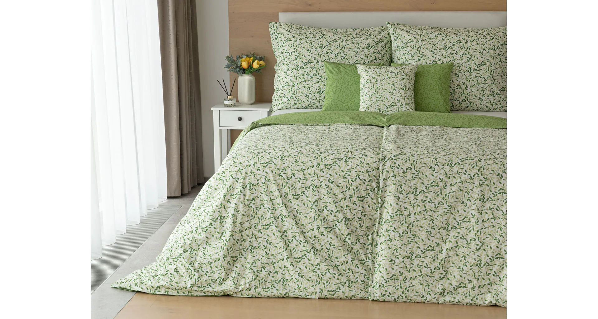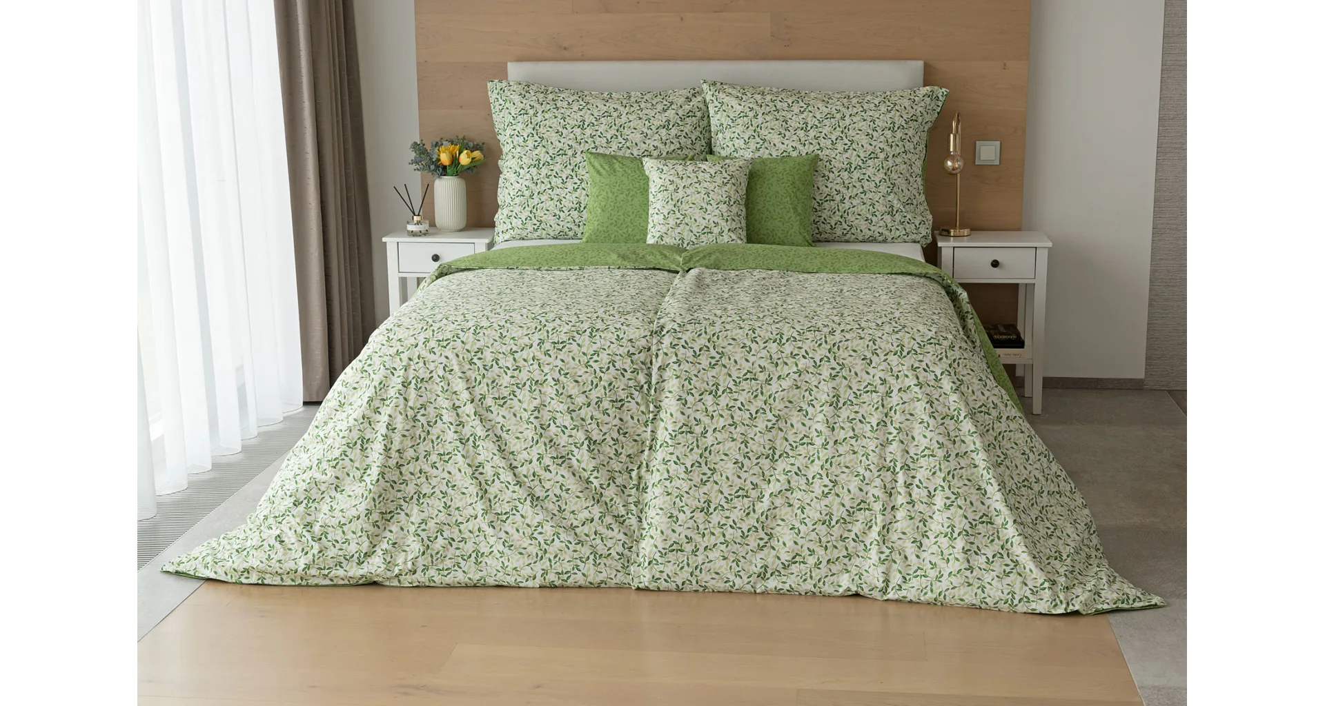Pozvite si do spálne sviežu jarnú atmosféru s bavlnenými obliečkami Gala. Nenápadný motív drobných lístočkov v palete zelených a šedozelených tónov vyniká z jednej strany na bielom podklade, druhú stranu zdobí motív tmavších zelených lístkov na atraktívnom zelenom podklade. Vďaka tomuto obojstrannému prevedeniu môžete pri stlaní hravo experimentovať!