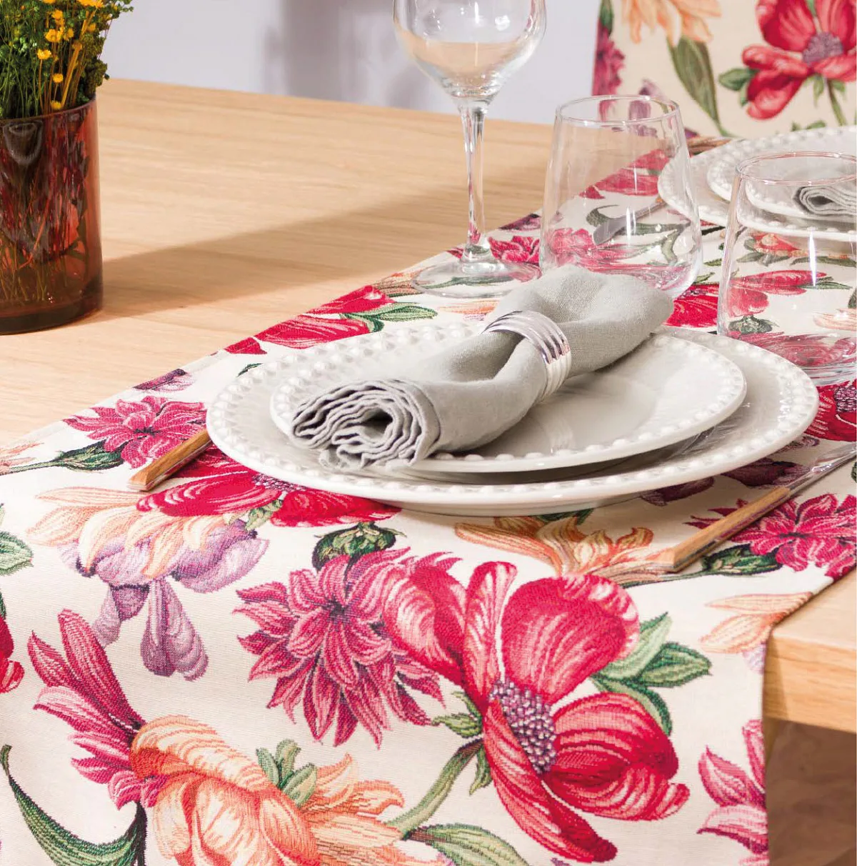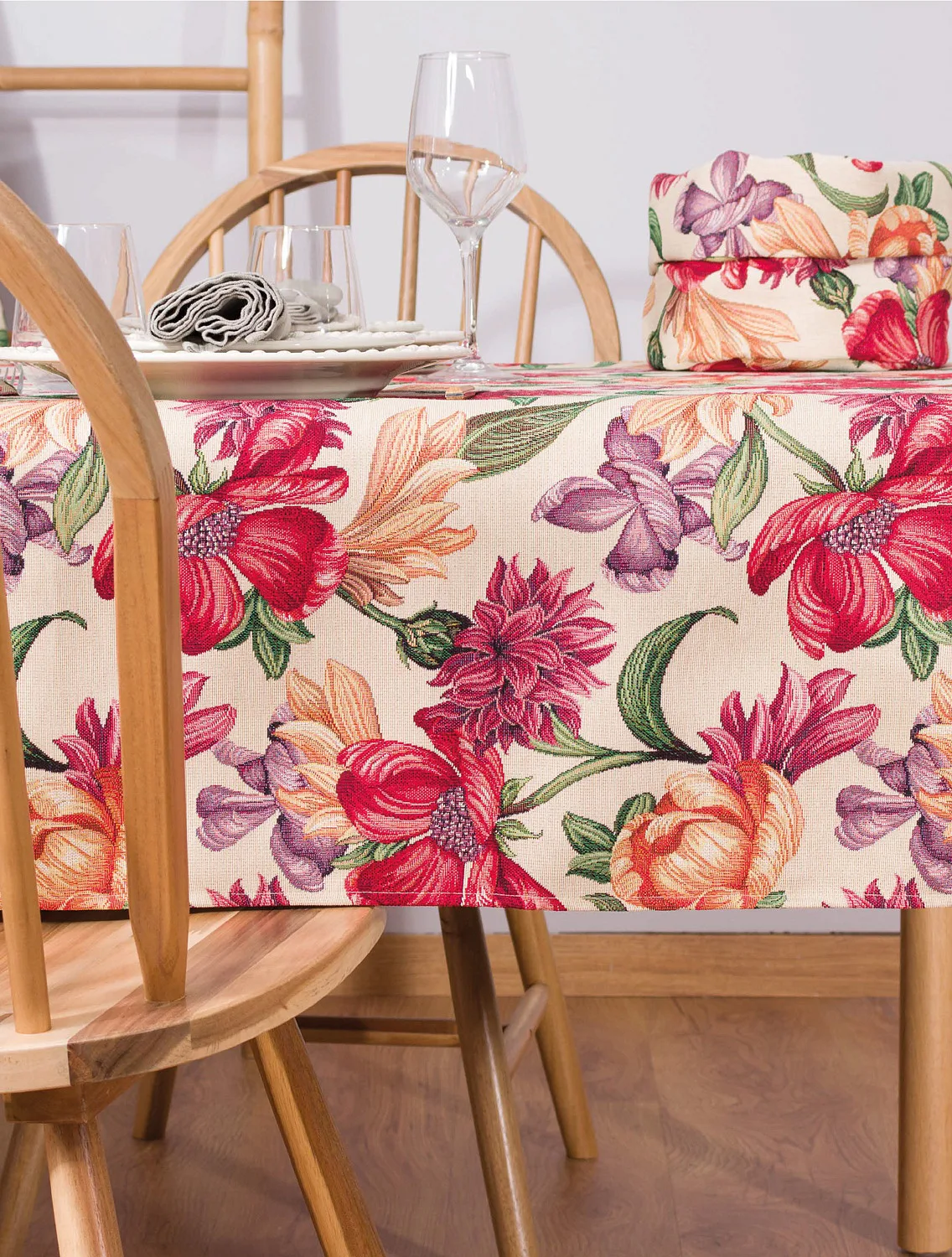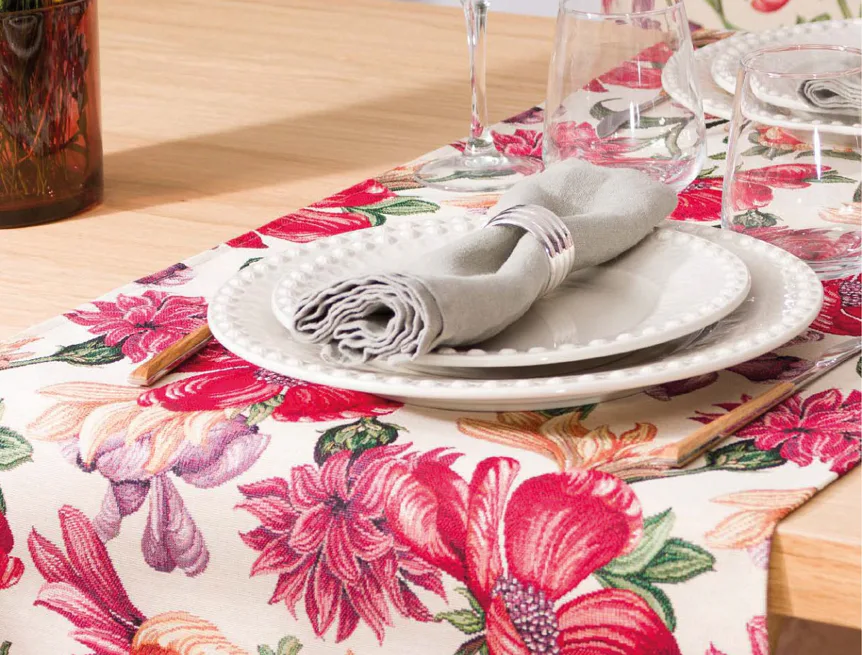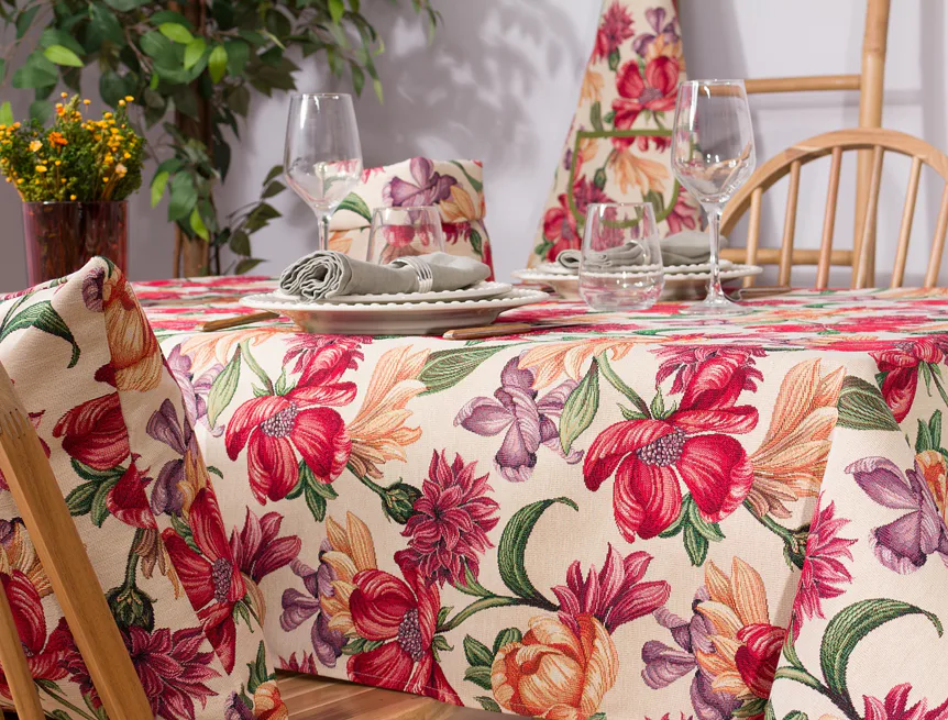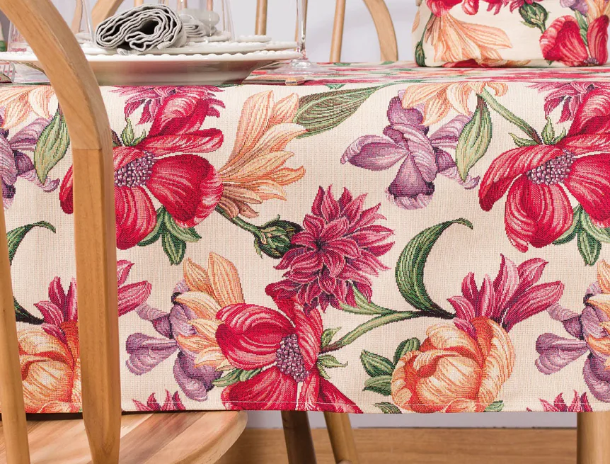 Ubrus Iris Allover s výraznými pestrobarevnými květy je ideální doplněk pro každou příležitost. Originální design s rustikálním nádechem se pojí s praktičností díky pevnému a odolnému materiálu.