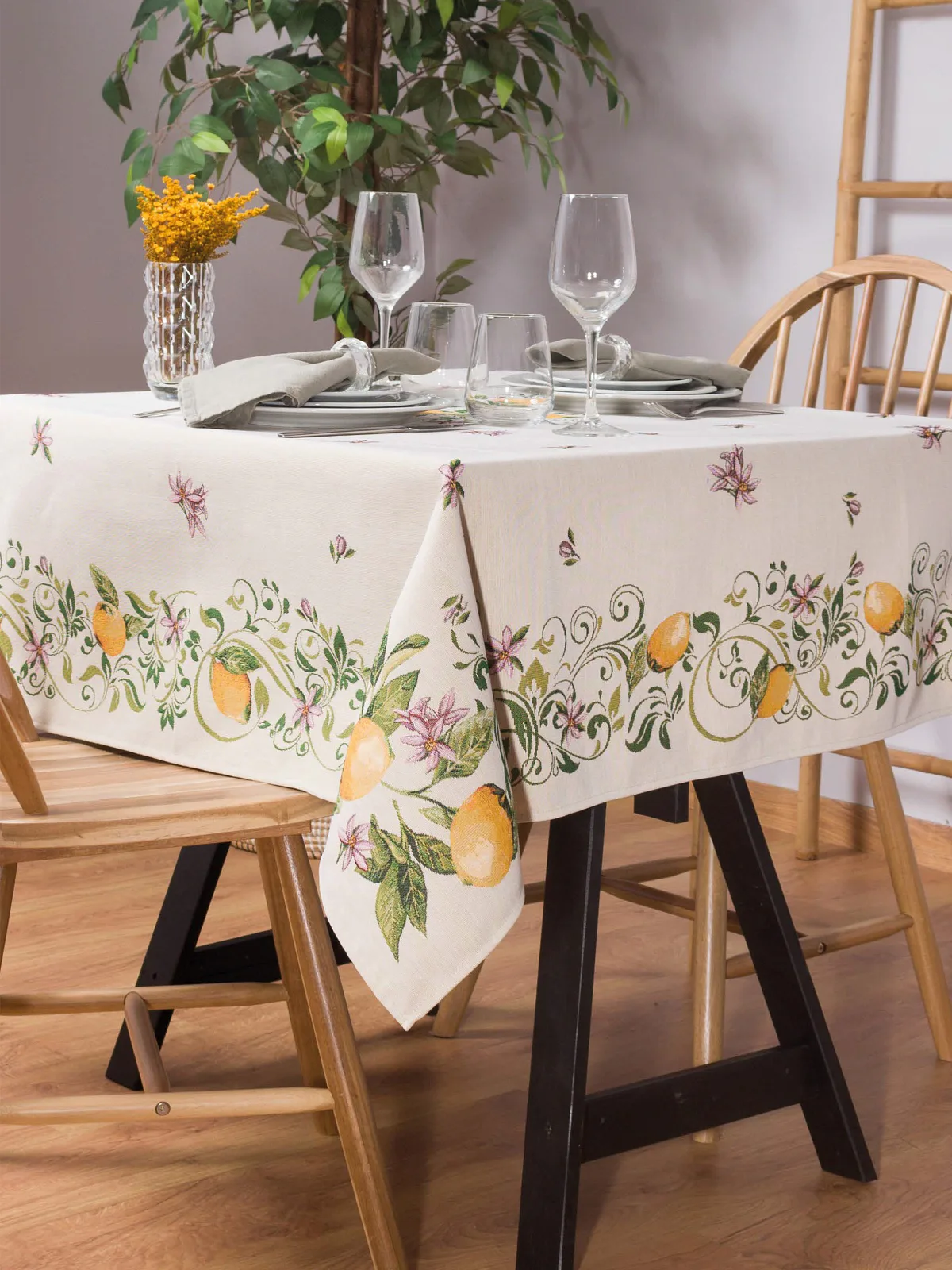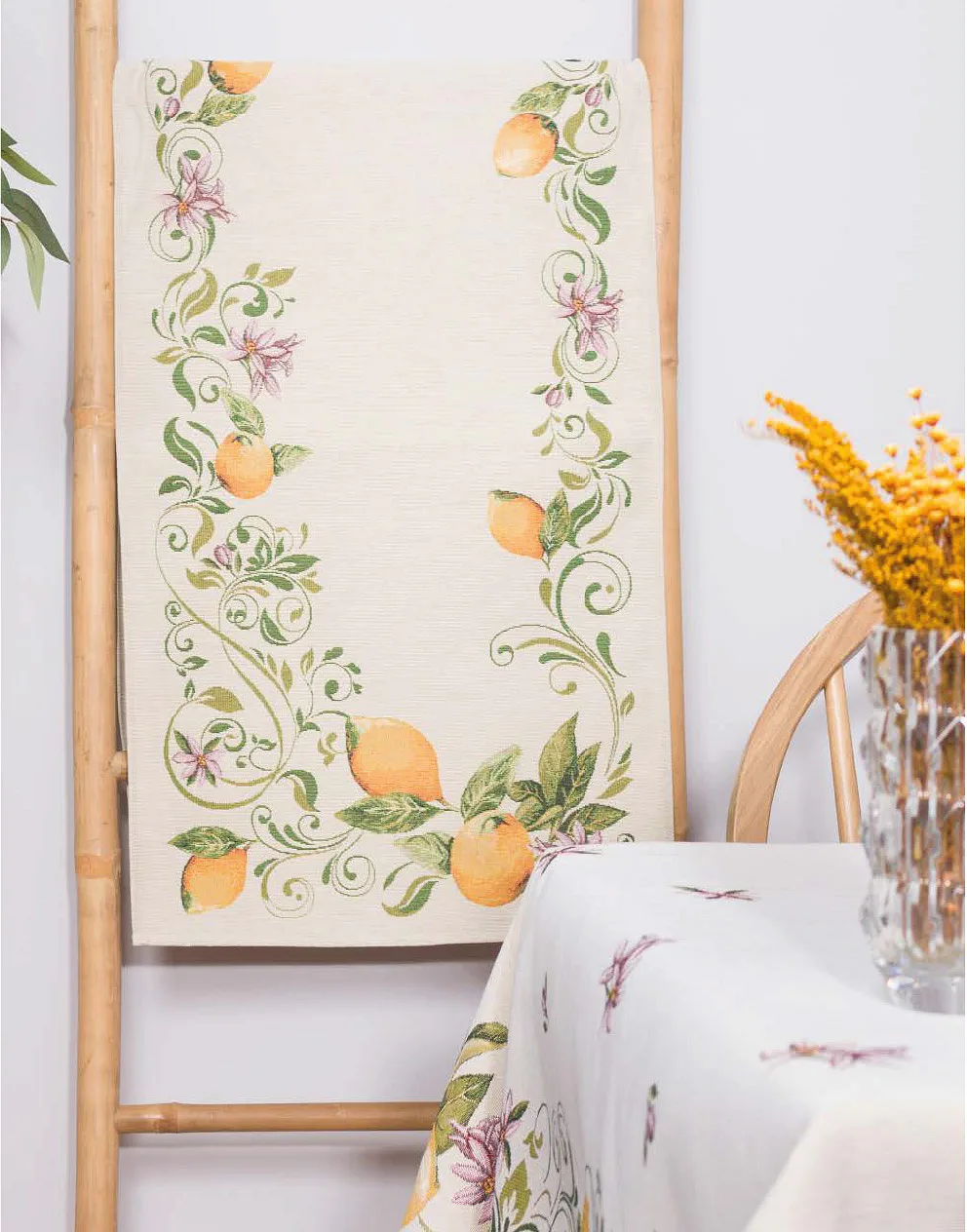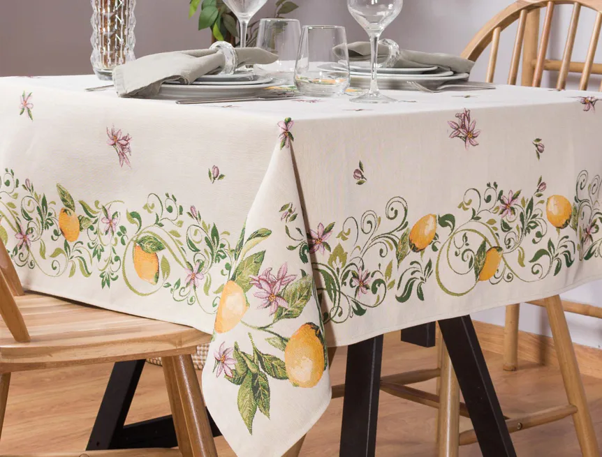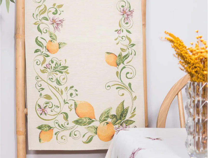 Ubrus Lima zdobený citrusy a jemnými květy je ideální doplněk pro každou příležitost. Elegantní design s rustikálním nádechem se pojí s praktičností díky pevnému a odolnému materiálu.