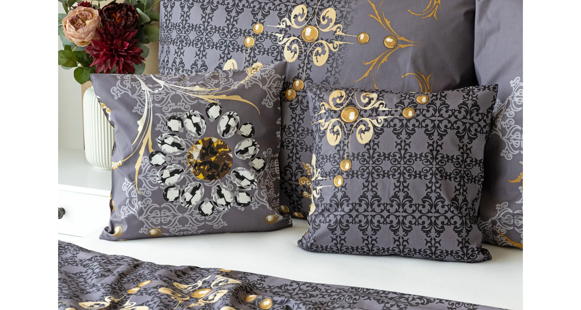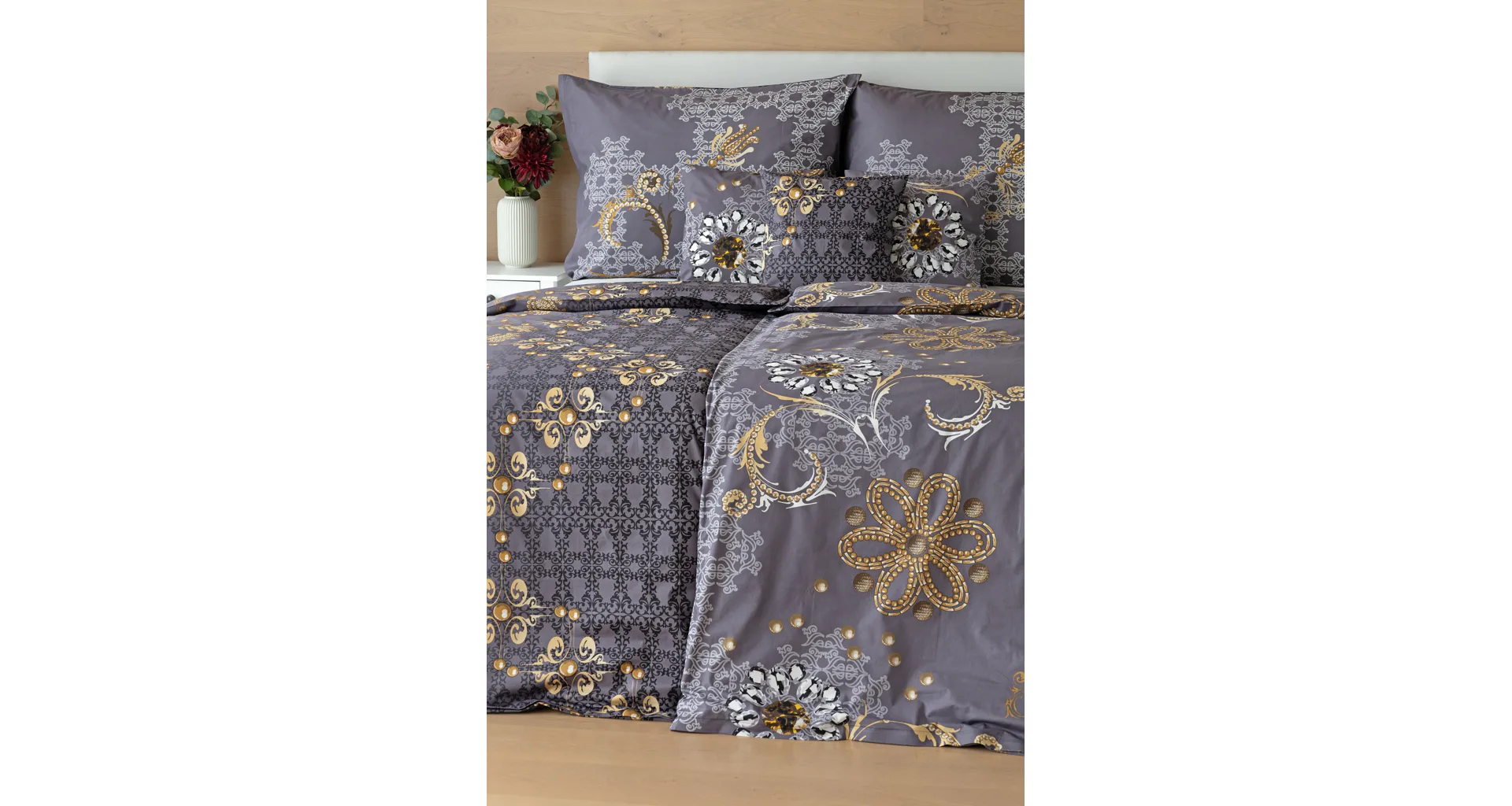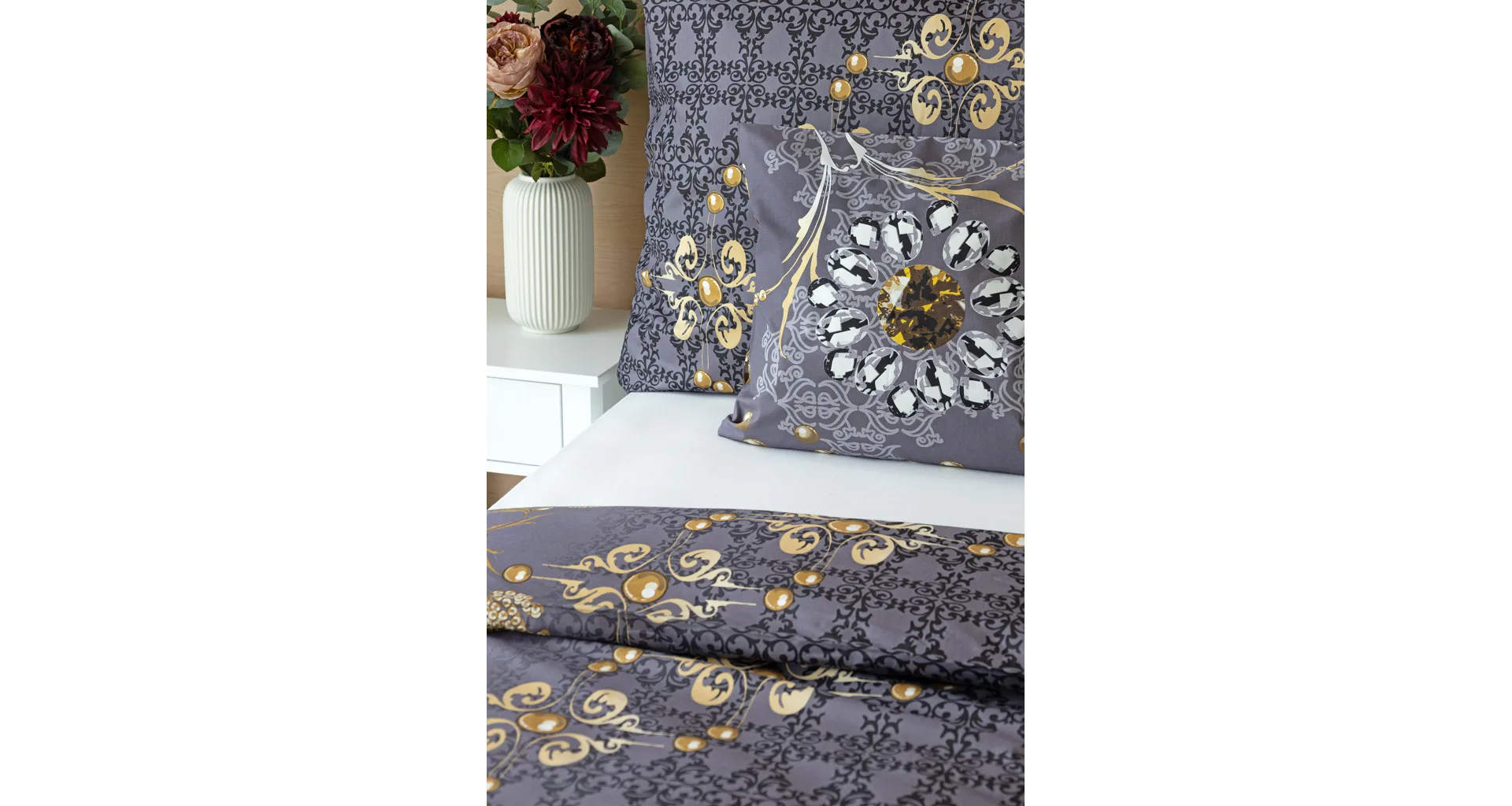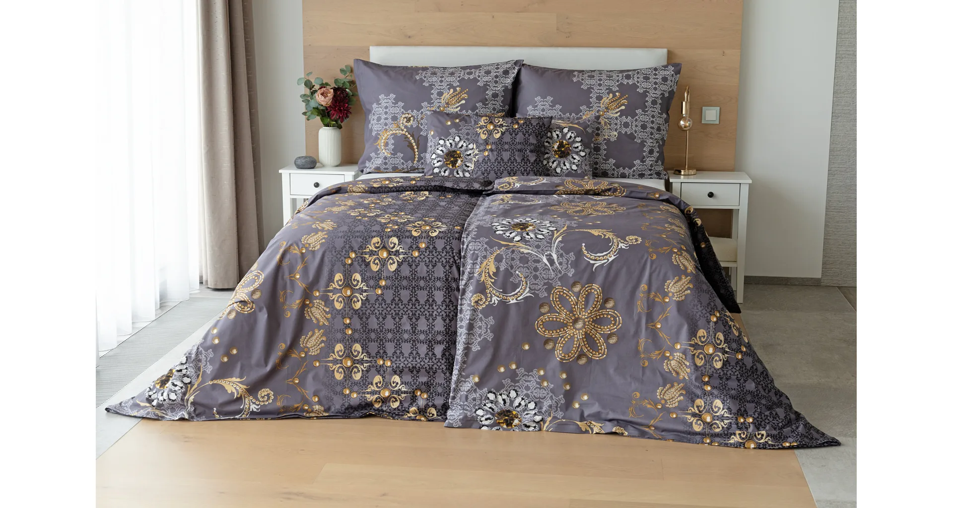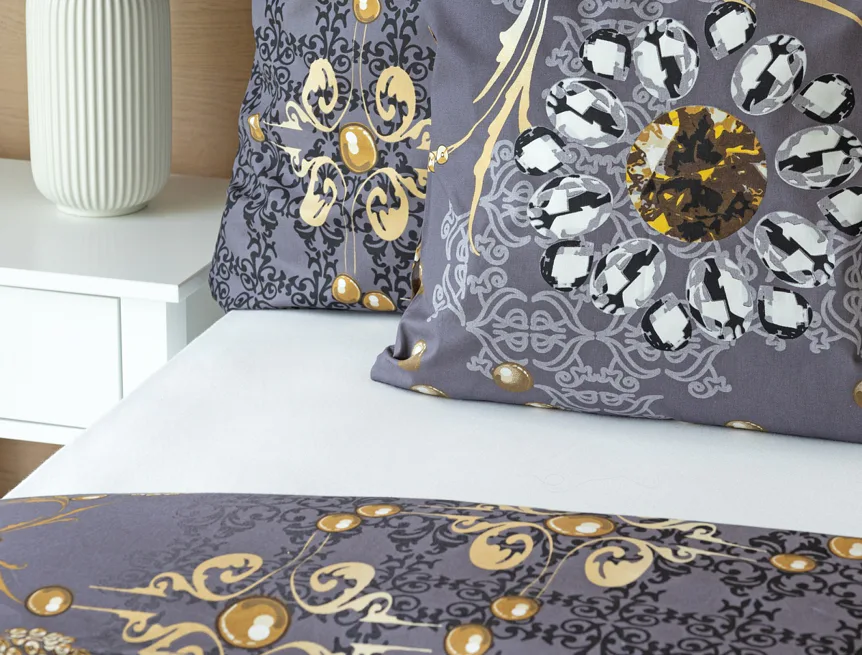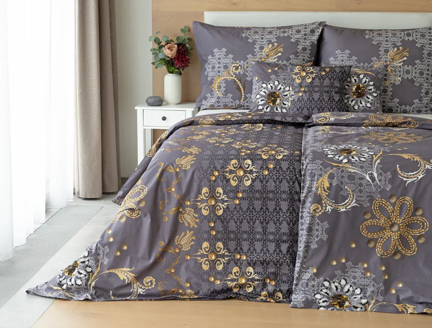 Noblesa a elegancia sa snúbia vo výnimočnom vzore GOLD. Luxusné vyhotovenie prírodných materiálov a precízna tlač zladených tónov tmavosivej a zlatistej nechávajú vyniknúť celému dizajnu. Posteľná bielizeň je z oboch strán rovnaká, vankúš 70/90 cm je z každej strany iný (pozri fotografie). Posteľná bielizeň je vybavená zipsovým uzáverom pre vyšší užívateľský komfort. Obliečky 40/40 cm sa šijú z látky použitej na posteľnú bielizeň, každý kus môže byť iný.