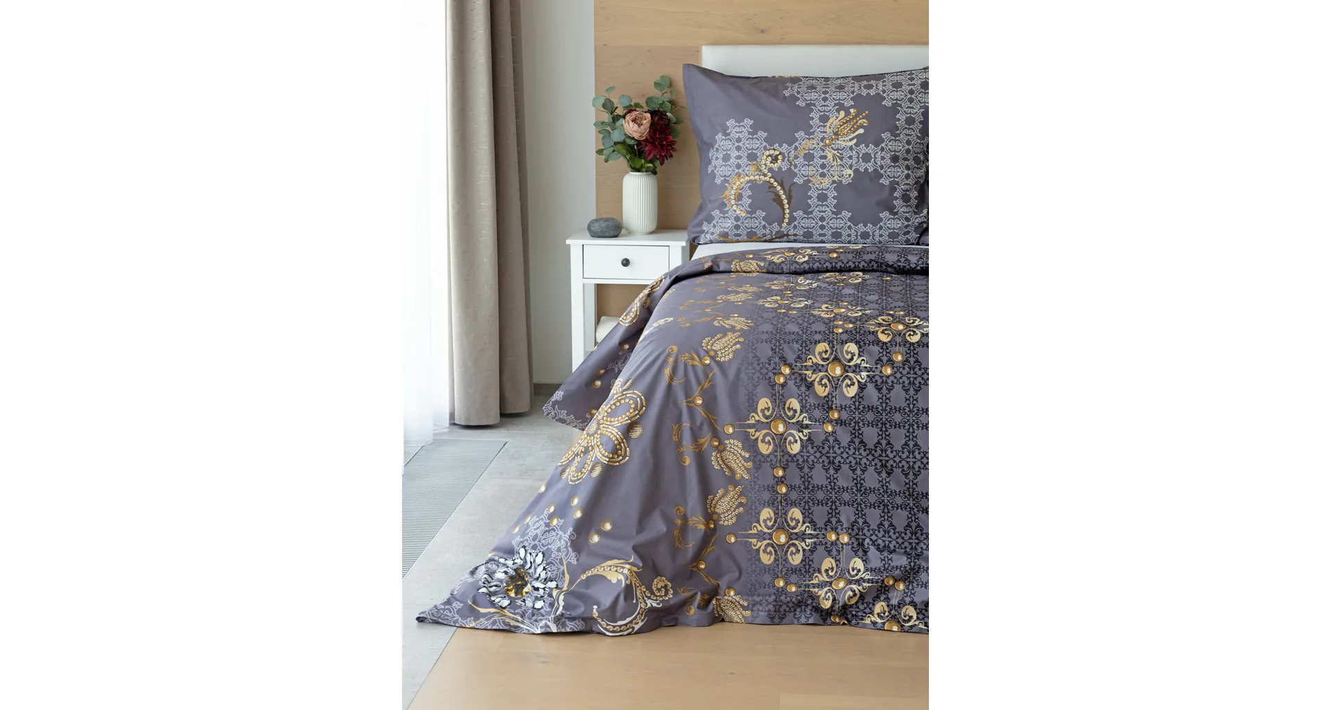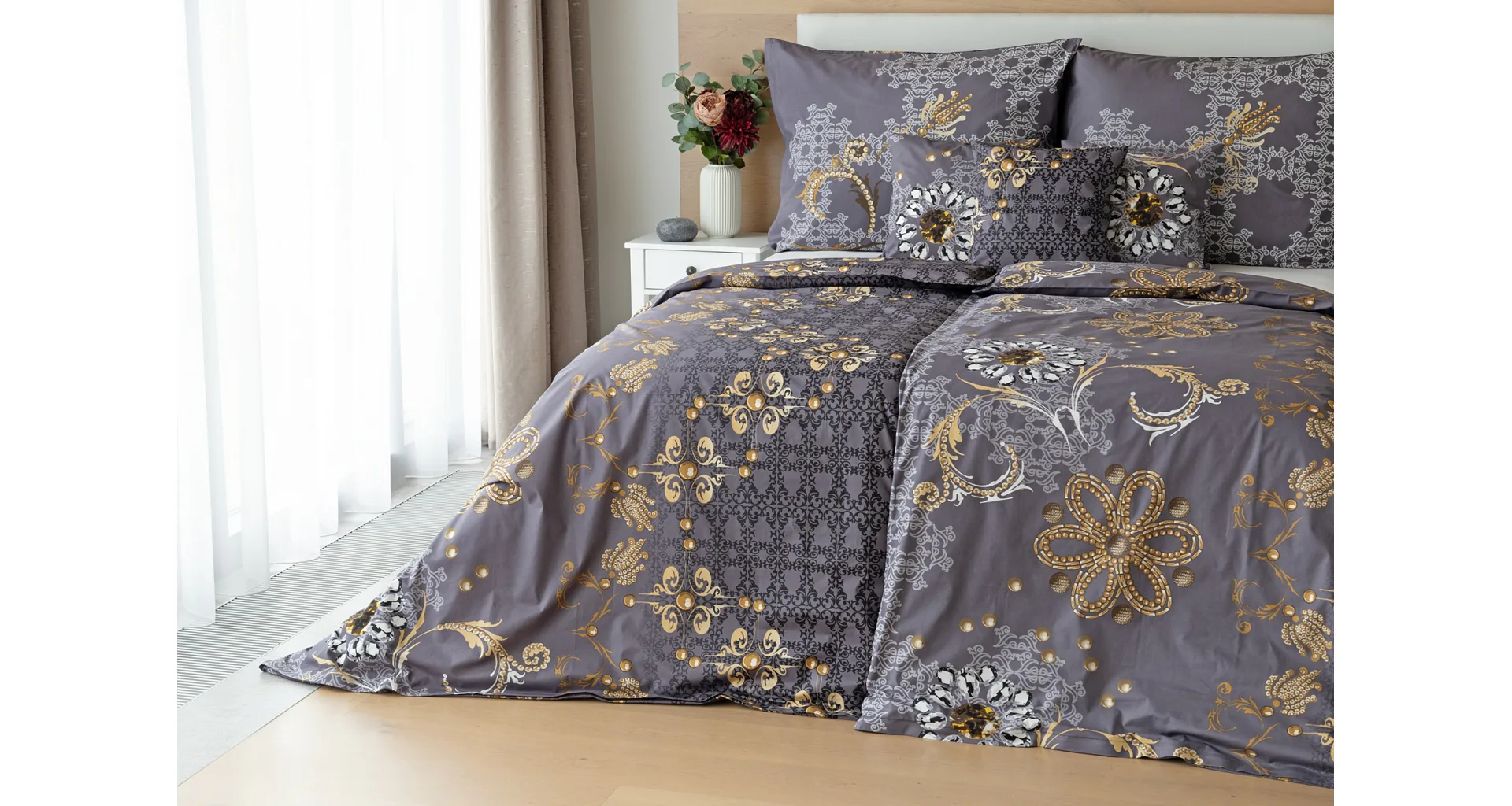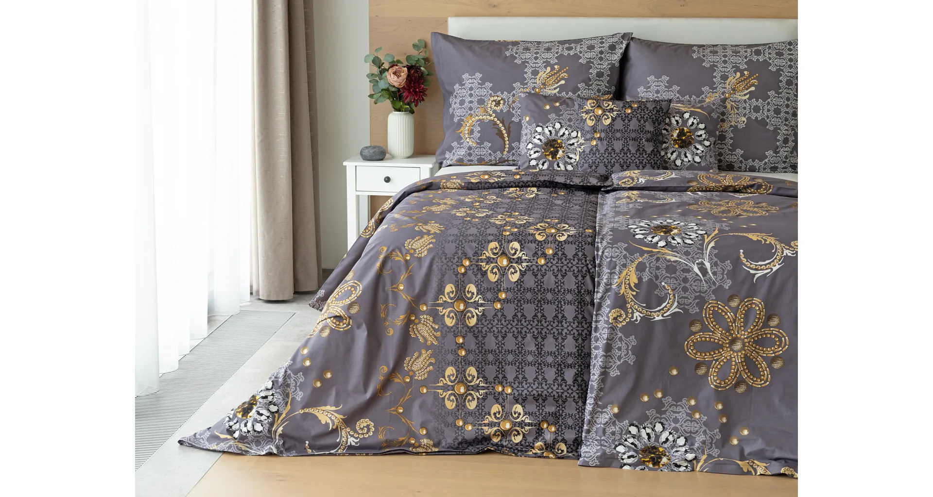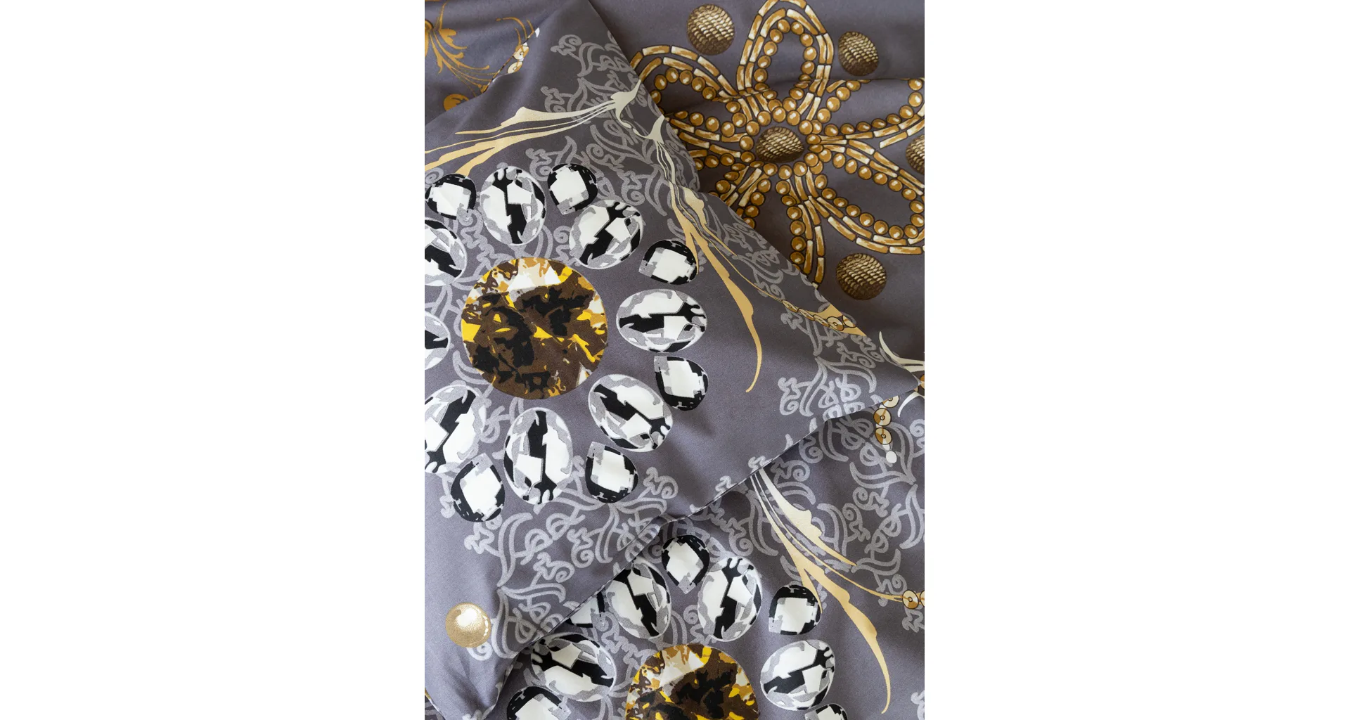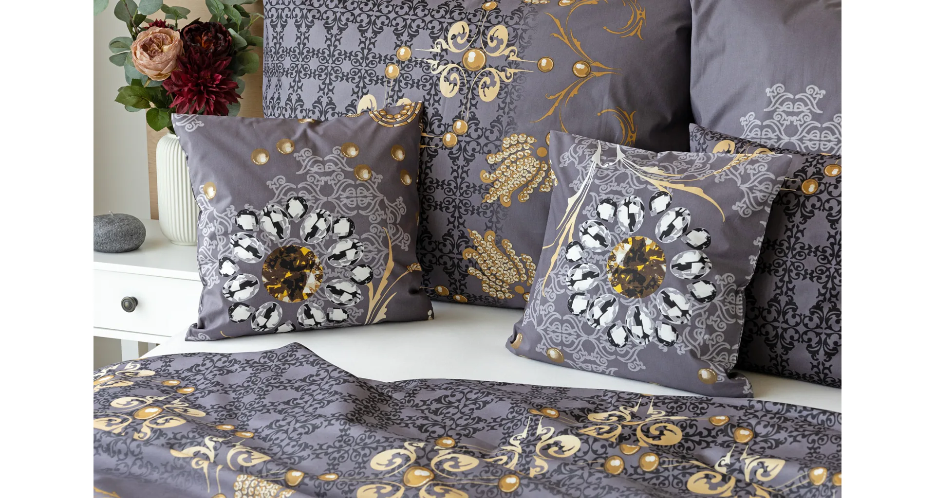 Noblesa a elegancia sa snúbia vo výnimočnom vzore GOLD. Luxusné vyhotovenie prírodných materiálov a precízna tlač zladených tónov tmavosivej a zlatistej nechávajú vyniknúť celému dizajnu. Posteľná bielizeň je z oboch strán rovnaká, vankúš 70/90 cm je z každej strany iný (pozri fotografie). Posteľná bielizeň je vybavená zipsovým uzáverom pre vyšší užívateľský komfort. Obliečky 40/40 cm sa šijú z látky použitej na posteľnú bielizeň, každý kus môže byť iný.