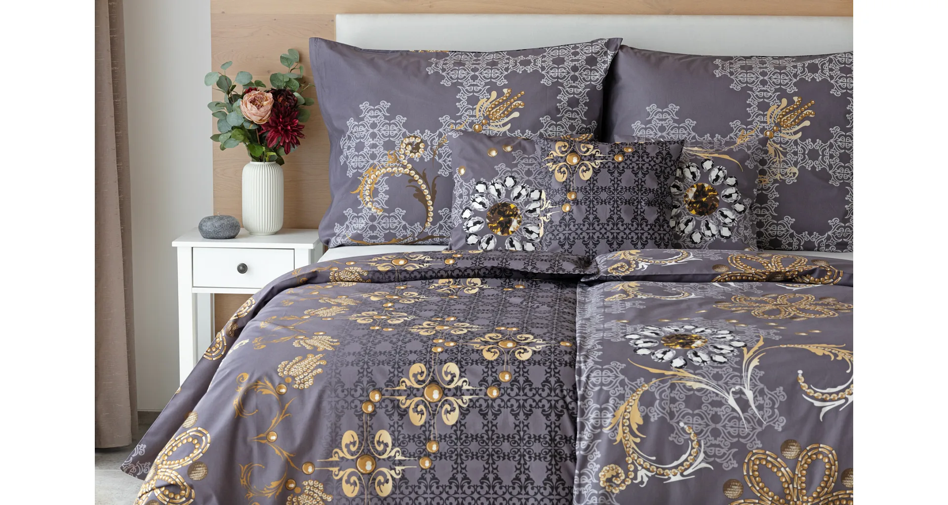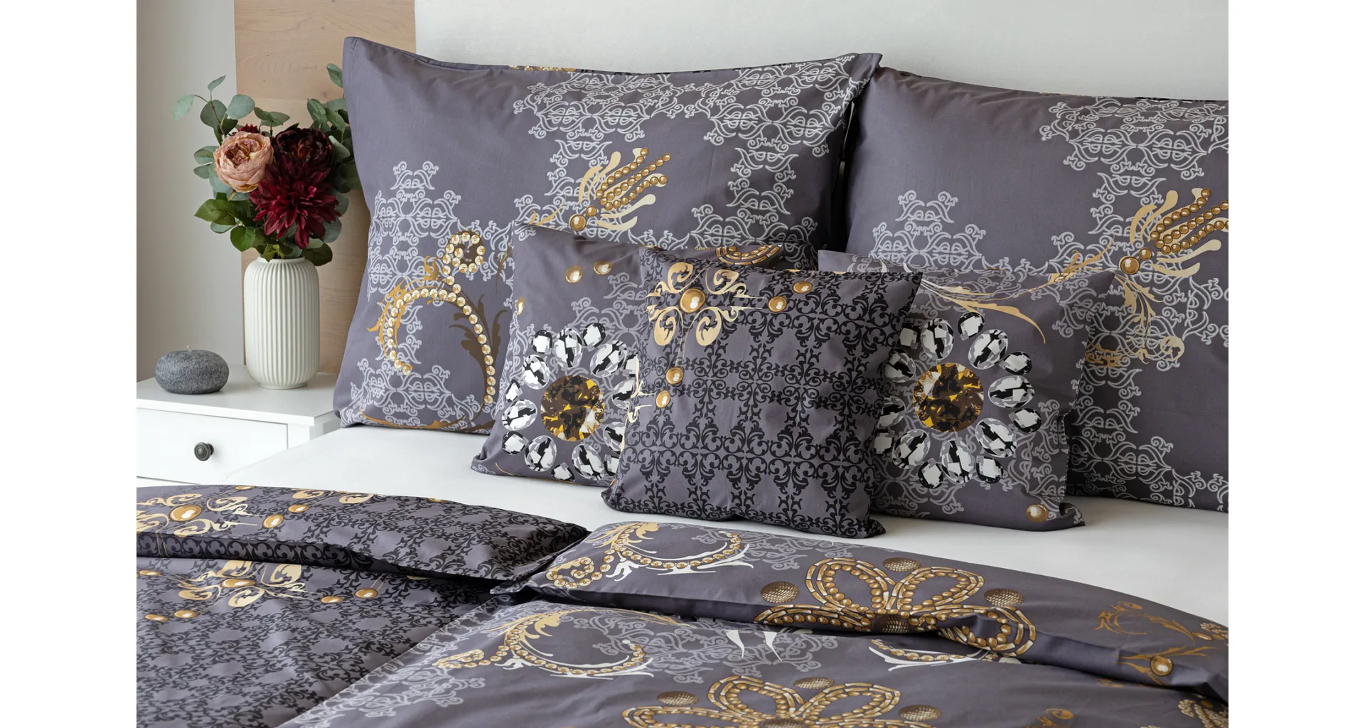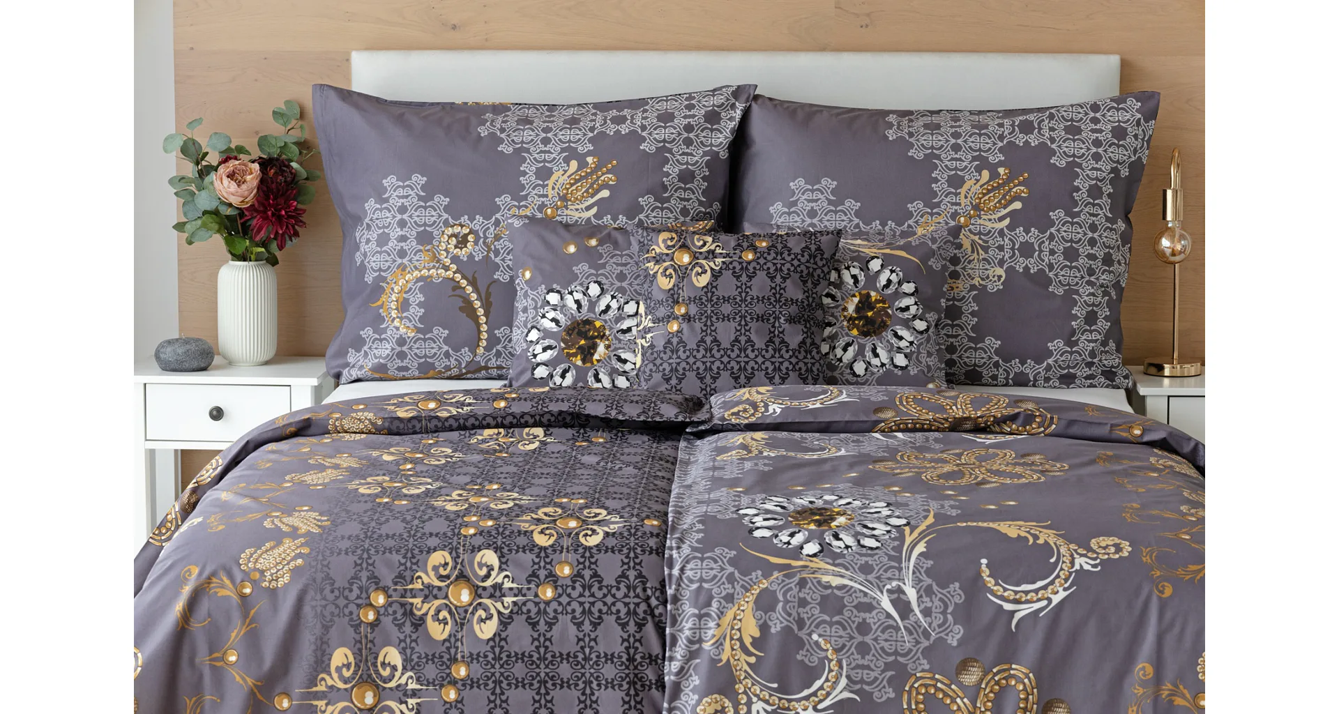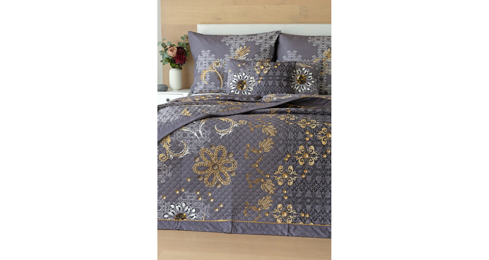 ODPORÚČAME ustielať s luxusnou prešívanou prikrývkou v rovnakom vzore ako posteľná bielizeň.
