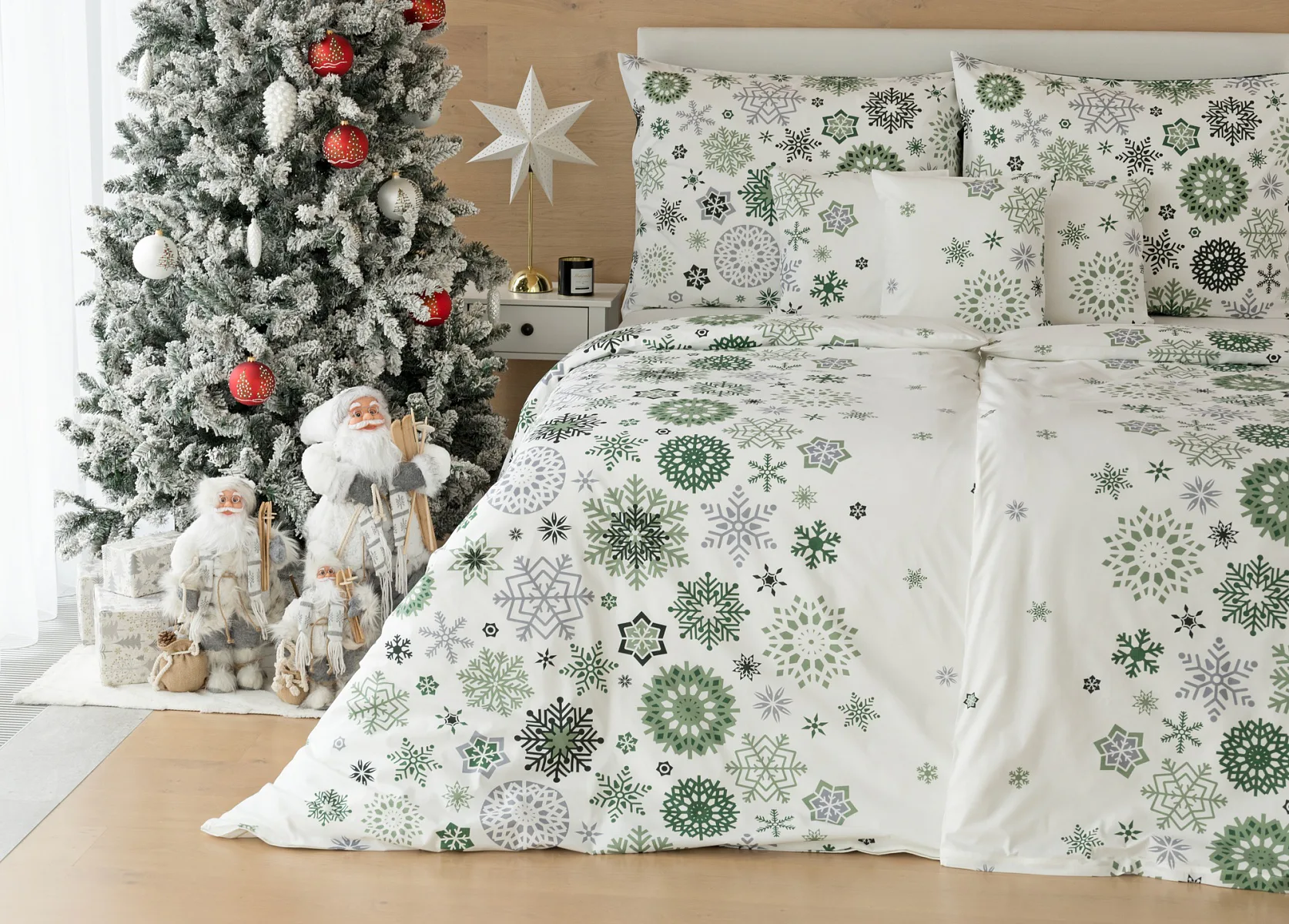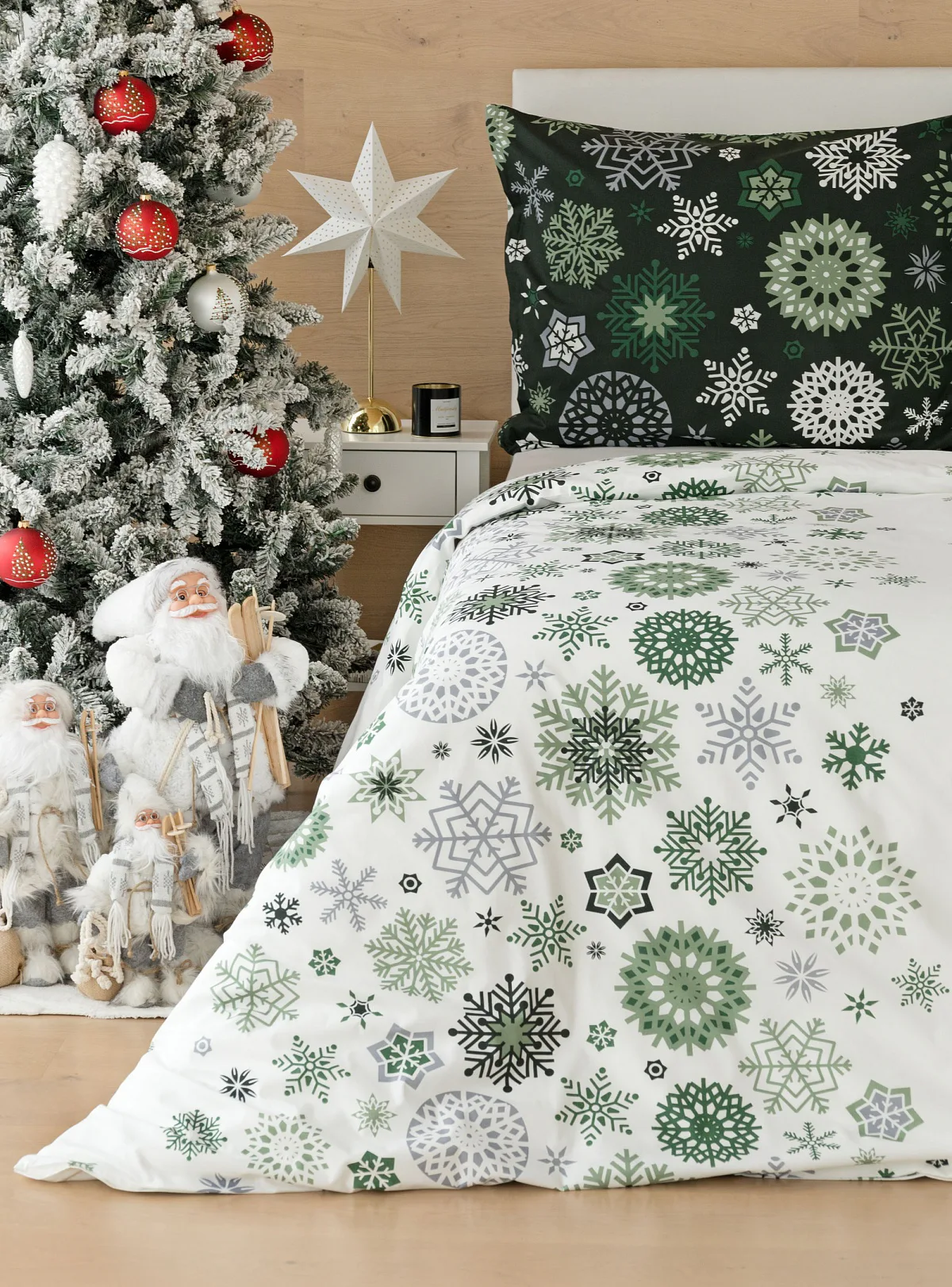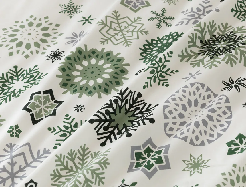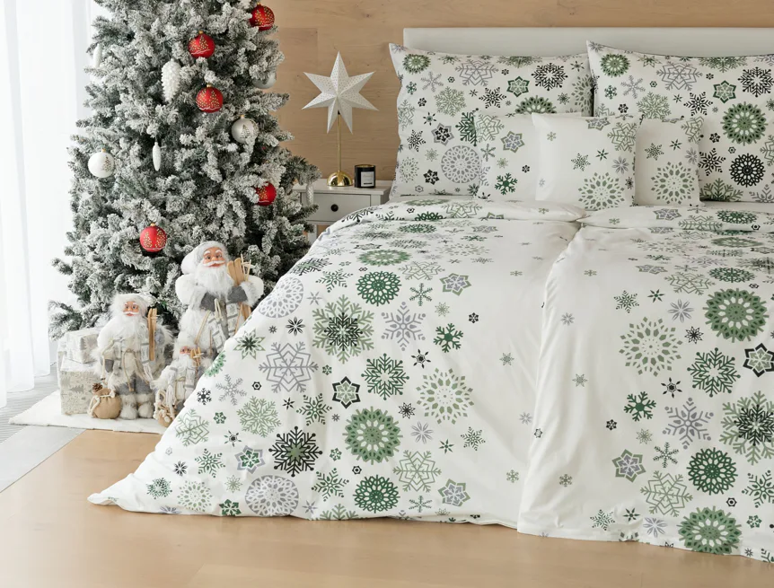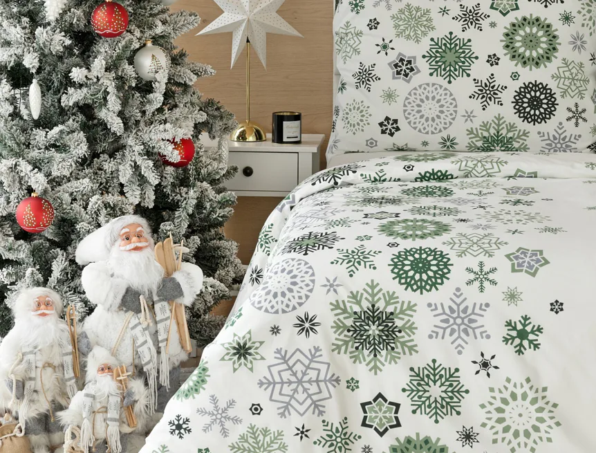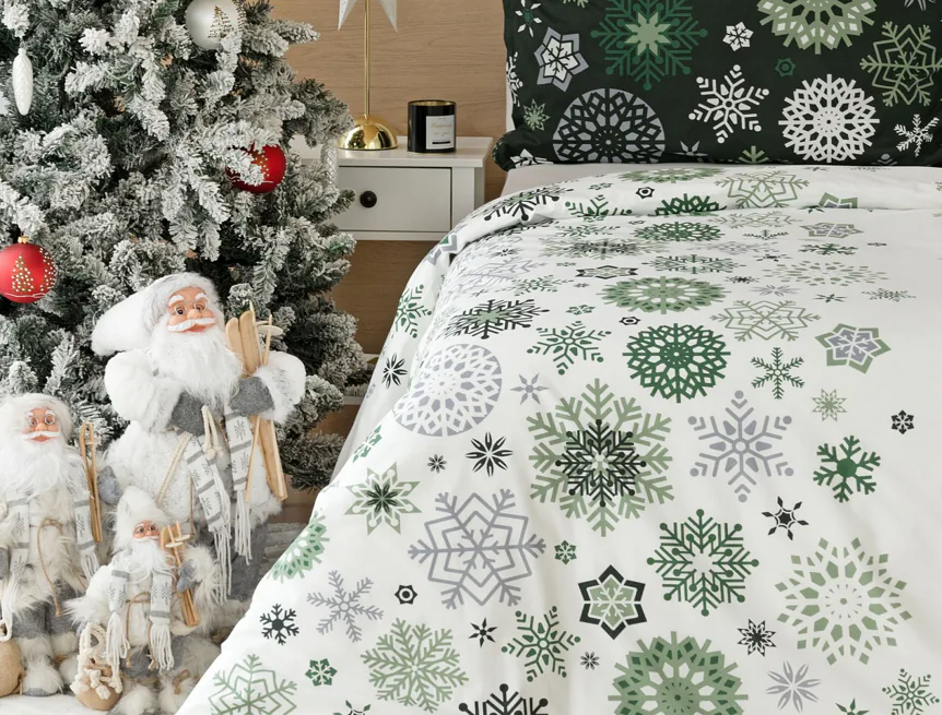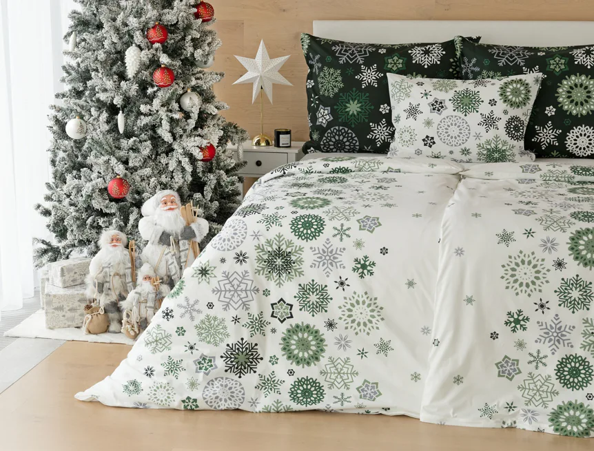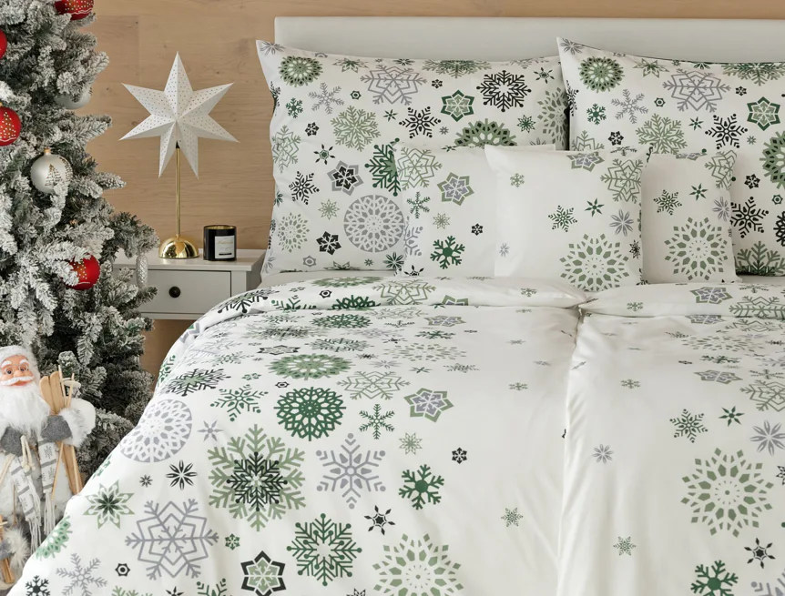 Čistý a okúzľujúci vianočný motív prinášajú bavlnené obliečky Green Stars. Snehové vločky rozličných tvarov v palete šedých a zelených tónov sú rozosiate na bielom podklade. Vďaka inverznému prevedeniu obliečky na vankúš môžete pri stlaní hravo experimentovať.