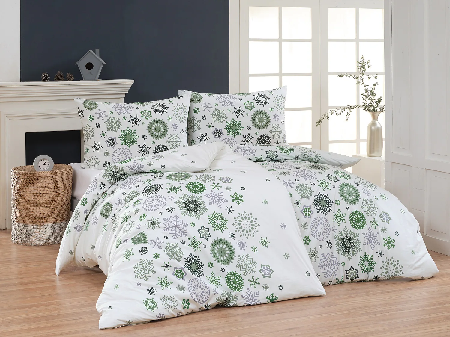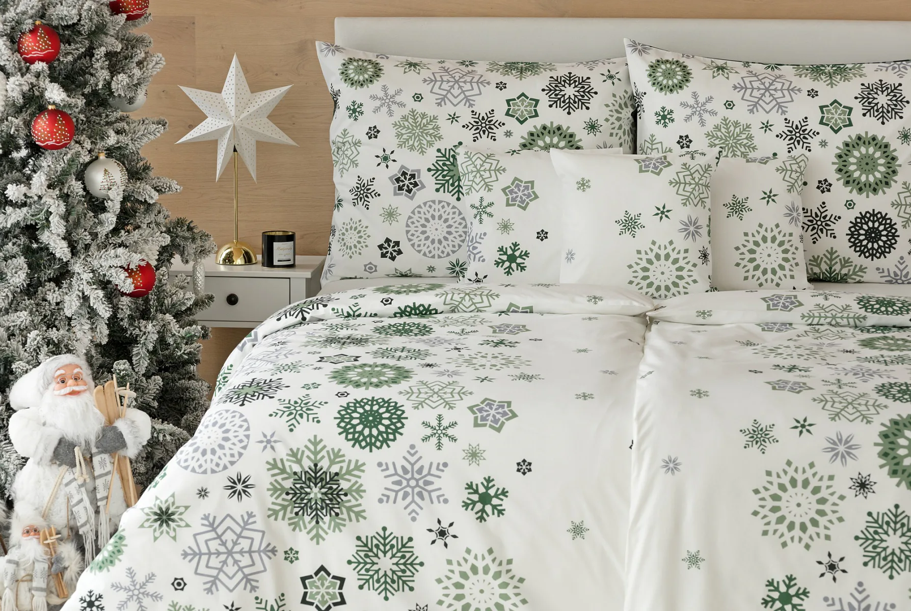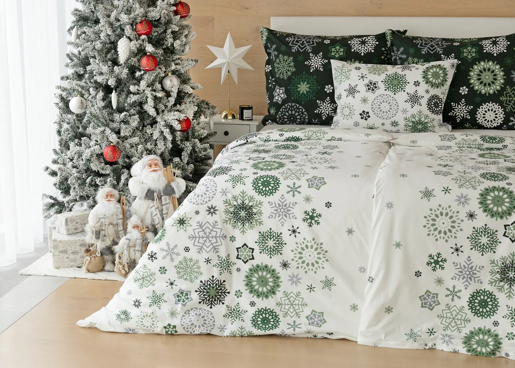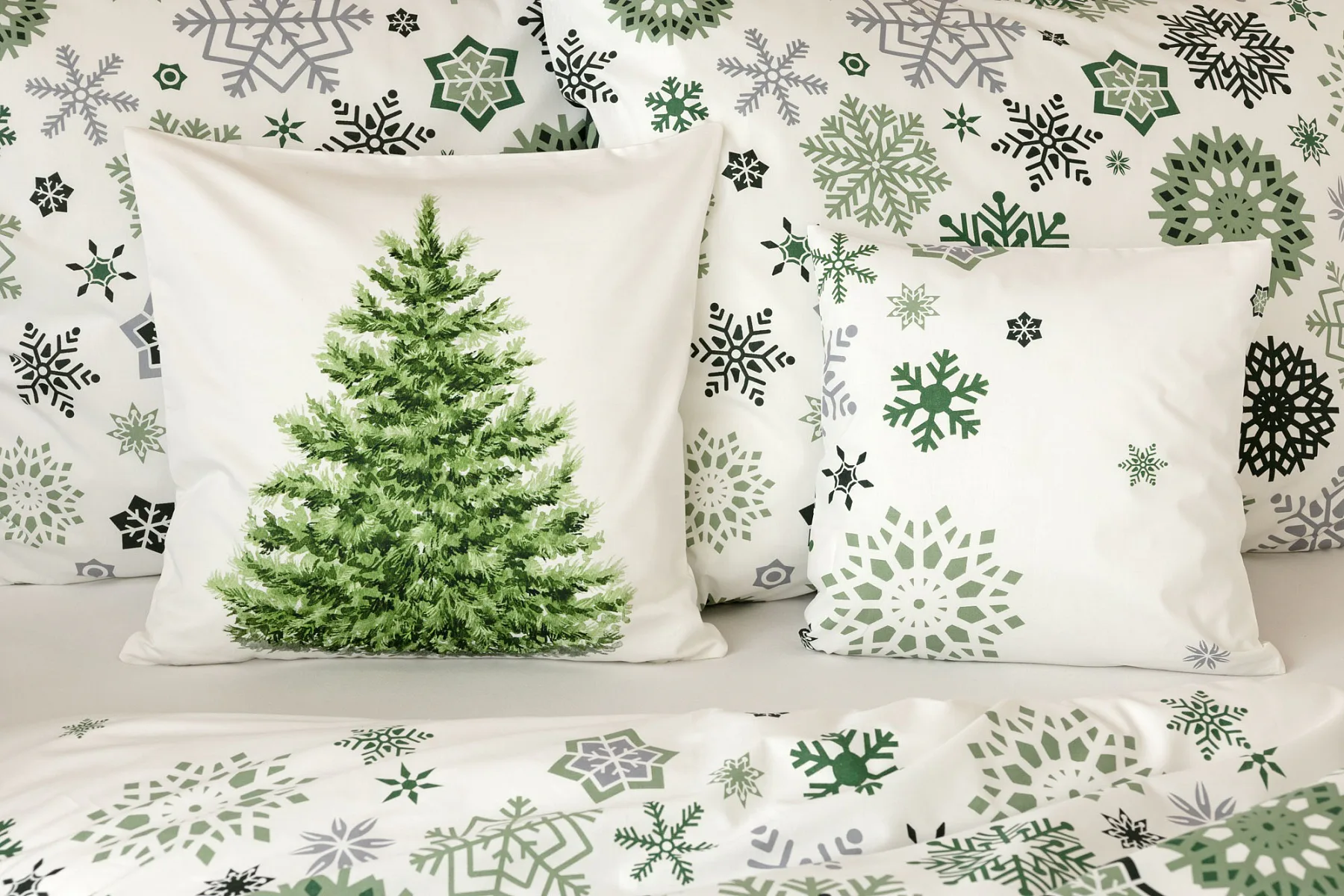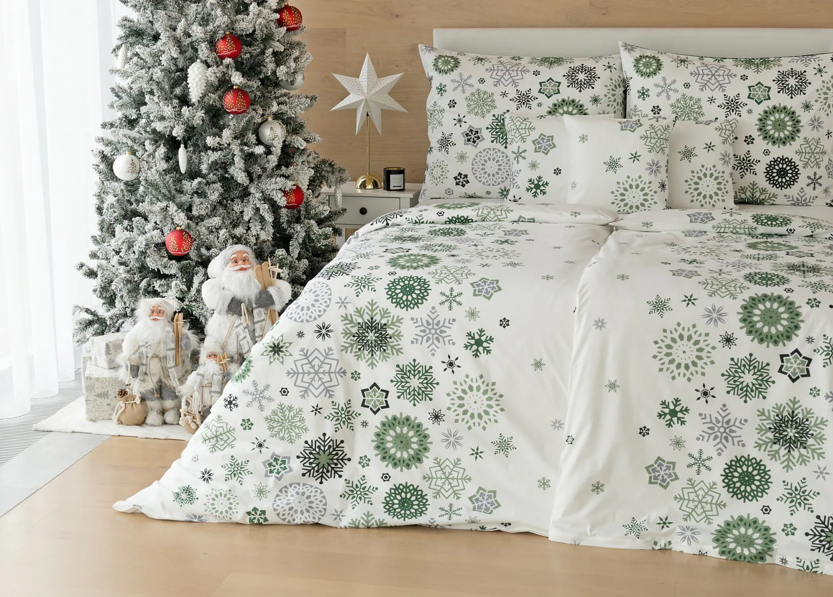 Čistý a okúzľujúci vianočný motív prinášajú bavlnené obliečky Green Stars. Snehové vločky rozličných tvarov v palete šedých a zelených tónov sú rozosiate na bielom podklade. Vďaka inverznému prevedeniu obliečky na vankúš môžete pri stlaní hravo experimentovať.