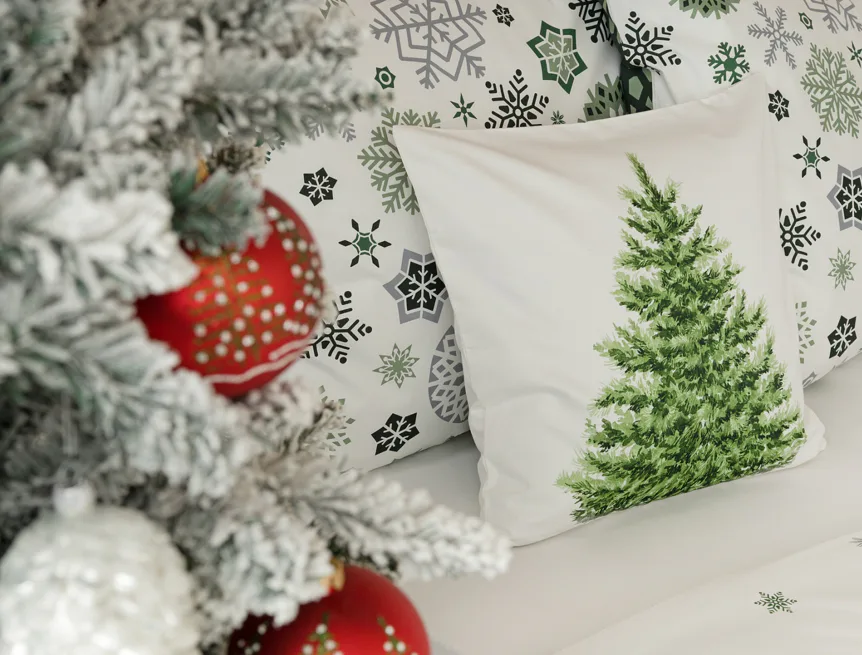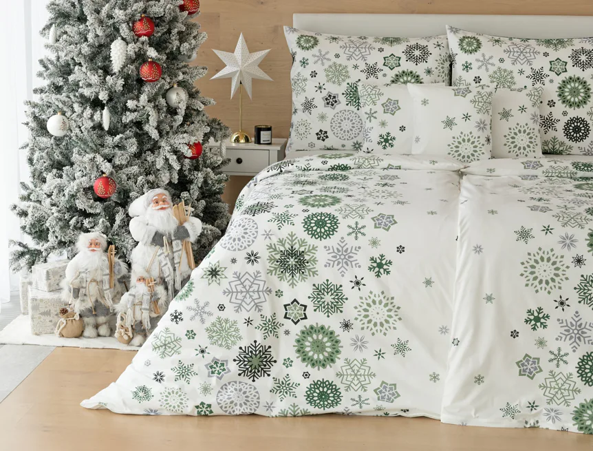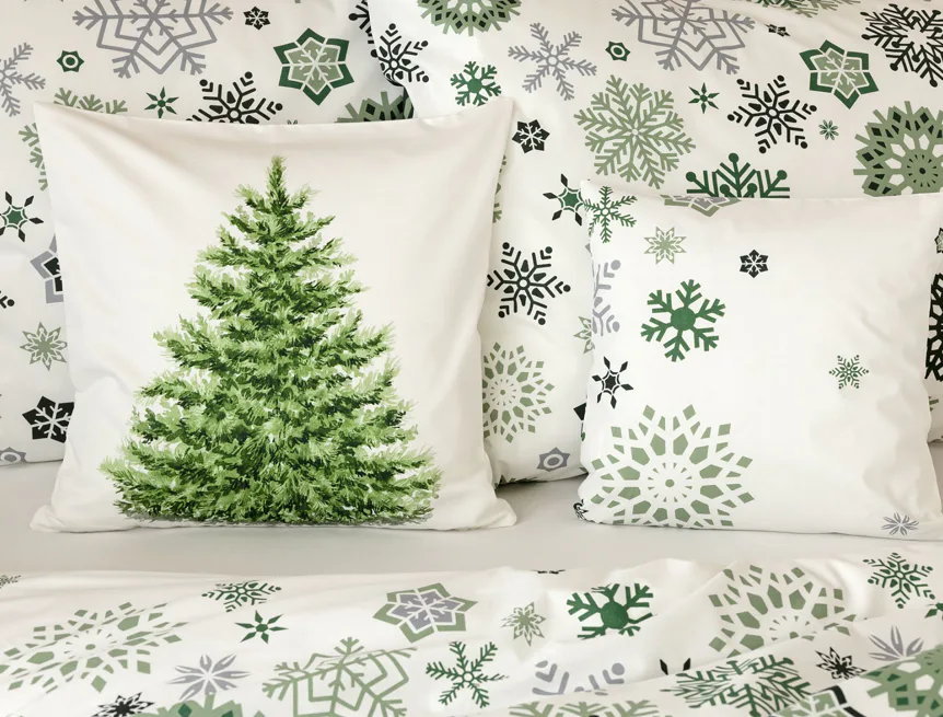 Povlak na prikrývku je z oboch strán rovnaký. Spodná strana obliečky na vankúš je v inverznom prevedení, kedy podklad tvorí sviatočná tmavo zelená farba. Obliečky sú opatrené komfortným zipsovým uzáverom