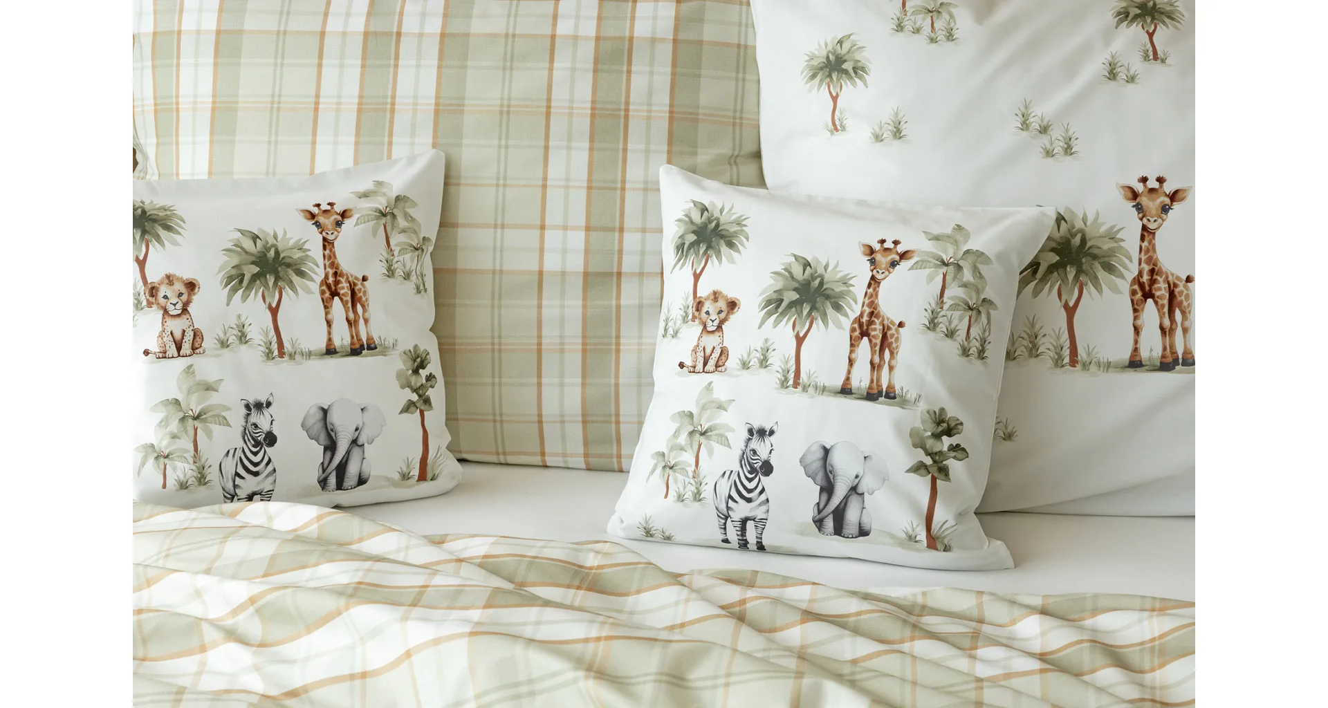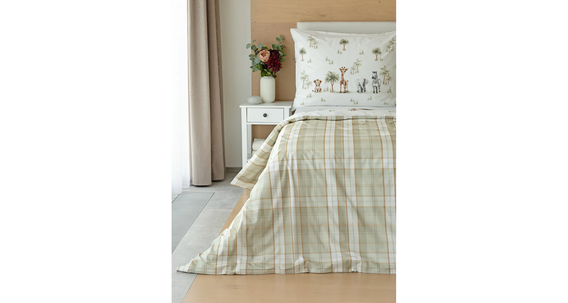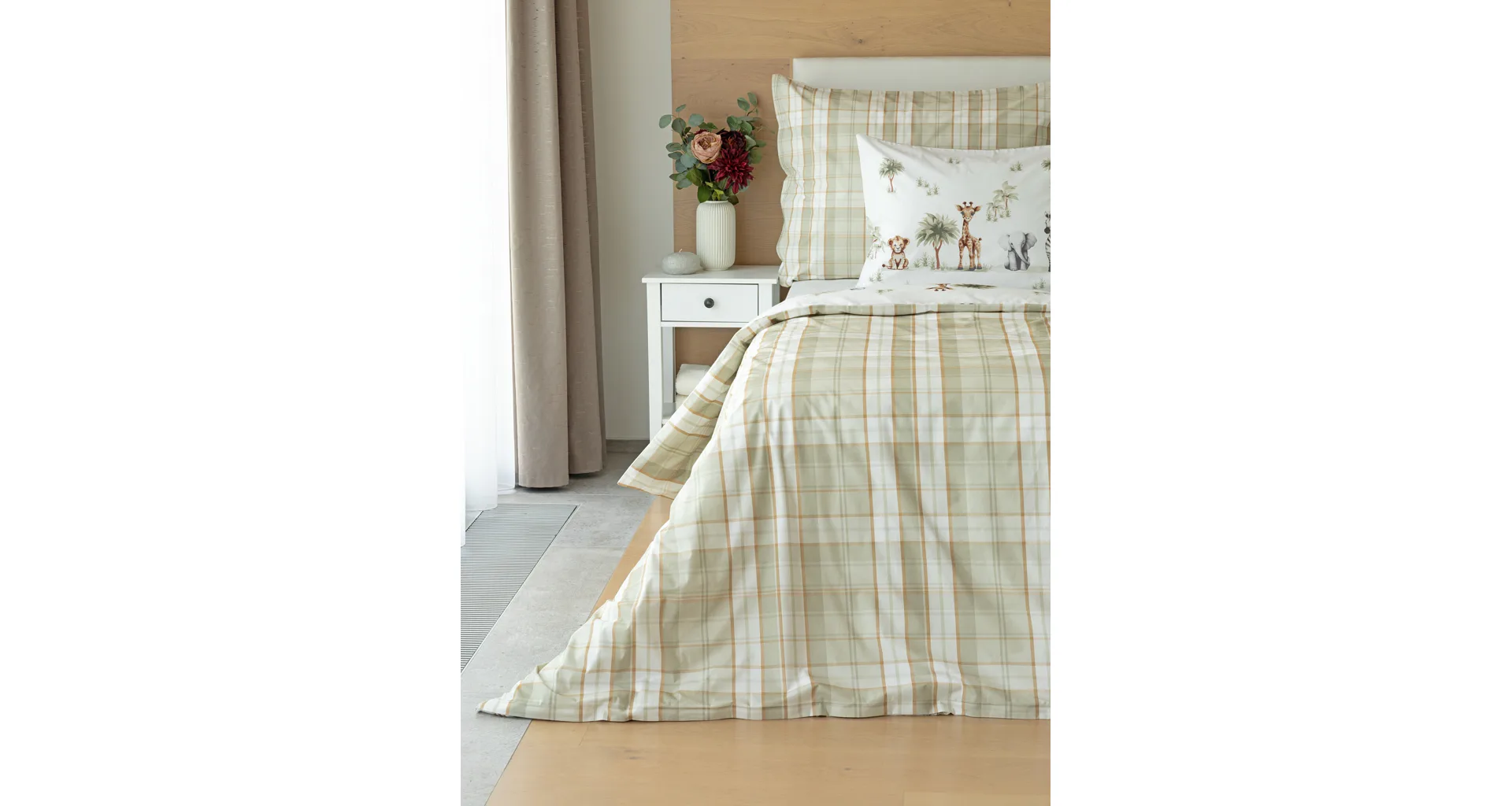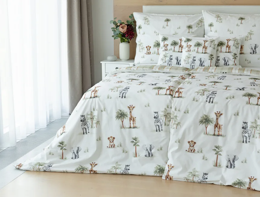 Povlak na vankúš aj na prikrývku zachytáva na vrchnej strane motív zvieratiek, spodnú stranu tvorí jemné zelenohnedé káro. Obliečky sú vyrobené zo 100% bavlny a sú opatrené praktickým zipsovým uzáverom.