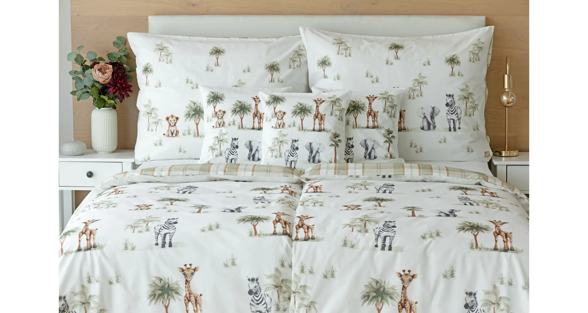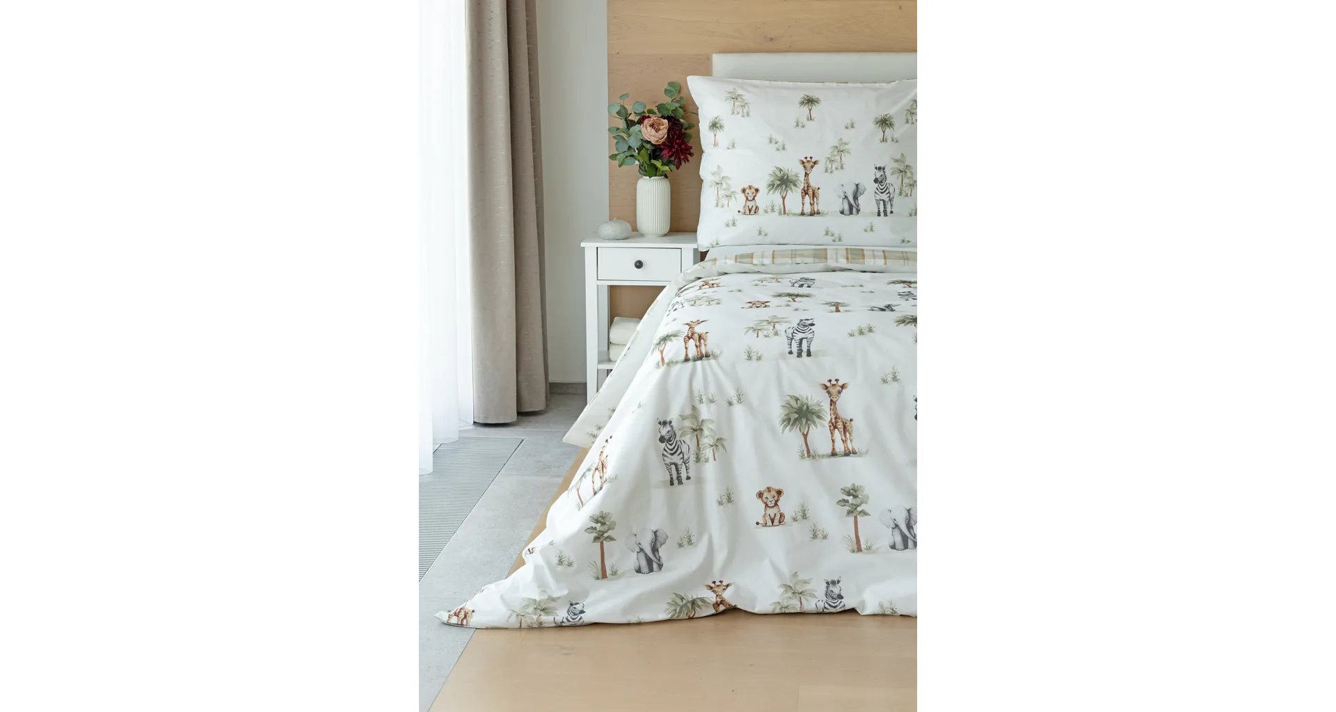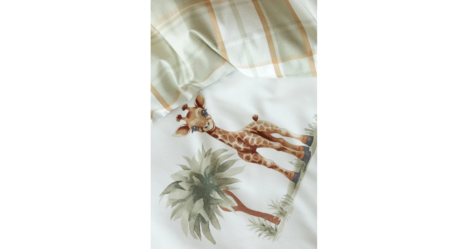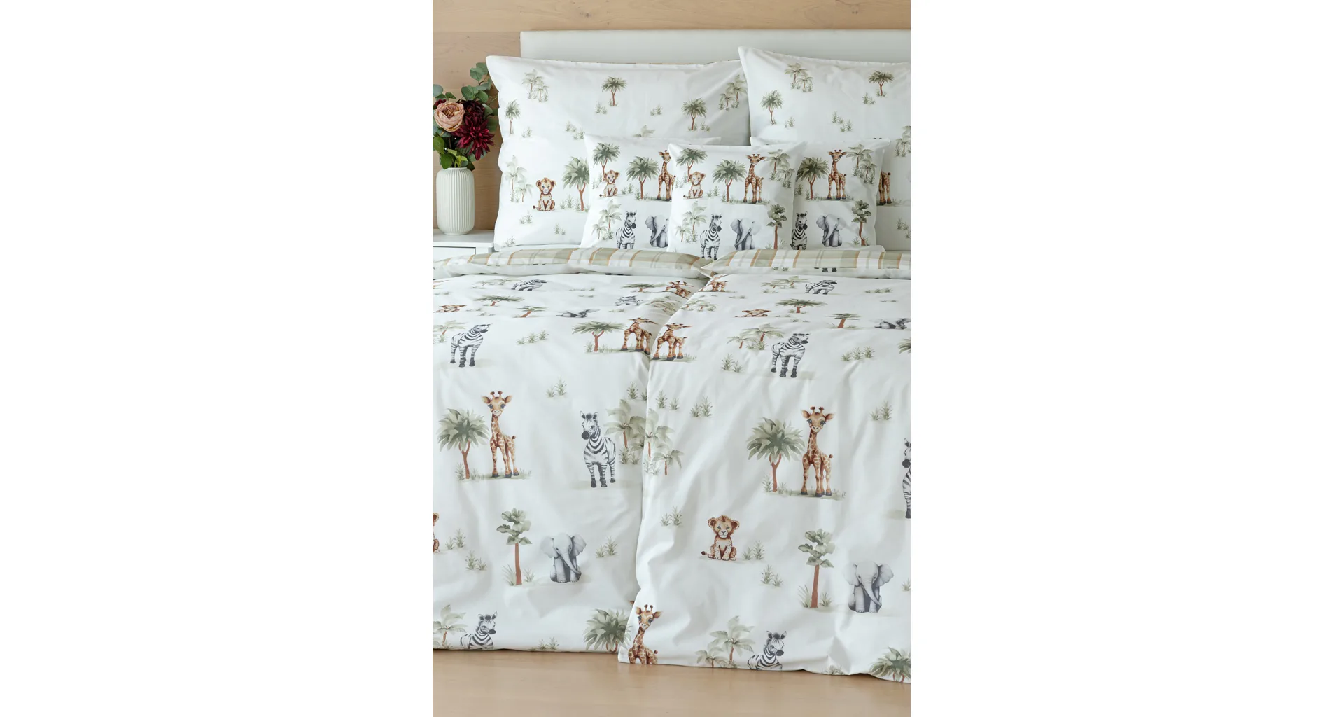 Povlak na vankúš aj na prikrývku zachytáva na vrchnej strane motív zvieratiek, spodnú stranu tvorí jemné zelenohnedé káro. Obliečky sú vyrobené zo 100% bavlny a sú opatrené praktickým zipsovým uzáverom.