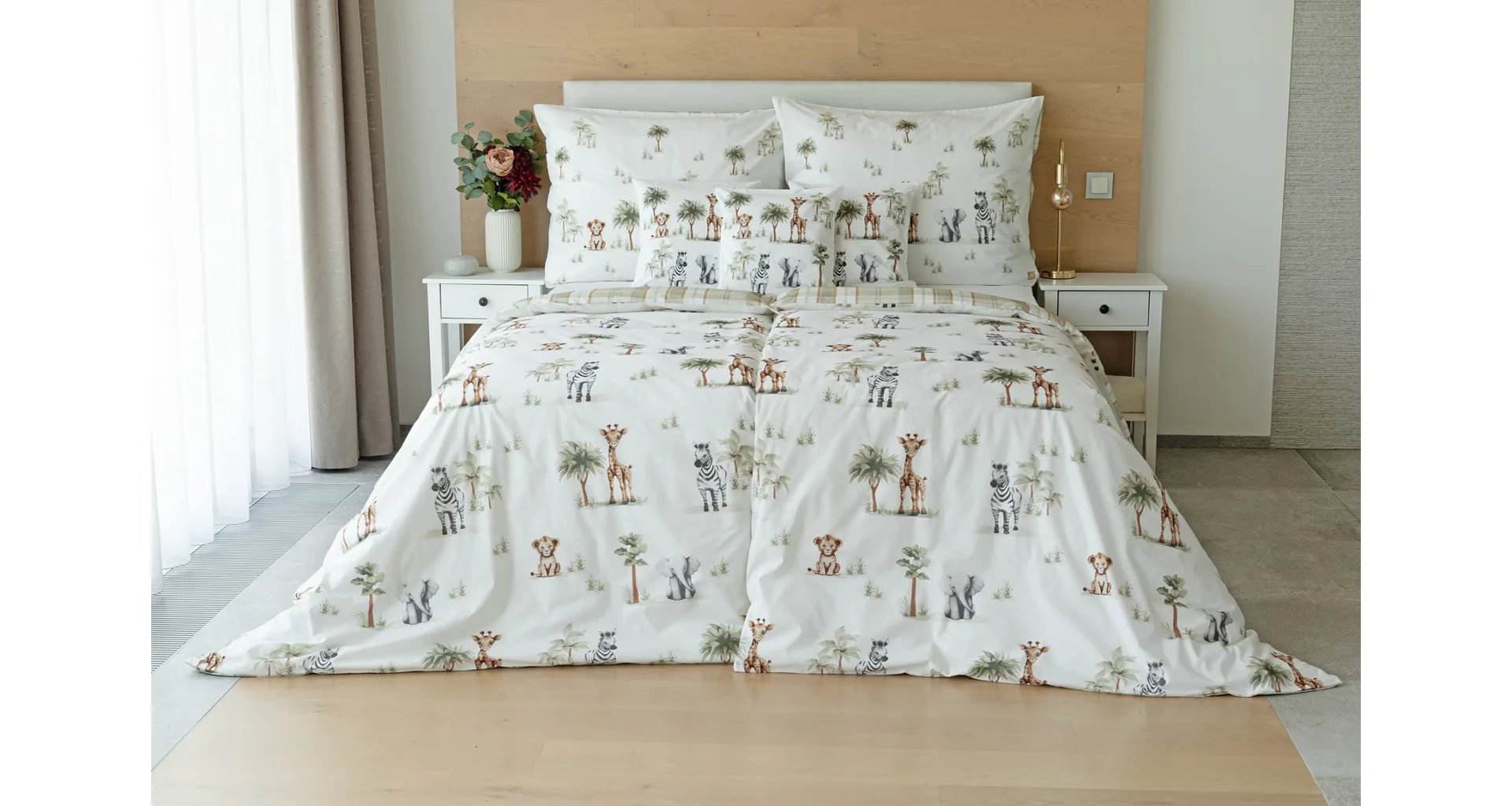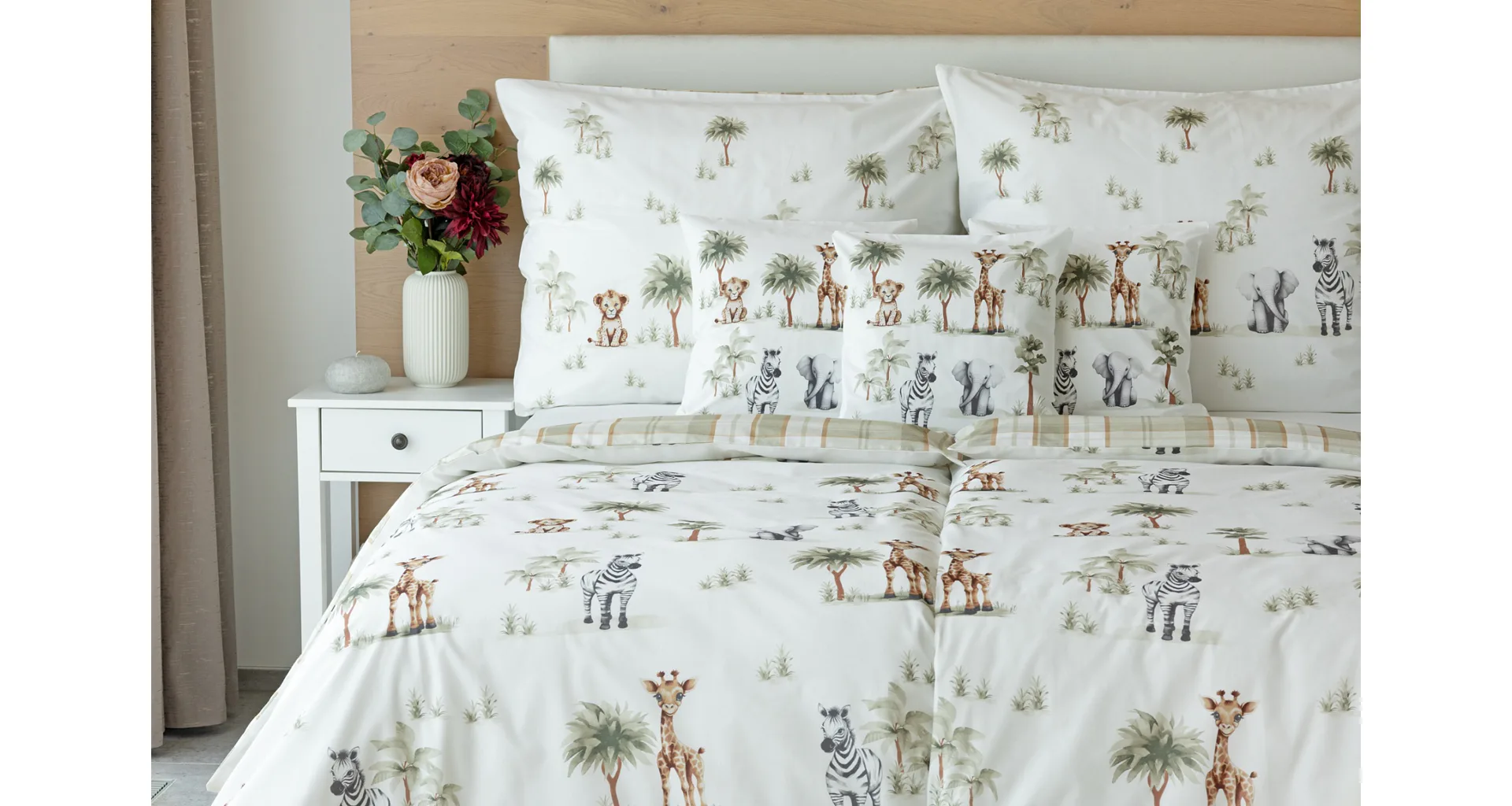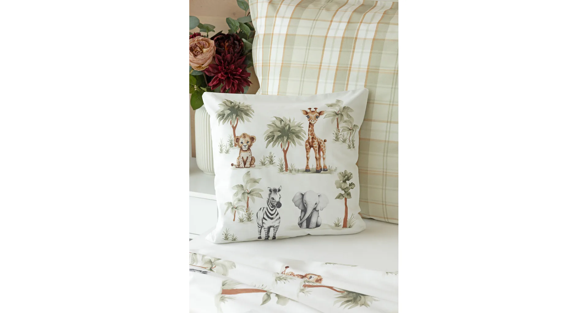 Povlak na vankúš aj na prikrývku zachytáva na vrchnej strane motív zvieratiek, spodnú stranu tvorí jemné zelenohnedé káro. Obliečky sú vyrobené zo 100% bavlny a sú opatrené praktickým zipsovým uzáverom.