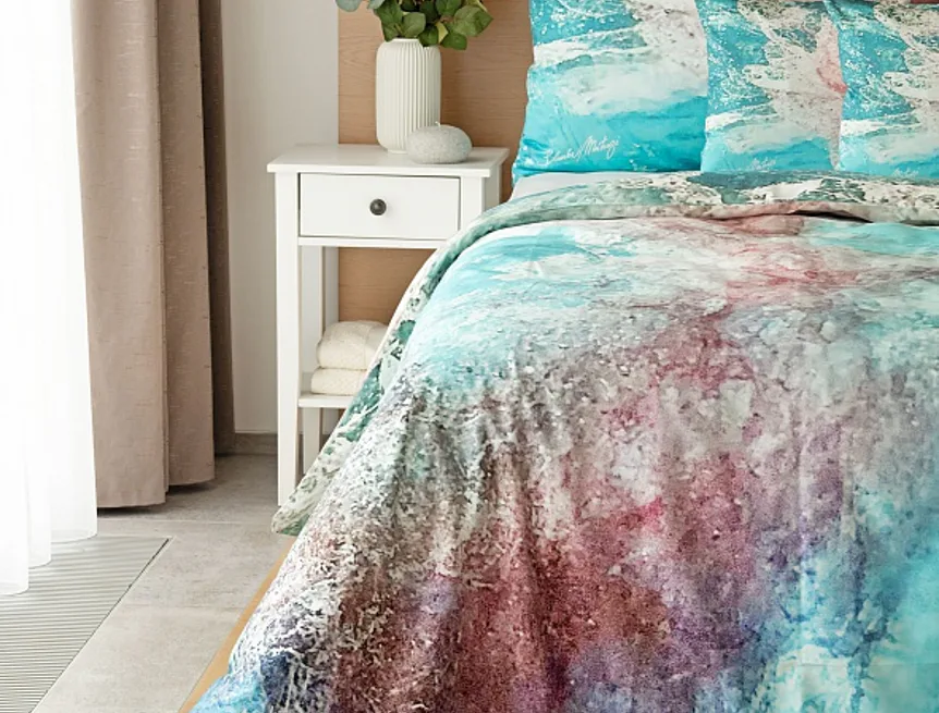 Nechajte sa zlákať k zaslúženému odpočinku s posteľnými obliečkami Hlbina. Dominantná tyrkysová farba vytvára spolu s fialovo-vínovými tónmi pútavý vzor, ktorý vnesie do vašej spálne nádych sviežosti. Žiarivé farby a prepracované detaily robia z luxusných obliečok osobité umelecké dielo.