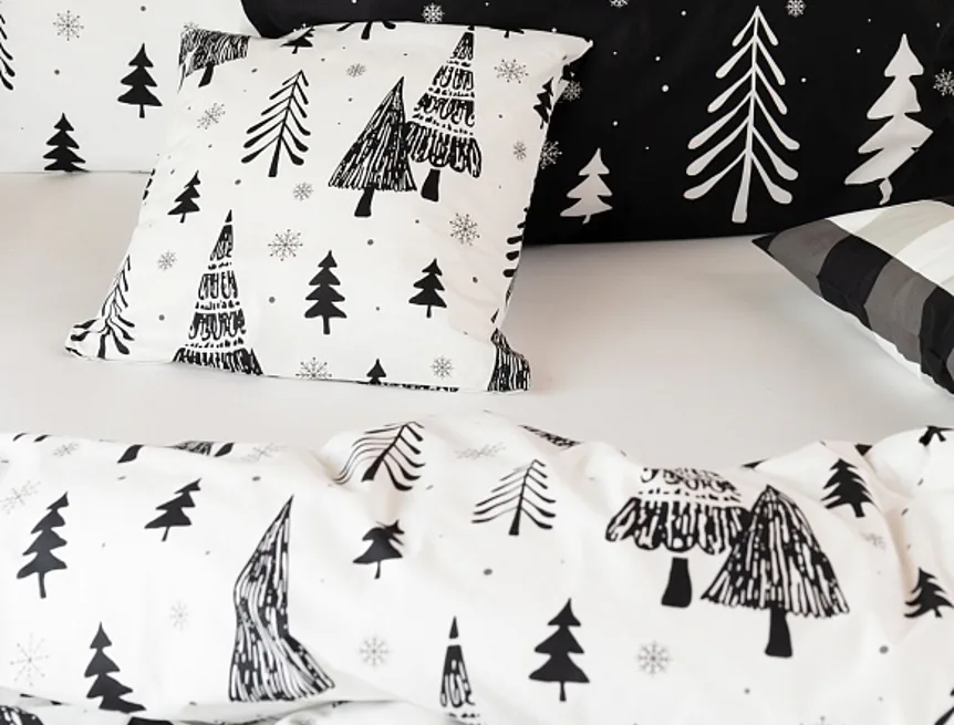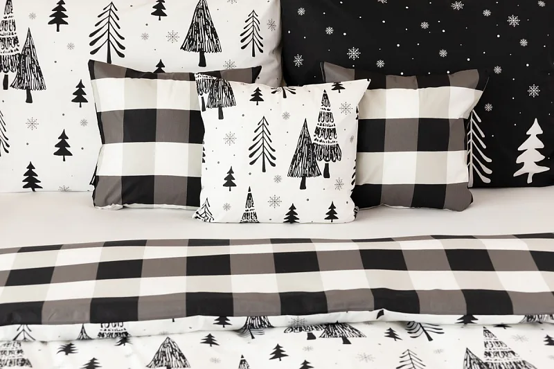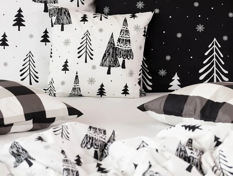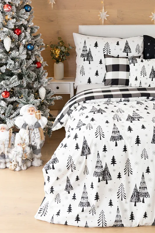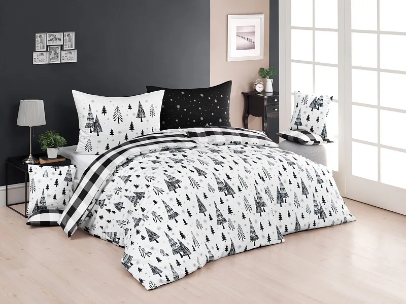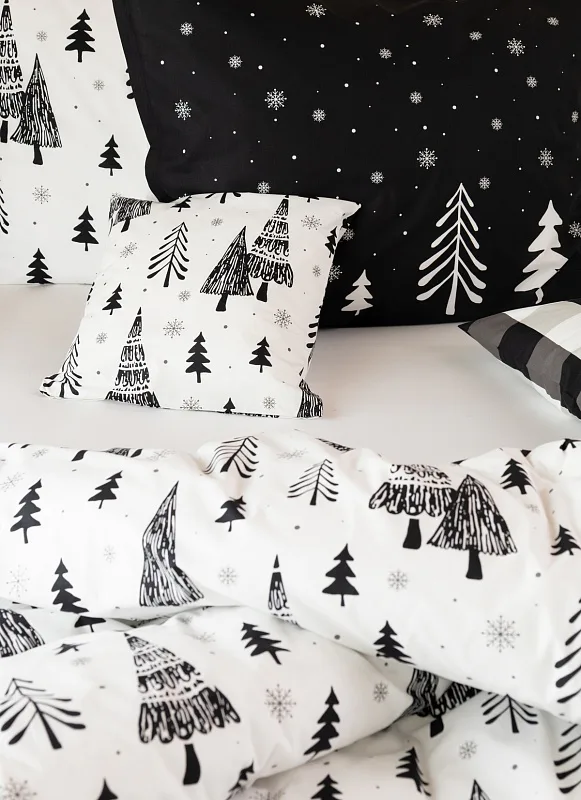 Obliečka na prikrývku je z jednej strany posiata kresbou menších a väčších stromčekov, snehových vločiek a drobných bodiek. Spodná strana prikrývky je tvorená bielou, šedou a čiernou kockou, ako je čiastočne zobrazené na fotografii. Obliečka na vankúš je z každej strany iná - zadná strana s čiernym podkladom zachytáva biele snehové vločky a radu stromčekov na spodnej strane. Obliečky sú opatrené komfortným ziposovým uzáverom.