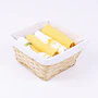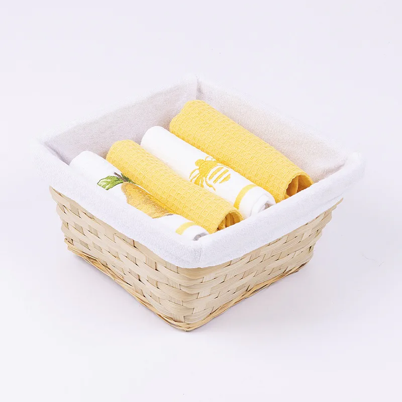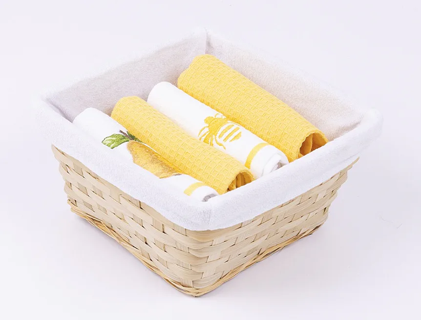 Prútený košík s textilnou vsadkou je spolu s utierkami zabelný v celofáne a doplnený ozdobnou mašlou.