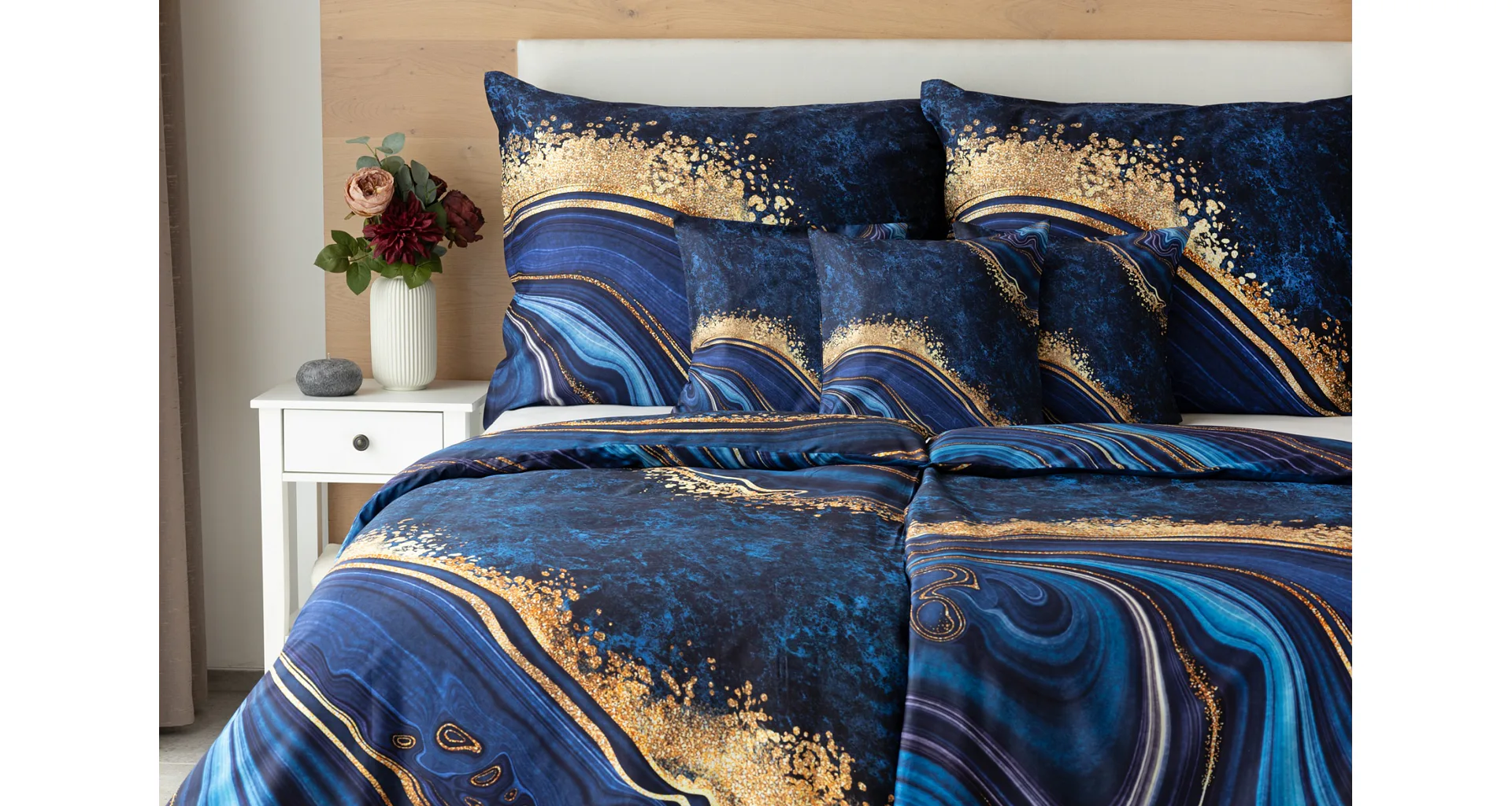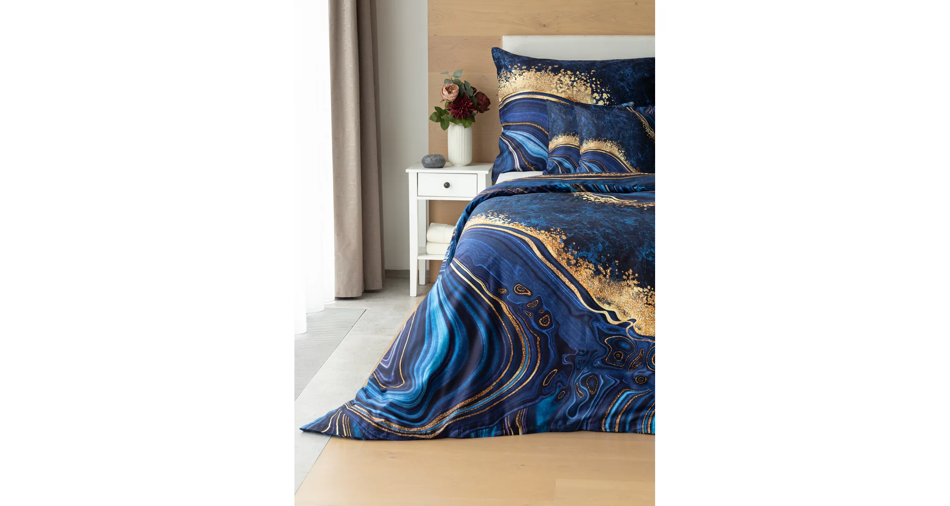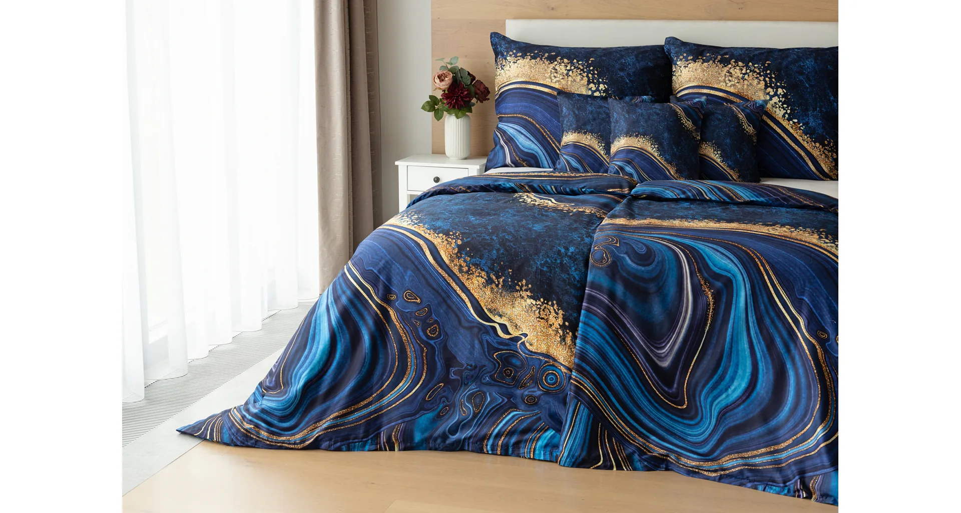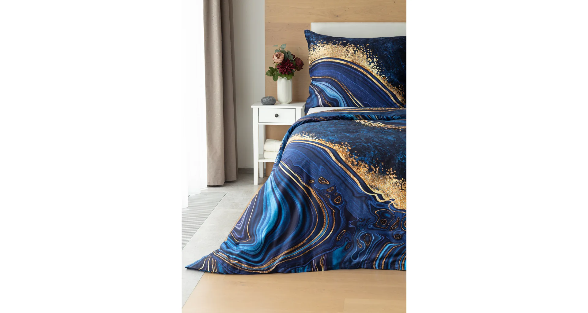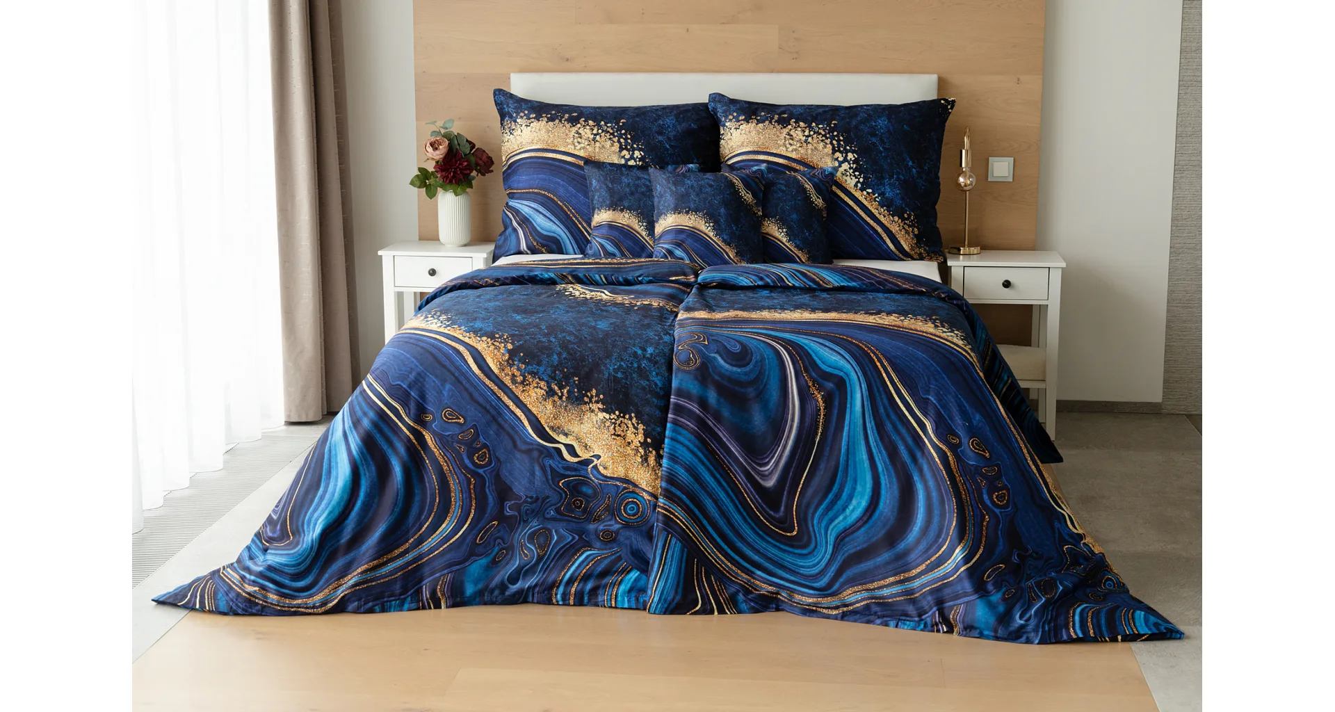 Posteľné obliečky Iris si jednoducho zamilujete. Abstraktnému vzoru dominujú odtiene modrej farby, ktorá pôsobí na ľudskú myseľ kľudne a harmonicky. Prináša atmosféru stability a tradície. K modrej farbe sa hodí kombinácia so zlatou, vďaka ktorej získava noblesný nádych. A presne tieto odtiene farieb má vzor obliečok Iris, ktorých eleganciu podtrháva hebký bavlnený satén vyrobený zo 100% bavlny.