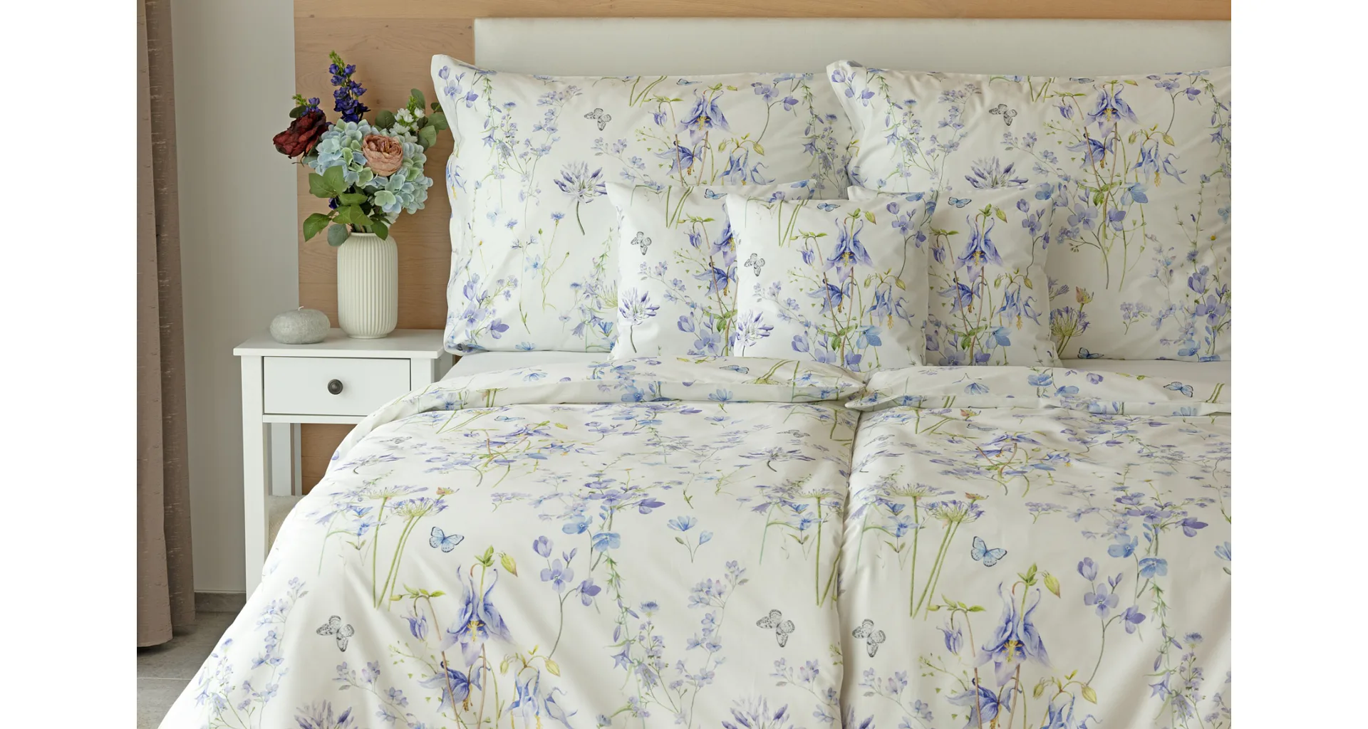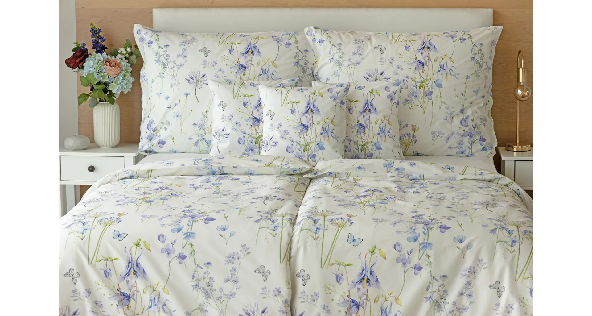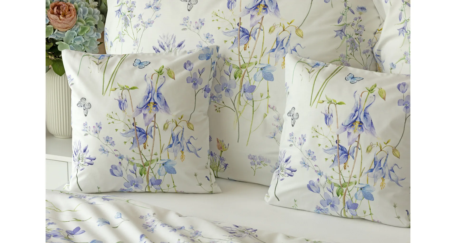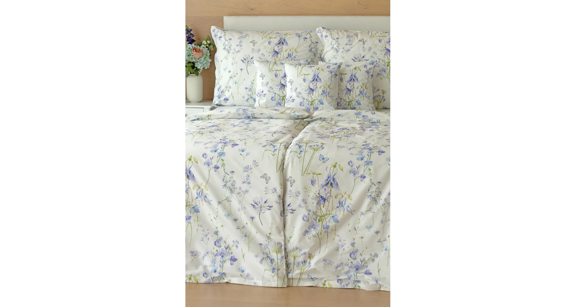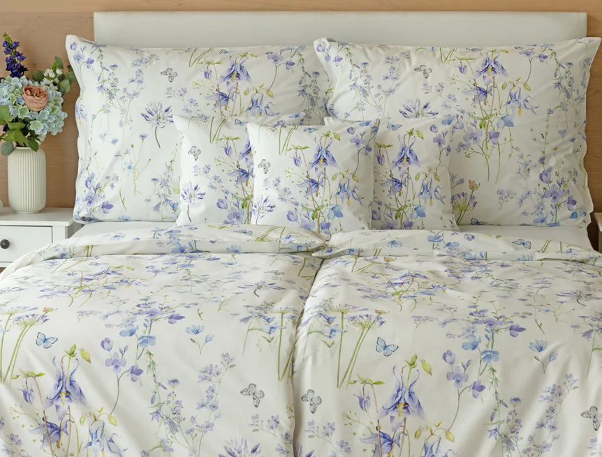 Zvončeky, fialky, nevädze, sedmokrásky a mnoho ďalších lúčnych kvetov zdobí bavlnené posteľné obliečky Isabelle. Kvietky v prevažujúcich modrofialových tónoch sa prelínajú na krémovo bielom podklade a nechýbajú samozrejme ani drobné motýle. Nechajte svoju spálňu rozkvitnúť! Vďaka najmodernejšej tlači vyniká vzor v precíznom detaile.