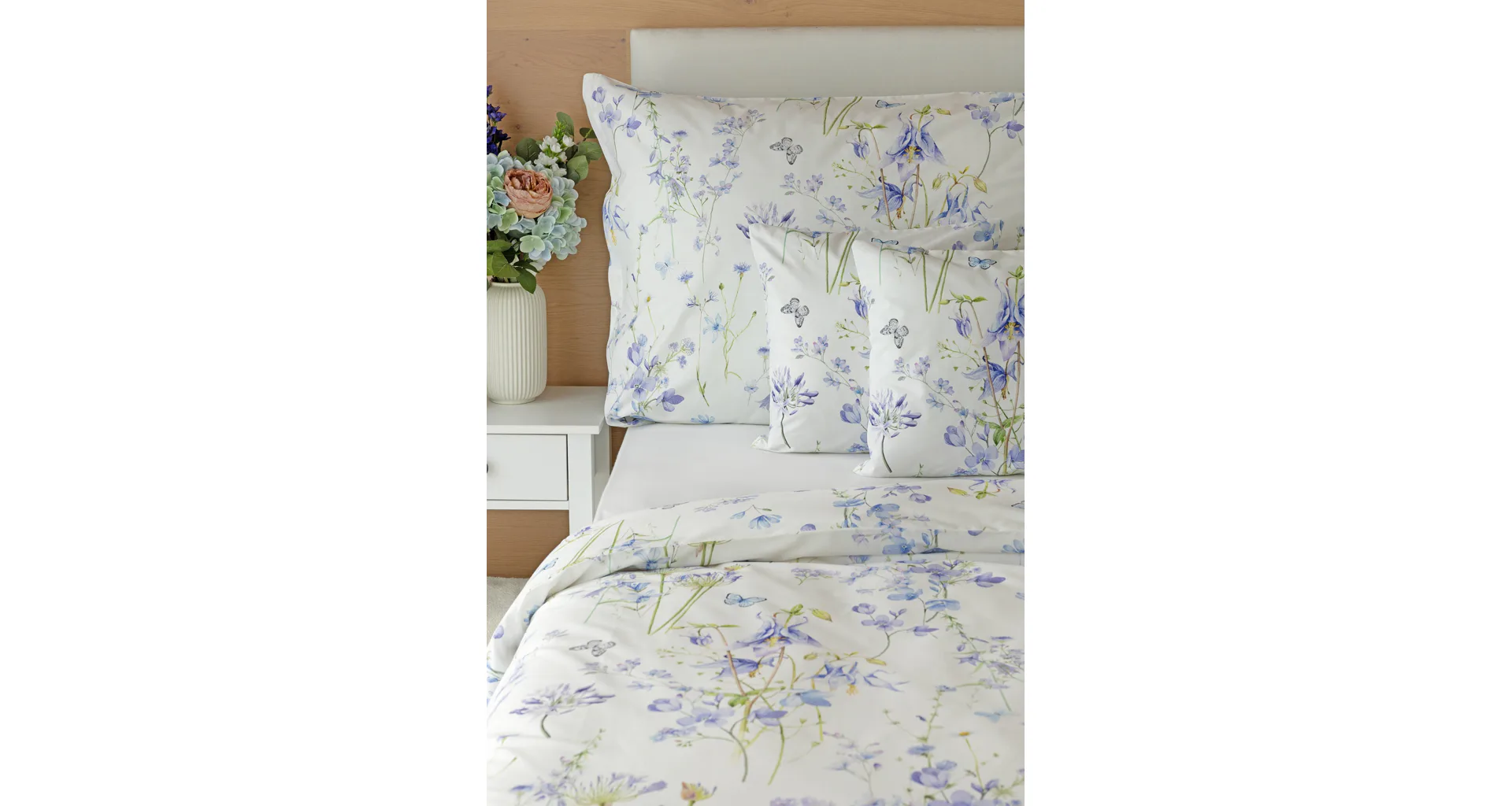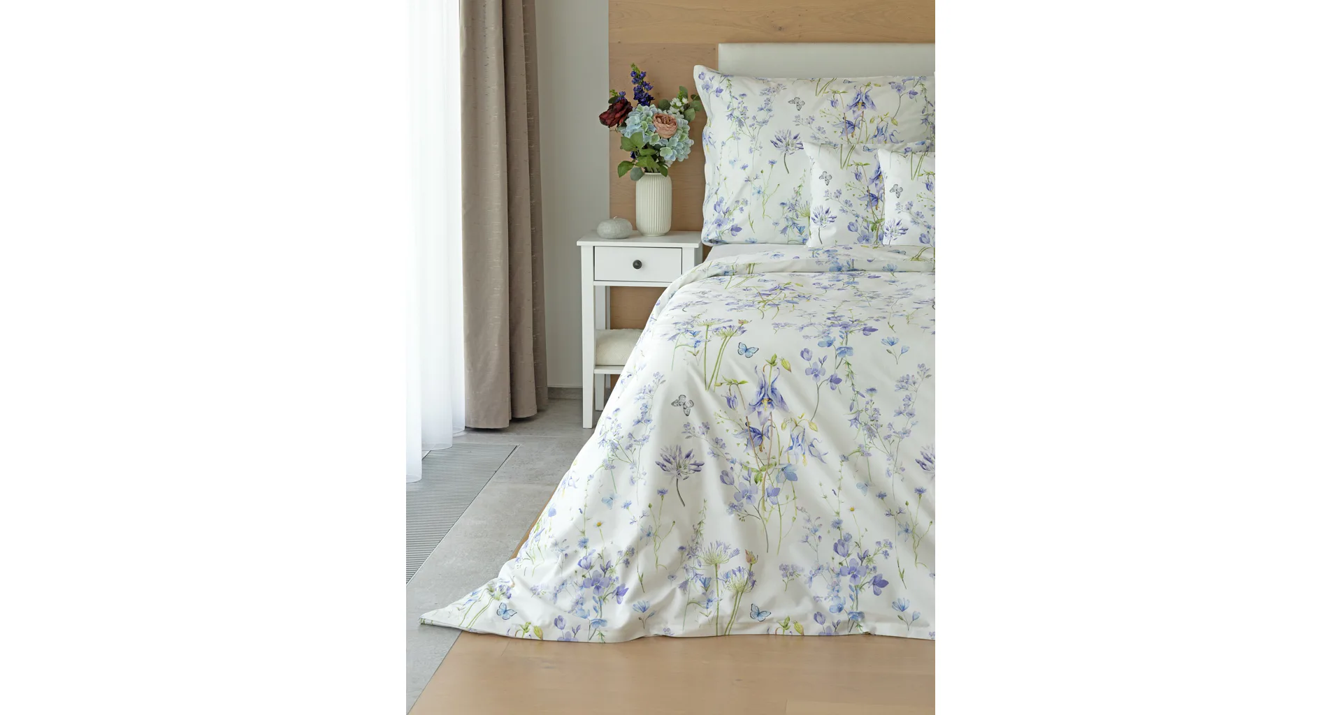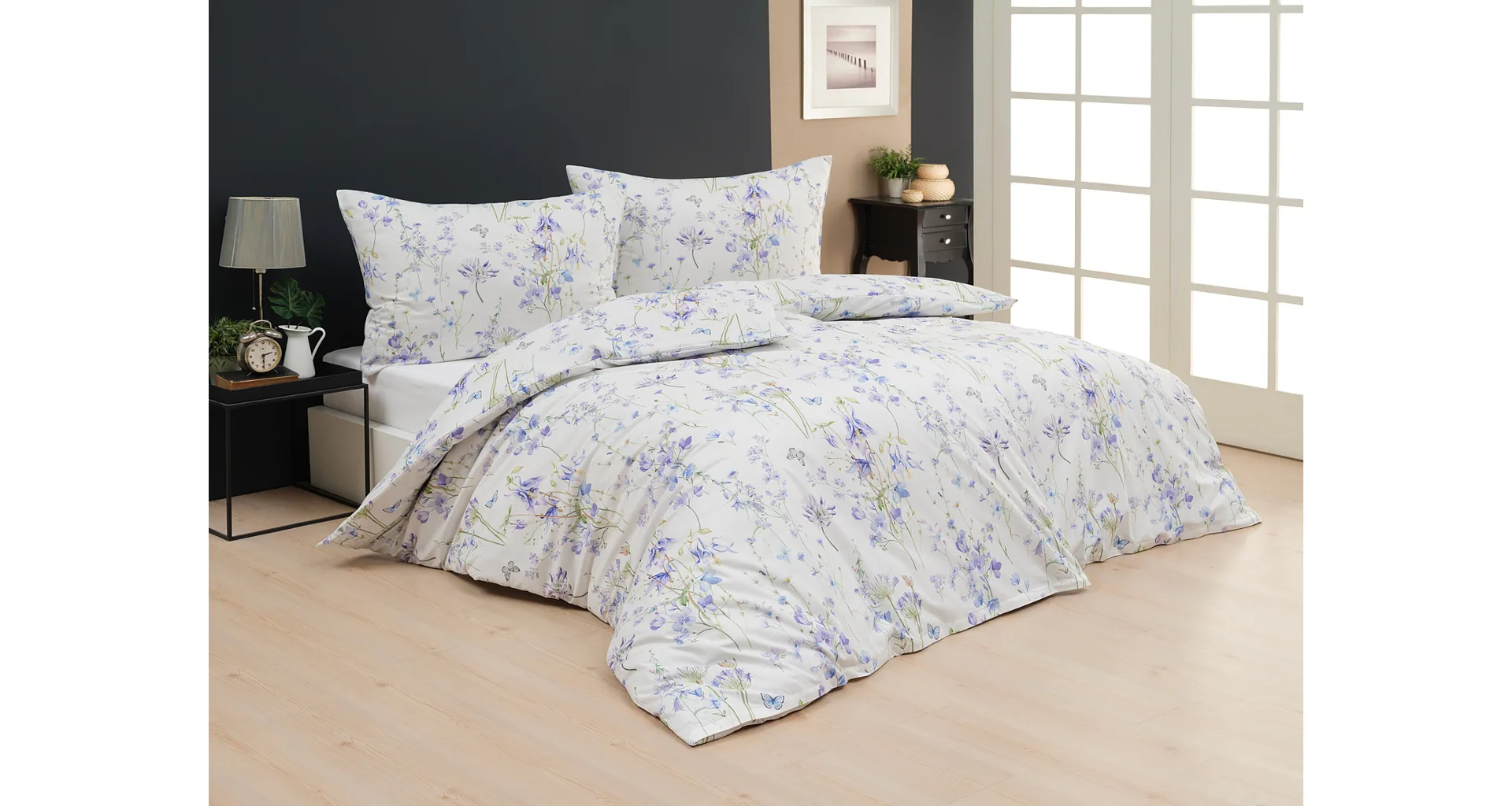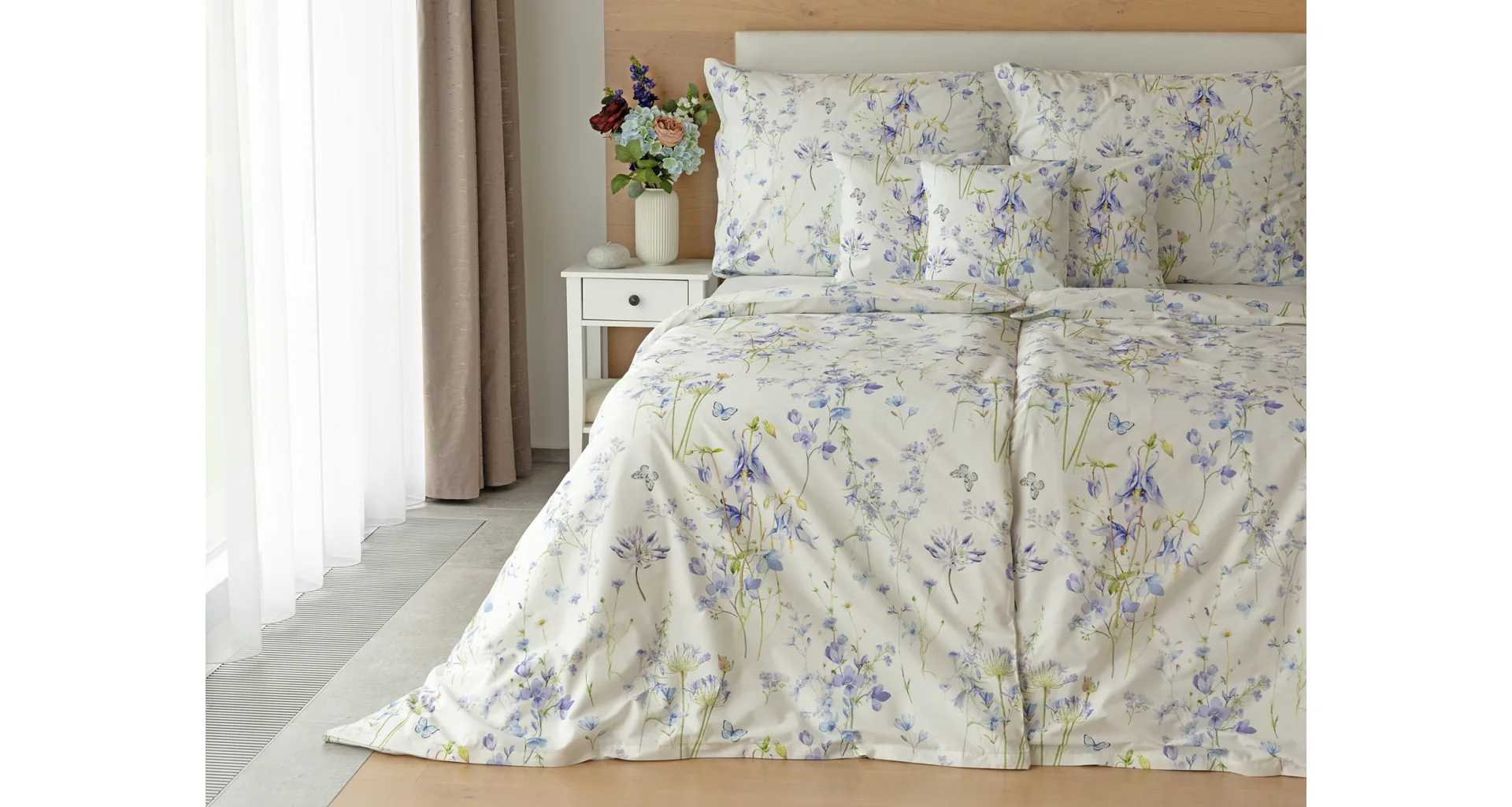 Zvončeky, fialky, nevädze, sedmokrásky a mnoho ďalších lúčnych kvetov zdobí bavlnené posteľné obliečky Isabelle. Kvietky v prevažujúcich modrofialových tónoch sa prelínajú na krémovo bielom podklade a nechýbajú samozrejme ani drobné motýle. Nechajte svoju spálňu rozkvitnúť! Vďaka najmodernejšej tlači vyniká vzor v precíznom detaile.