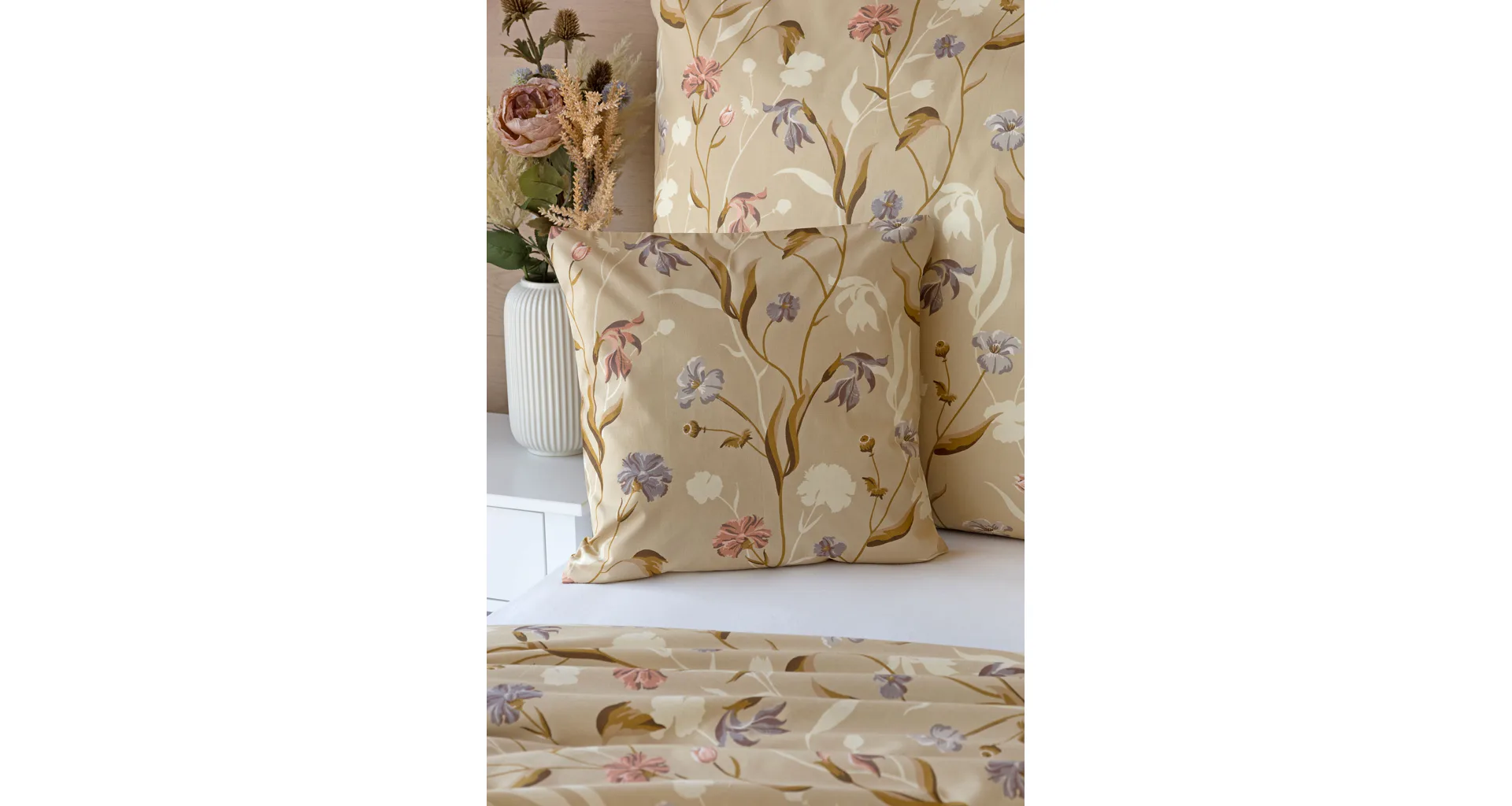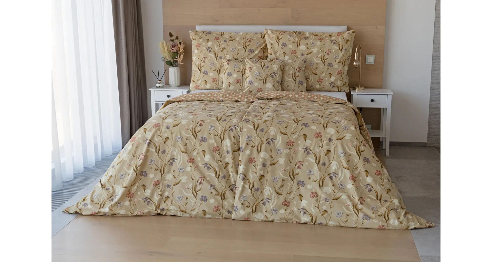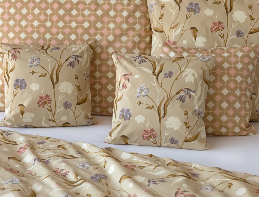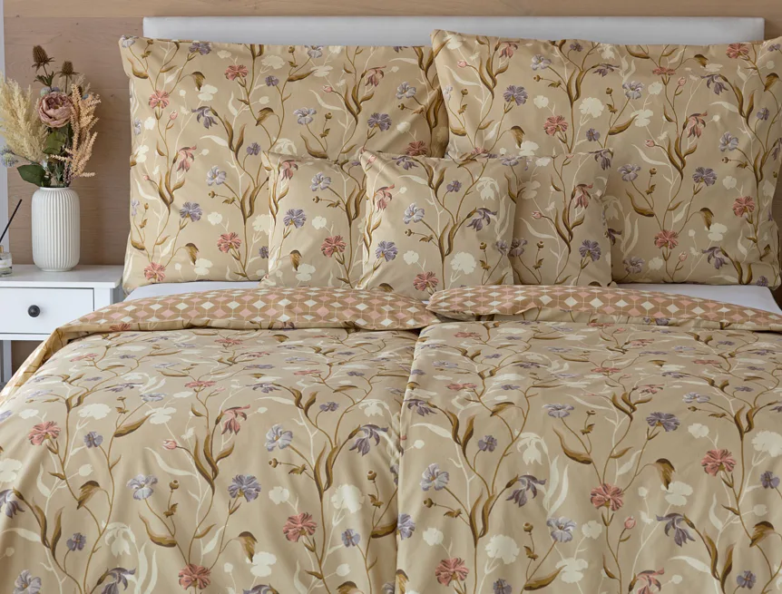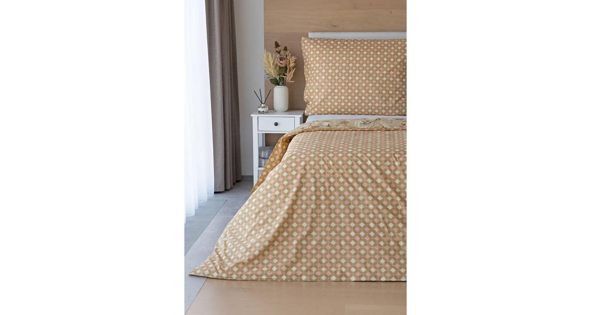 Bavlnené obliečky Joanna vas okúzlia hrejivými farbami a napaditou kombinaciou vzorov. Kvetinový motív z jednej strany tvorí drobné staroružové a fialovo-modré kvety na svetlohnedom podklade. Druhú stranu obliečok zdobí plošný geometrický vzor, takže pri stlaní môžete hravo improvizovať.