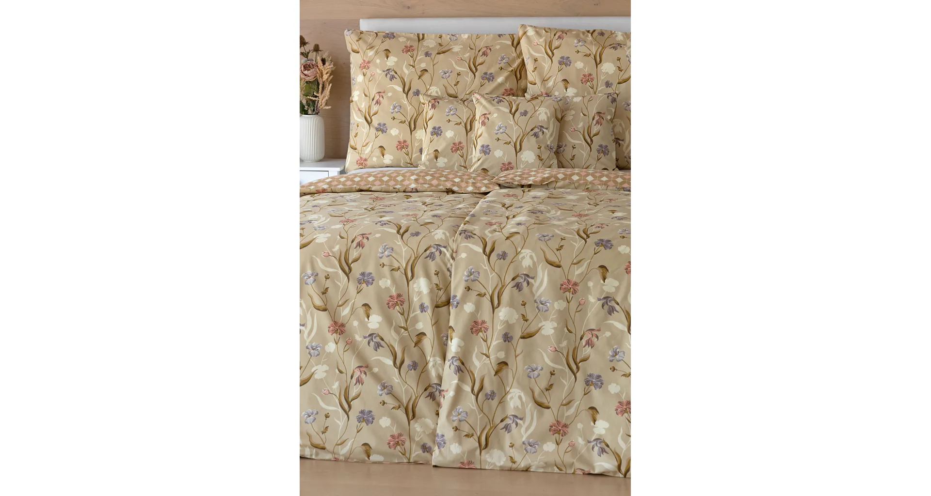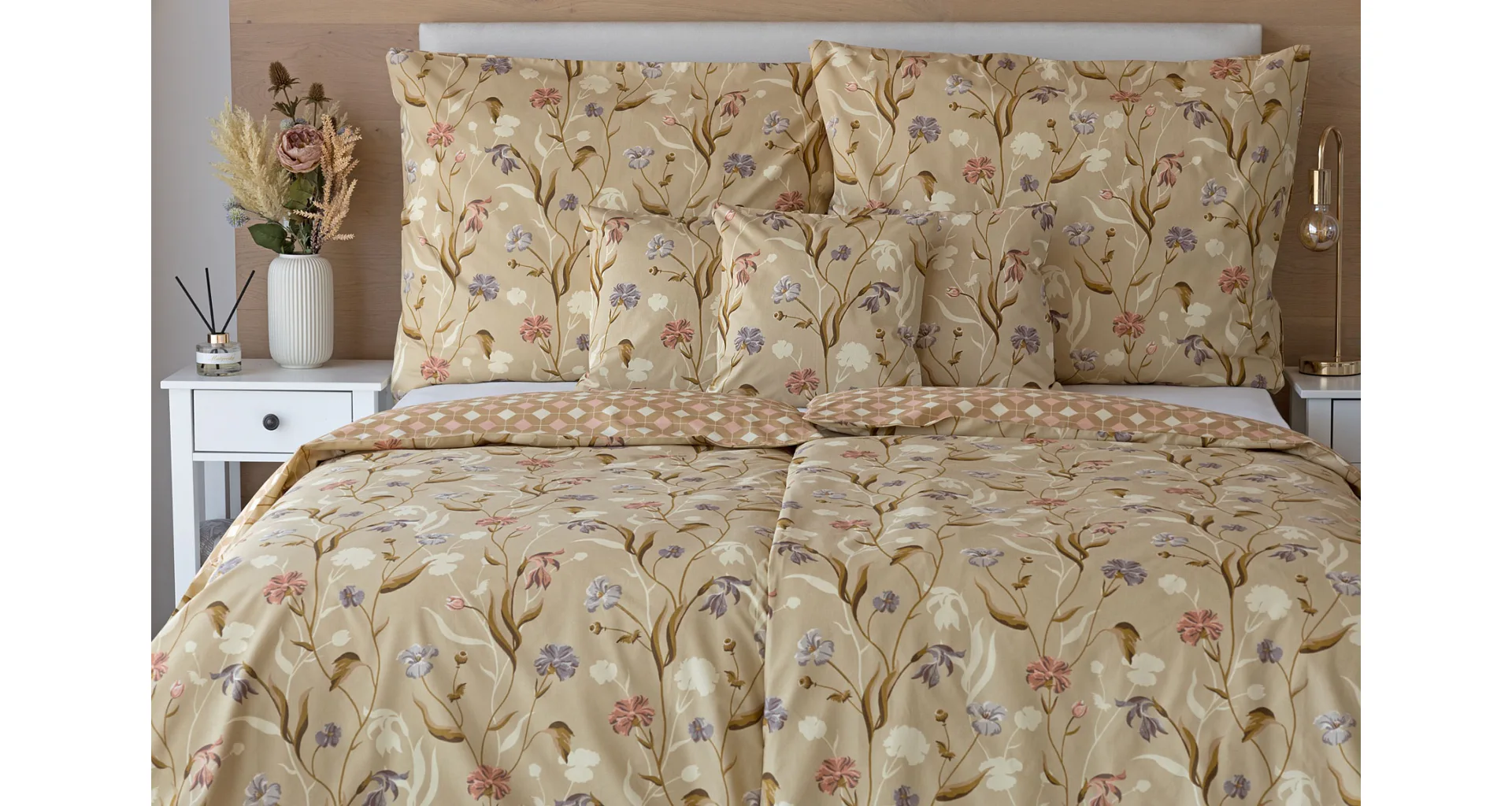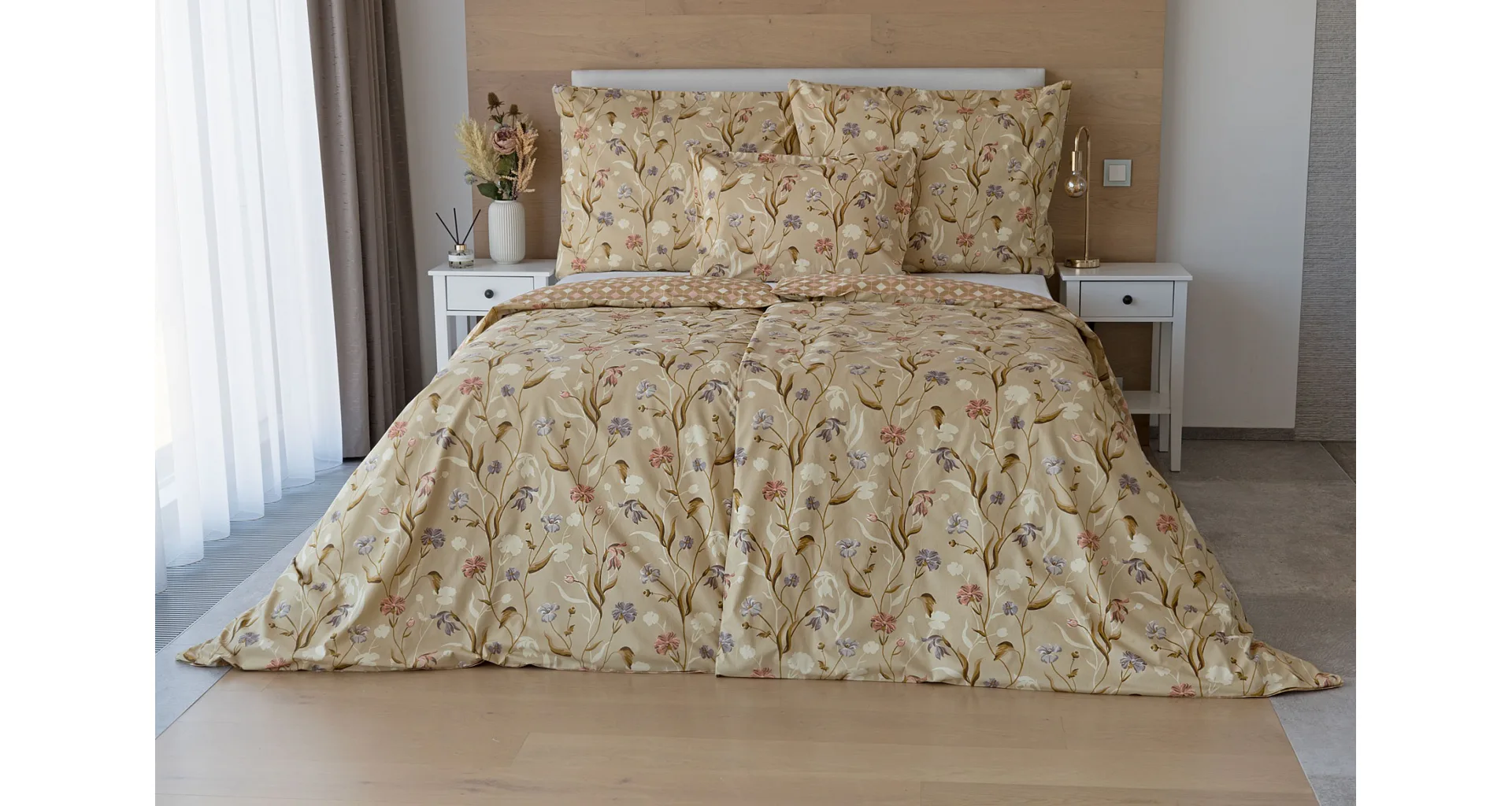 Bavlnené obliečky Joanna vas okúzlia hrejivými farbami a napaditou kombinaciou vzorov. Kvetinový motív z jednej strany tvorí drobné staroružové a fialovo-modré kvety na svetlohnedom podklade. Druhú stranu obliečok zdobí plošný geometrický vzor, takže pri stlaní môžete hravo improvizovať.