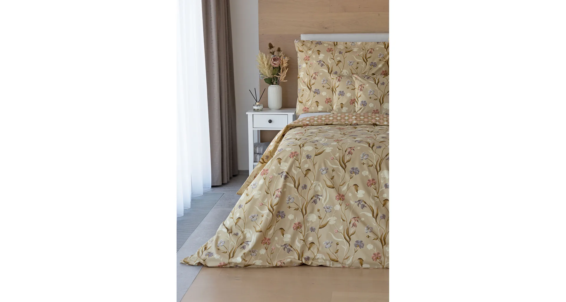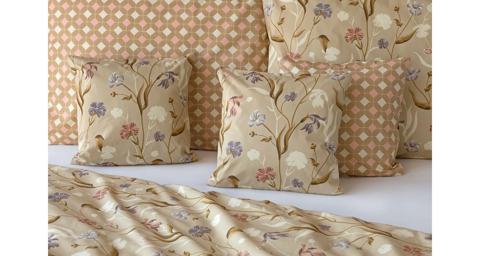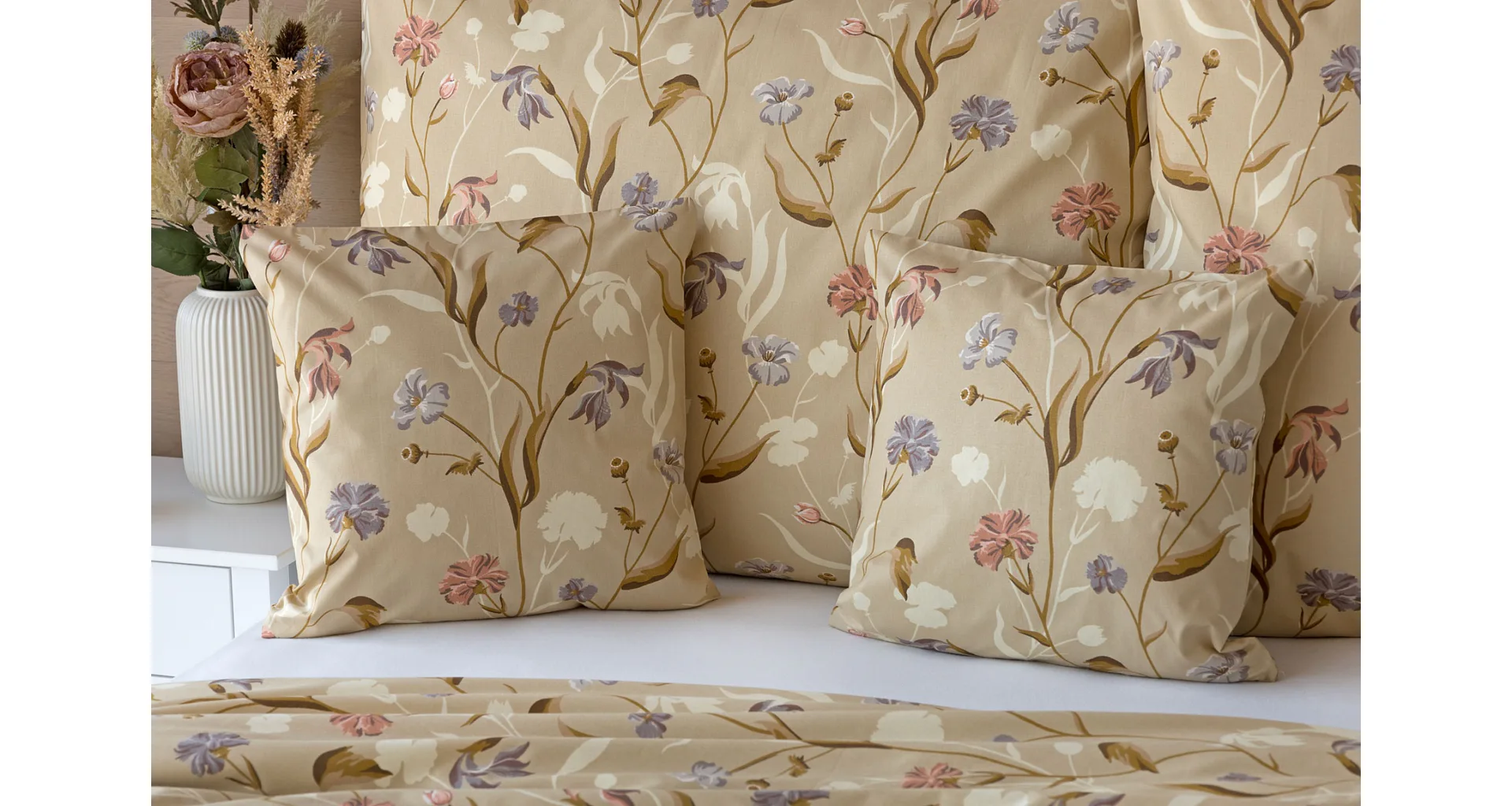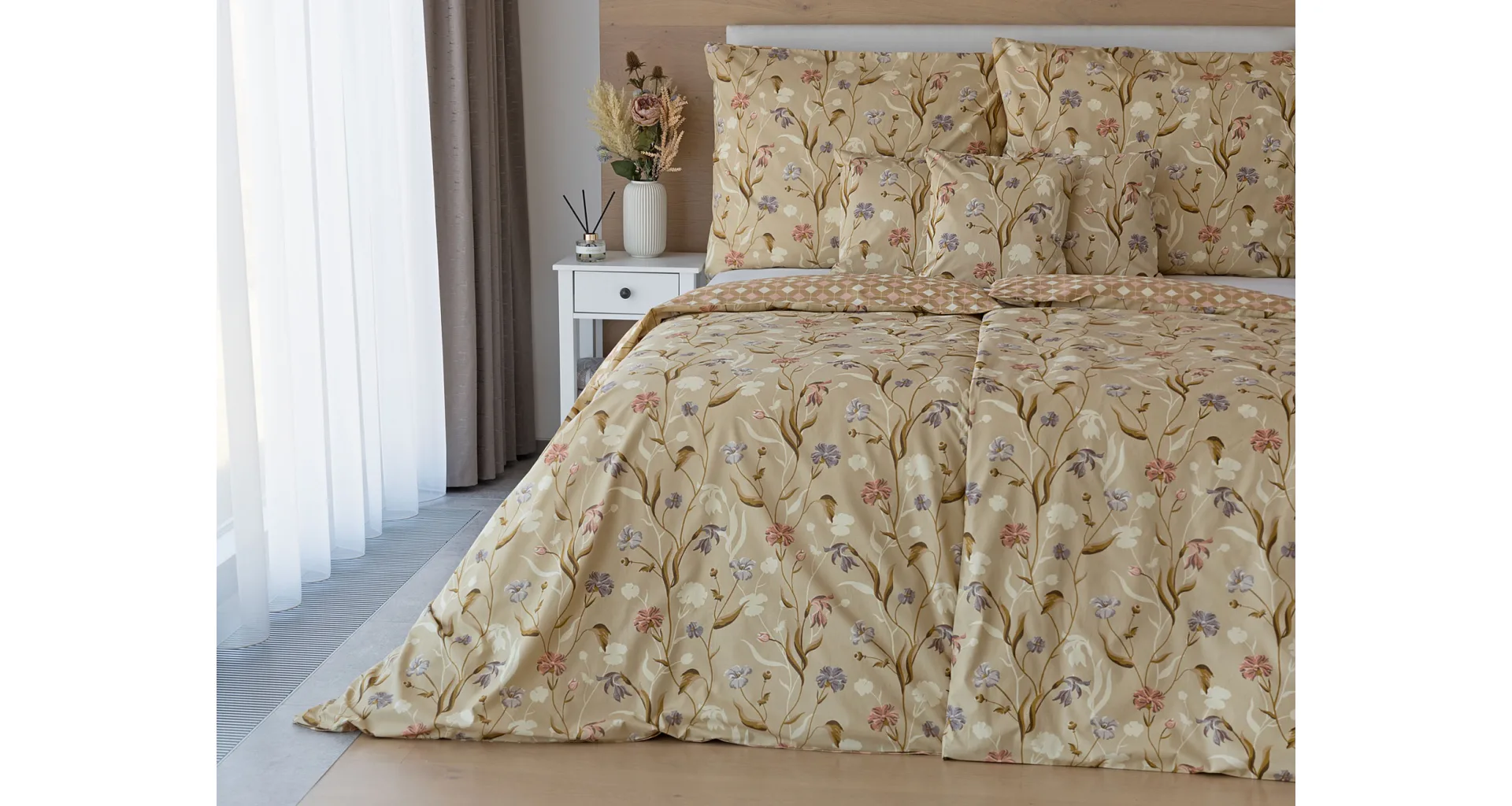 Bavlnené obliečky Joanna vas okúzlia hrejivými farbami a napaditou kombinaciou vzorov. Kvetinový motív z jednej strany tvorí drobné staroružové a fialovo-modré kvety na svetlohnedom podklade. Druhú stranu obliečok zdobí plošný geometrický vzor, takže pri stlaní môžete hravo improvizovať.