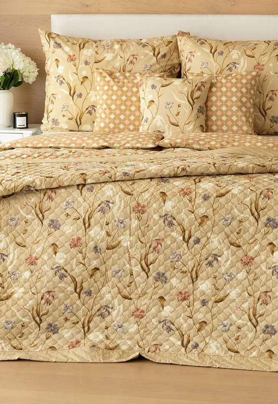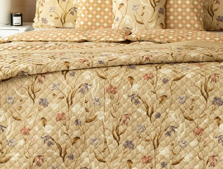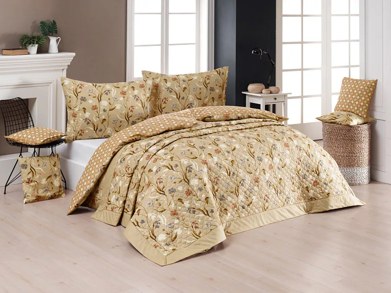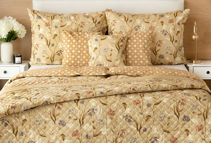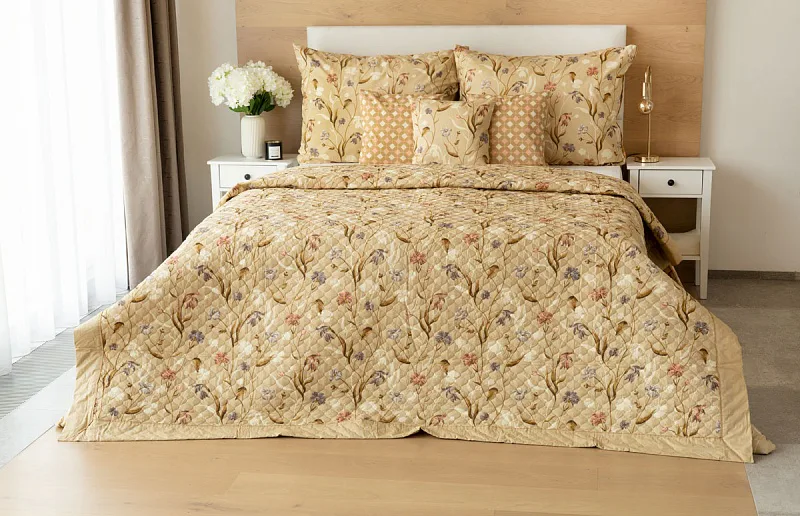 Prehoz Joanna je jedinečný estetický a praktický doplnok, s ktorým bude vaša posteľ vždy dokonale ustlaná. Ako výplň je použité vrstvené duté vlákno so zníženou gramážou. Povrchový materiál tvorí 100% bavlnená látka v rovnakom dezéne ako posteľné obliečky. Po celej ploche je aplikované ozdobné prešitie, aby sa zaistila stabilita výplne a súčasne sa podtrhol celkový vzhľad.