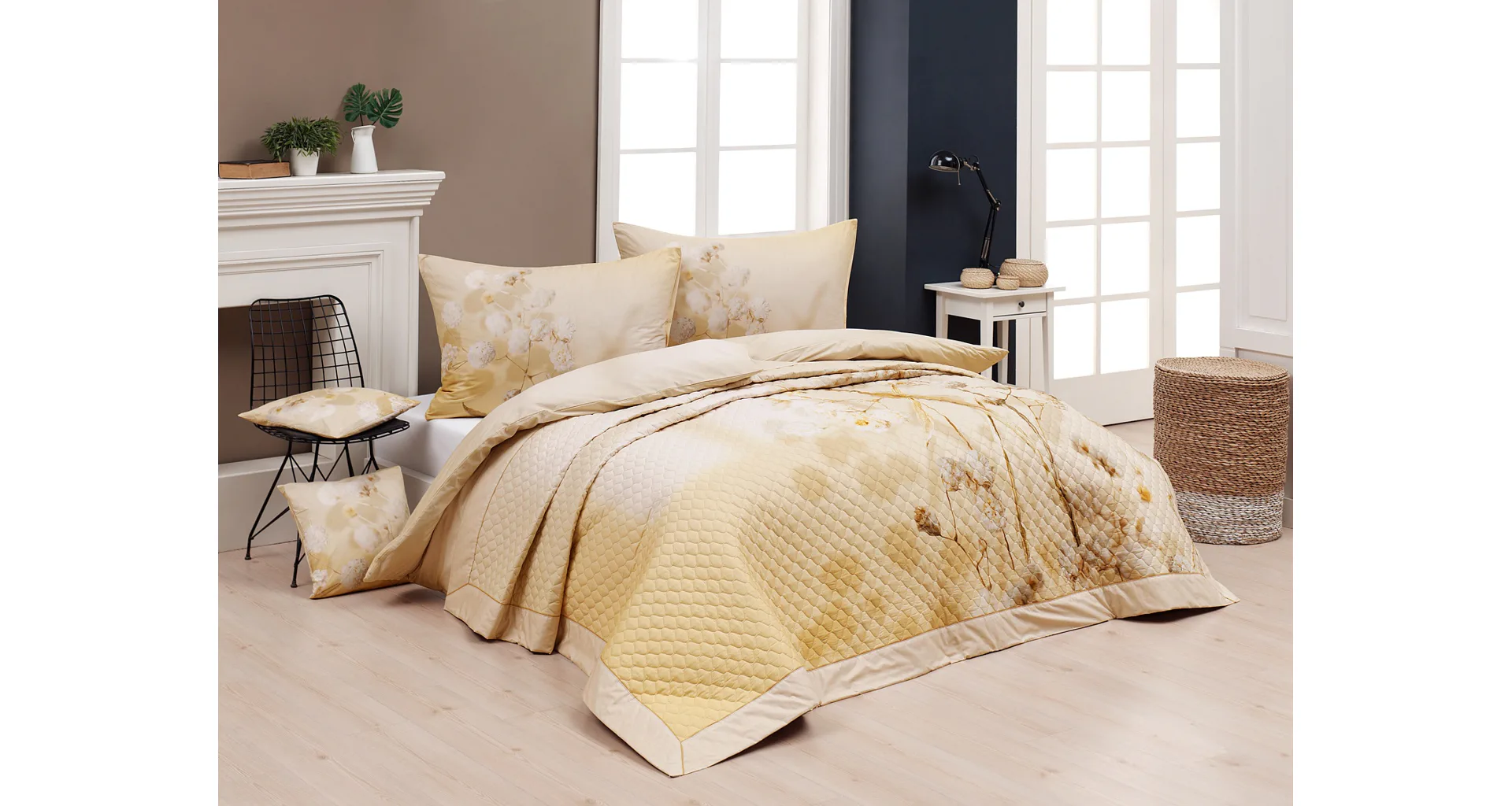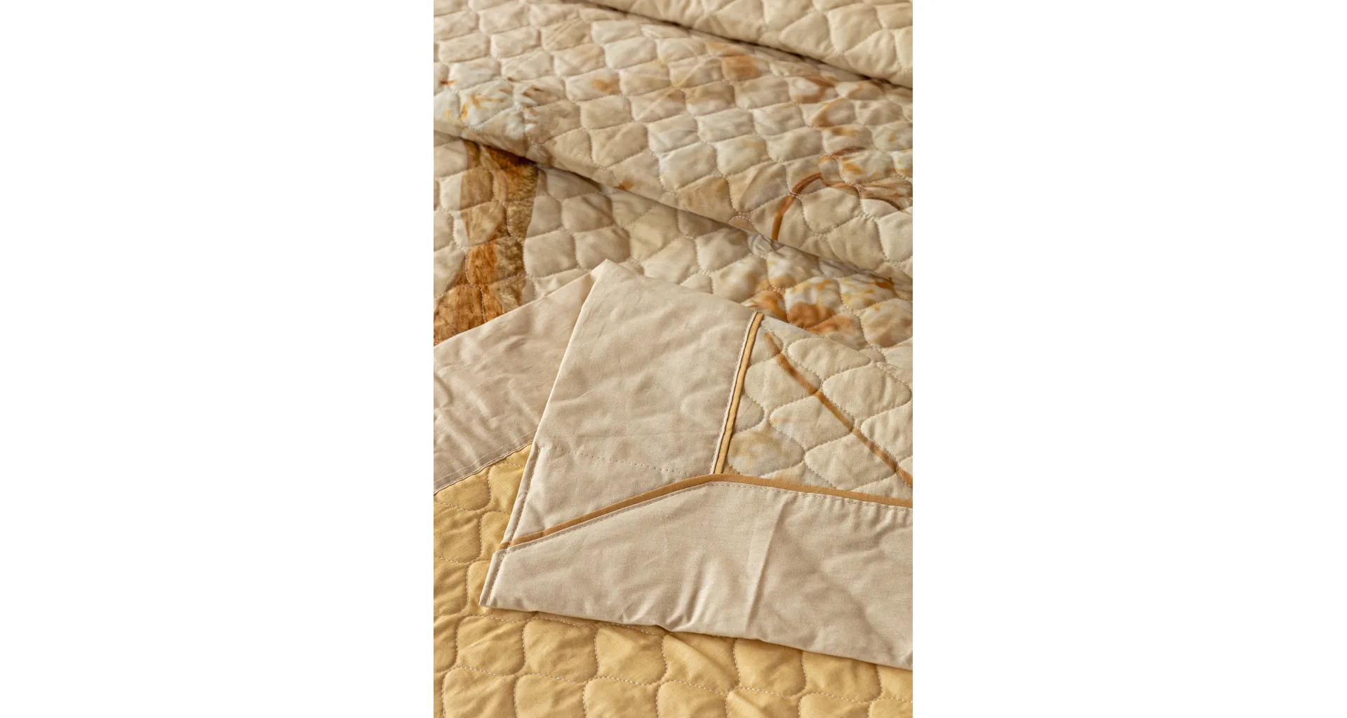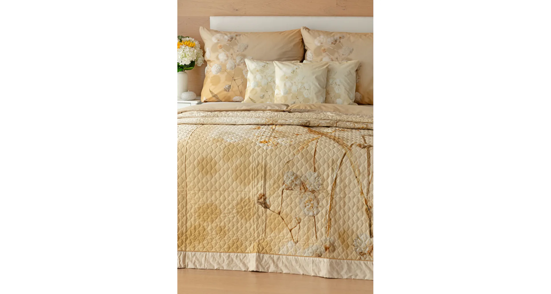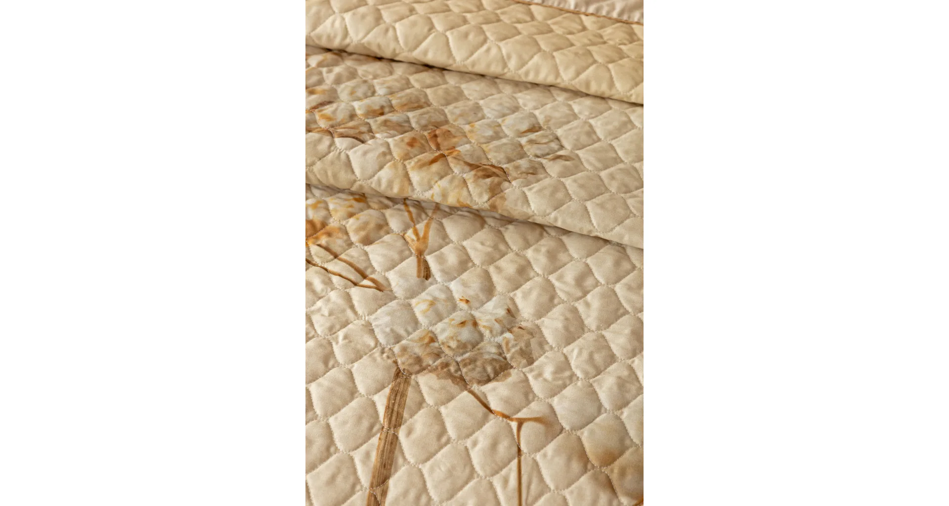 Farebné prevedenie: Jemný kvetinový vzor, ktorý je z oboch strán prehozu rovnaký. Okraje zdobí farebne zladené krémové lemovanie doplnené na vrchnej strane svetlo hnedou paspulou.