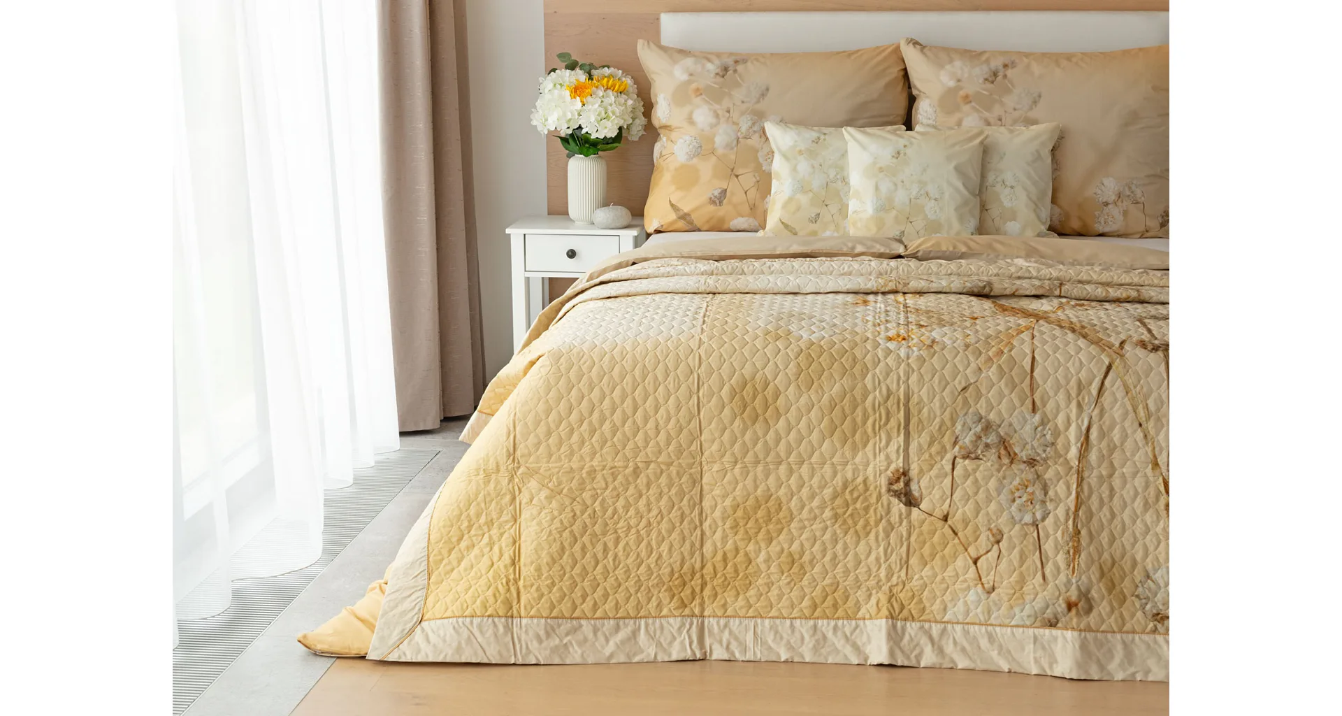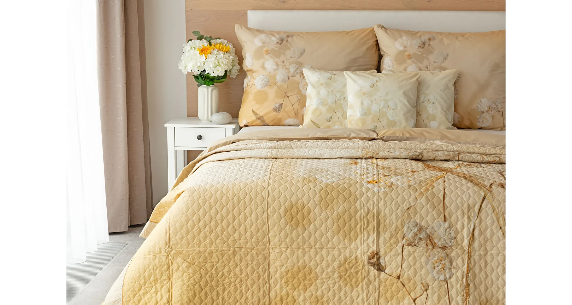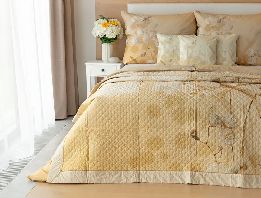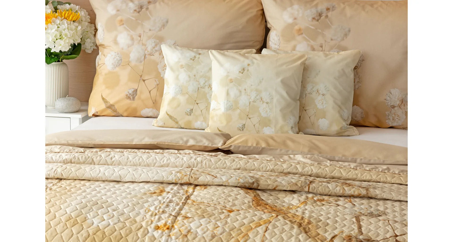 Farebné prevedenie: Jemný kvetinový vzor, ktorý je z oboch strán prehozu rovnaký. Okraje zdobí farebne zladené krémové lemovanie doplnené na vrchnej strane svetlo hnedou paspulou.