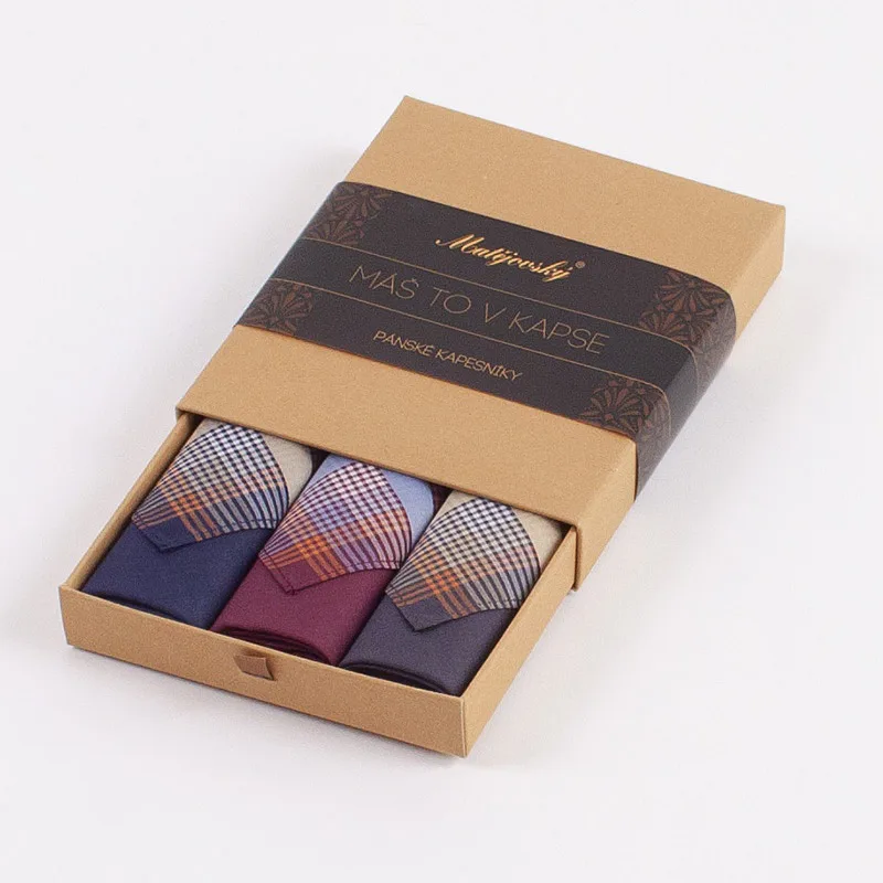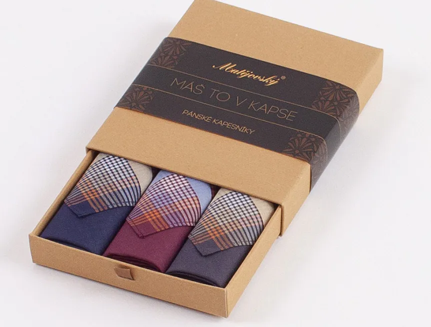 Elegance dotažená do posledního detailu. Tradiční bavlněný kapesník je nejen praktickým pomocníkem v celé řadě každodenních okamžiků, ale také symbolem elegance a vytříbeného stylu. Sada tří barevně sladěných látkových kapesníků, které vynikají hebkostí a savostí, se i díky originálnímu balení stane ideálním dárkem pro moderního gentlemana.