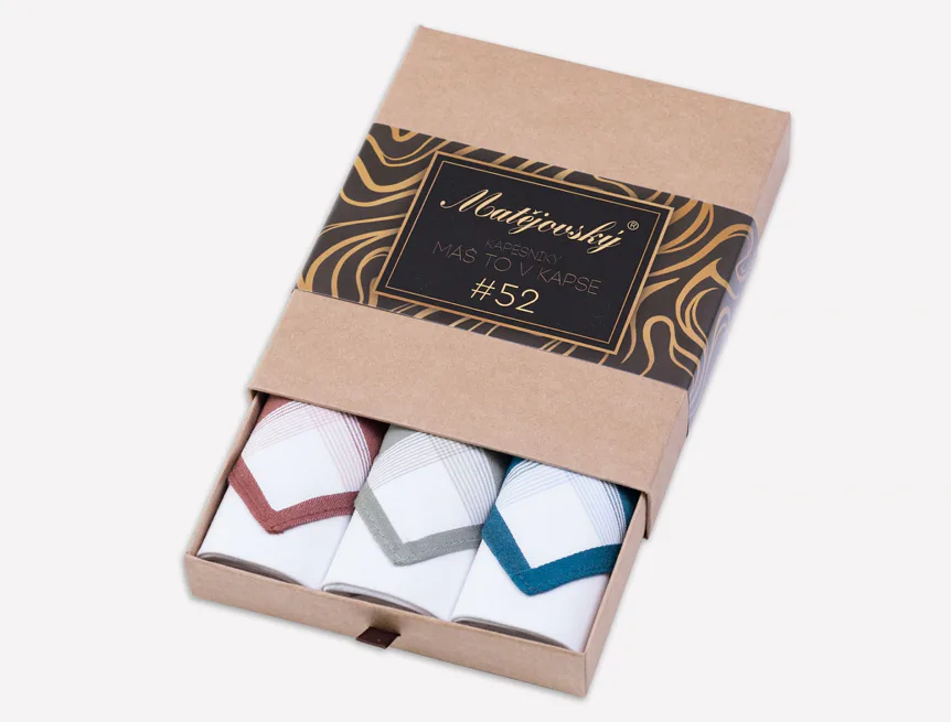 Elegance dotažená do posledního detailu. Tradiční bavlněný kapesník je nejen praktickým pomocníkem v celé řadě každodenních okamžiků, ale také symbolem elegance a vytříbeného stylu. Sada tří barevně sladěných látkových kapesníků, které vynikají hebkostí a savostí, se i díky originálnímu balení stane ideálním dárkem pro moderního gentlemana.