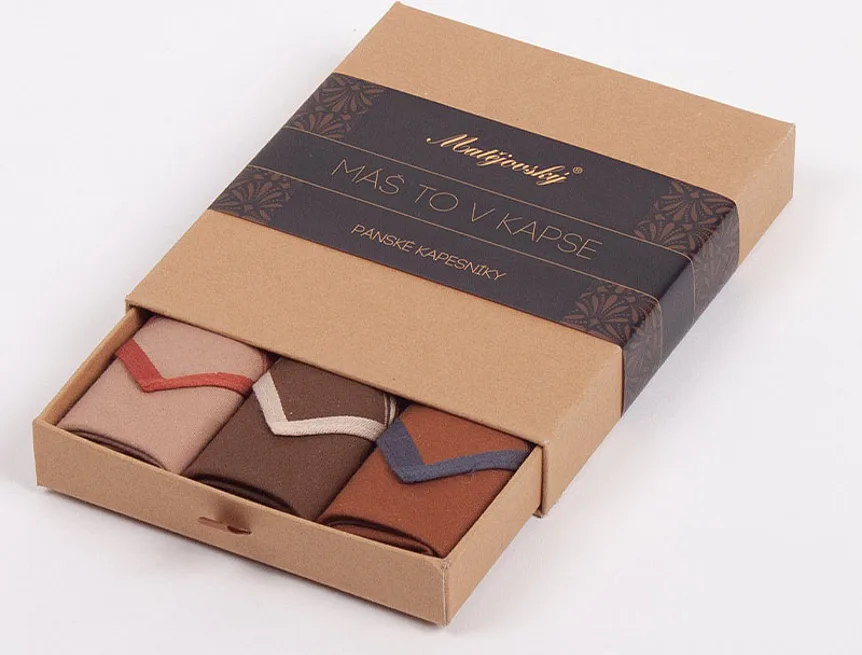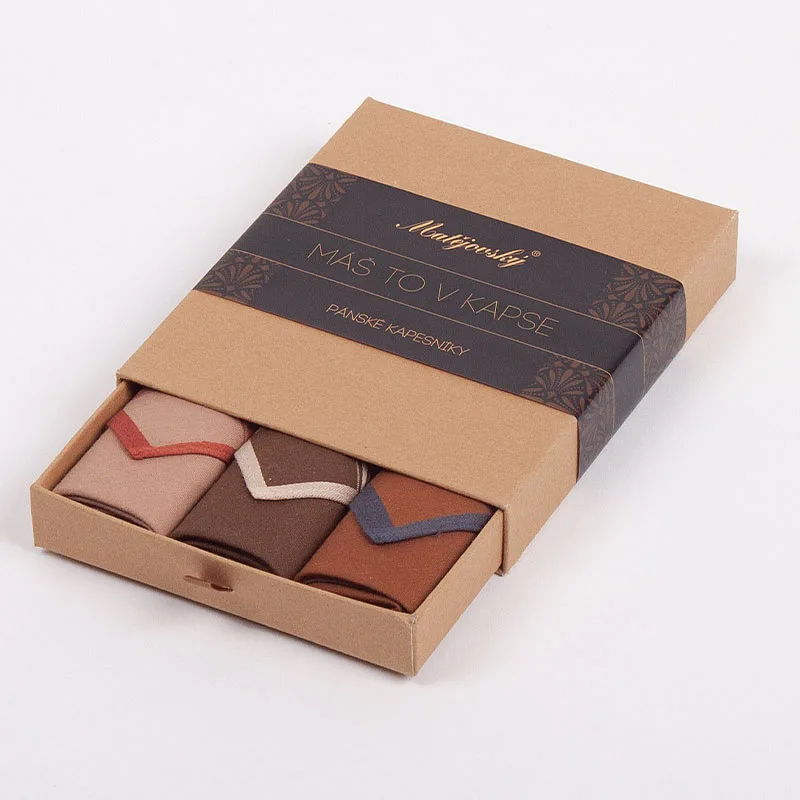 Elegance dotažená do posledního detailu. Tradiční bavlněný kapesník je nejen praktickým pomocníkem v celé řadě každodenních okamžiků, ale také symbolem elegance a vytříbeného stylu. Sada tří barevně sladěných látkových kapesníků, které vynikají hebkostí a savostí, se i díky originálnímu balení stane ideálním dárkem pro moderního gentlemana.