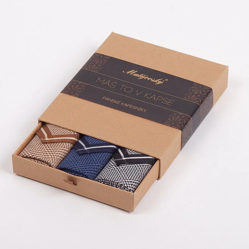 Elegance dotažená do posledního detailu. Tradiční bavlněný kapesník je nejen praktickým pomocníkem v celé řadě každodenních okamžiků, ale také symbolem elegance a vytříbeného stylu. Sada tří barevně sladěných látkových kapesníků, které vynikají hebkostí a savostí, se i díky originálnímu balení stane ideálním dárkem pro moderního gentlemana.