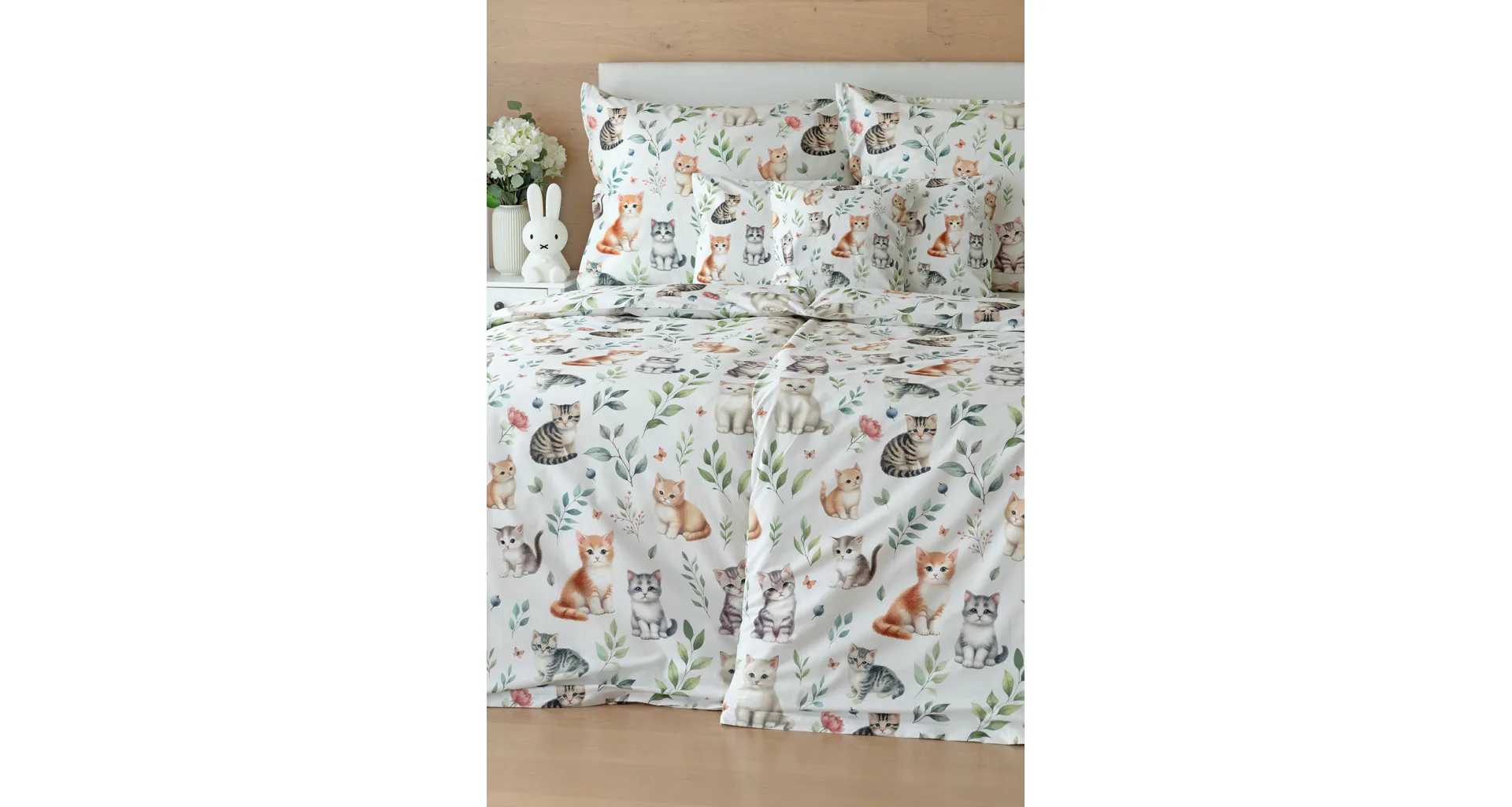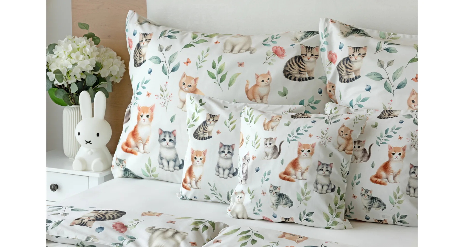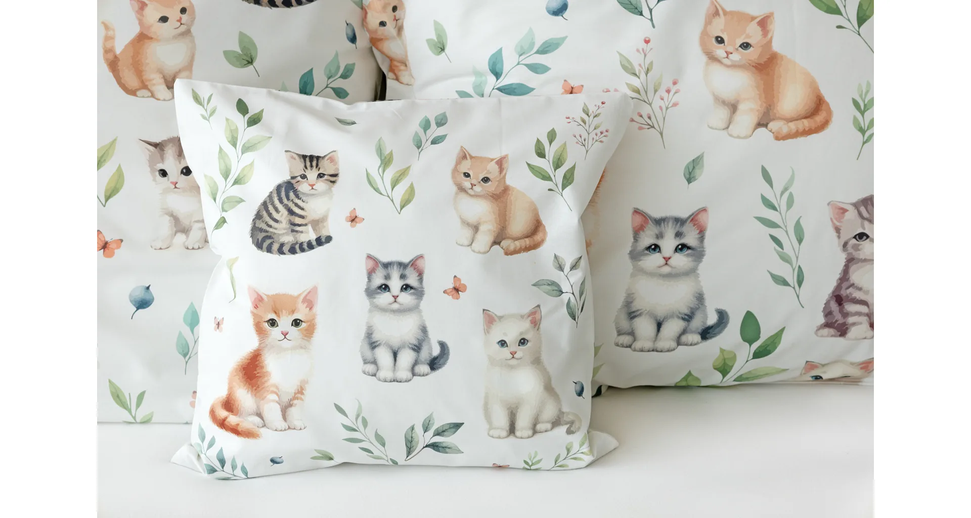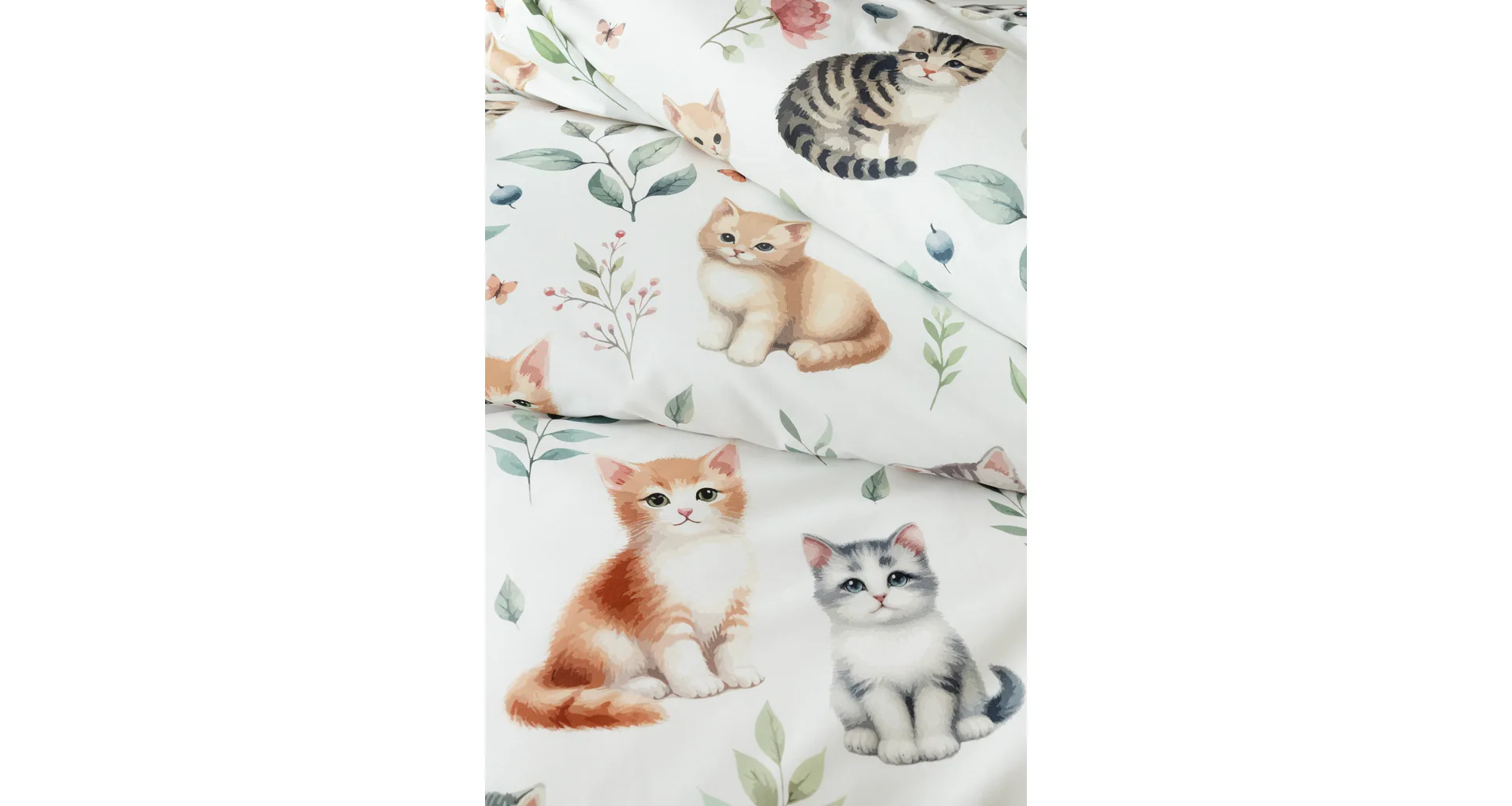 Povlak na vankúš aj na prikrývku zachytáva z oboch strán motív mačiatok. Obliečky sú vyrobené zo 100% bavlny a sú opatrené praktickým zipsovým uzáverom.