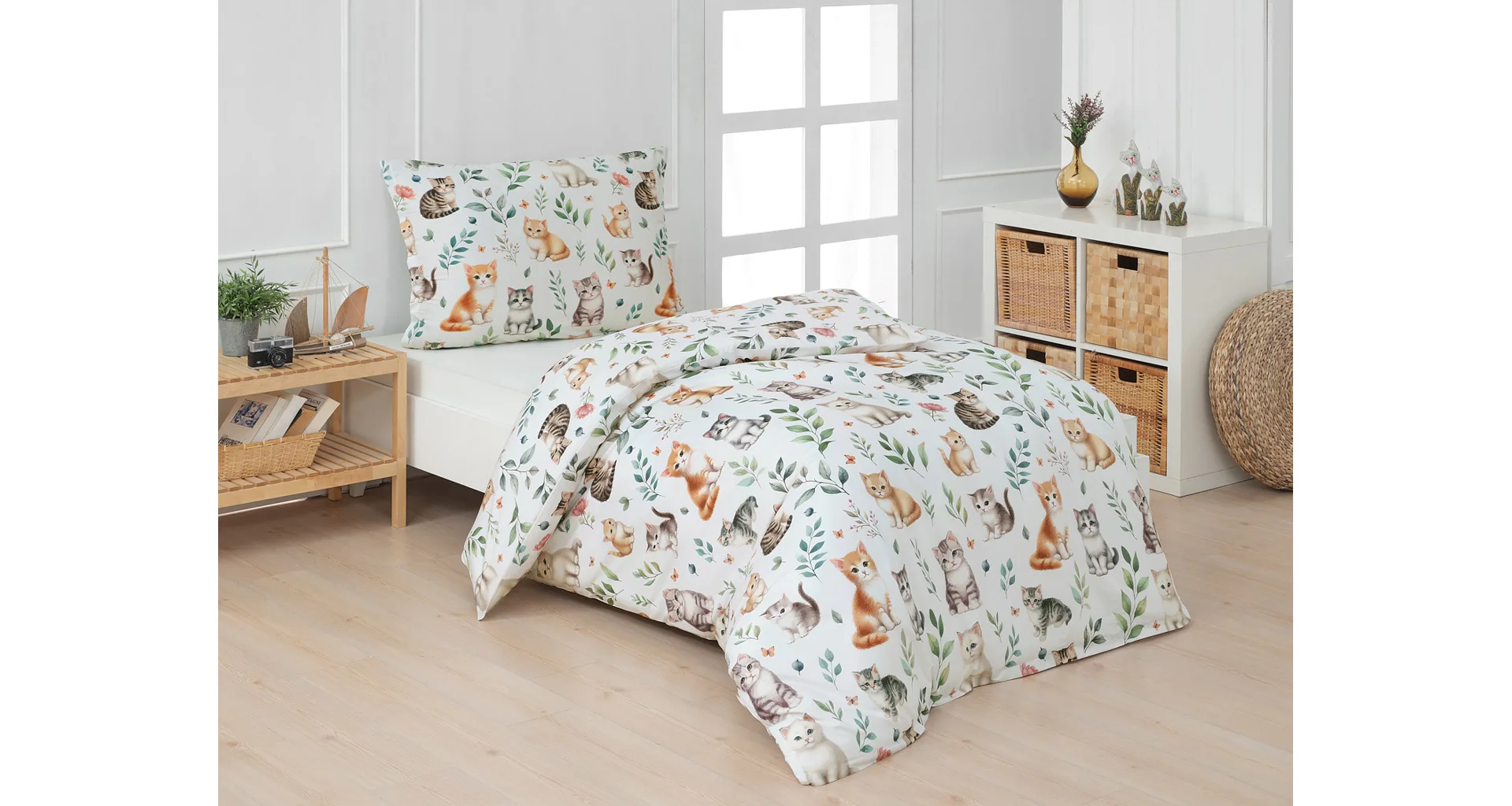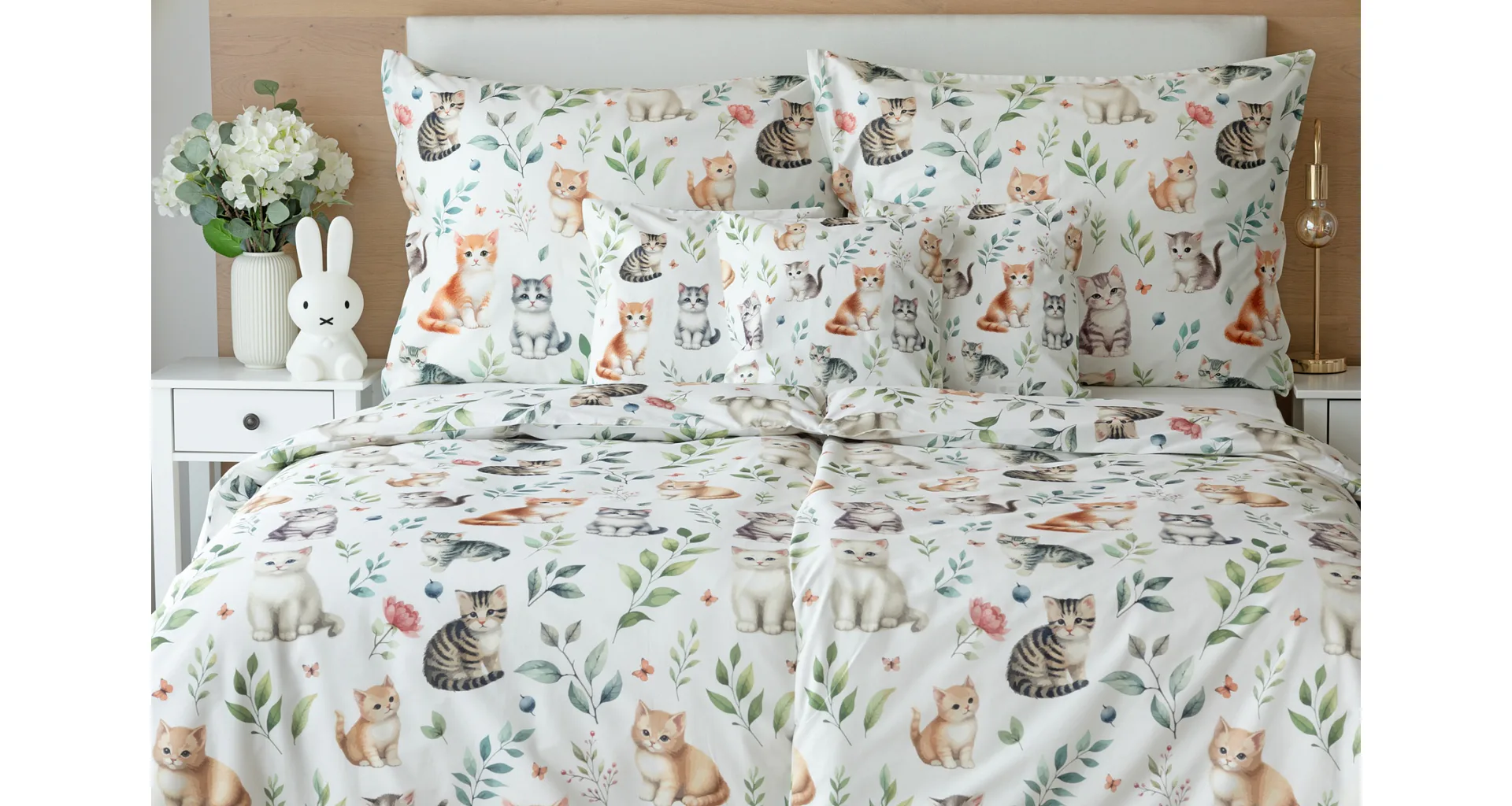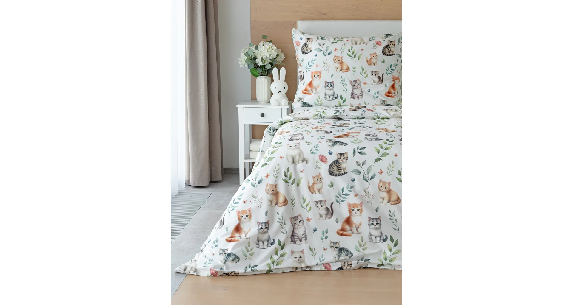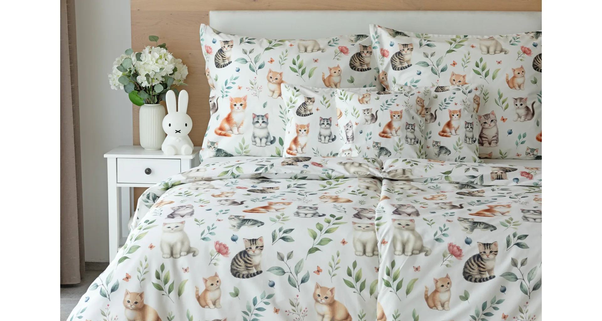 Povlak na vankúš aj na prikrývku zachytáva z oboch strán motív mačiatok. Obliečky sú vyrobené zo 100% bavlny a sú opatrené praktickým zipsovým uzáverom.