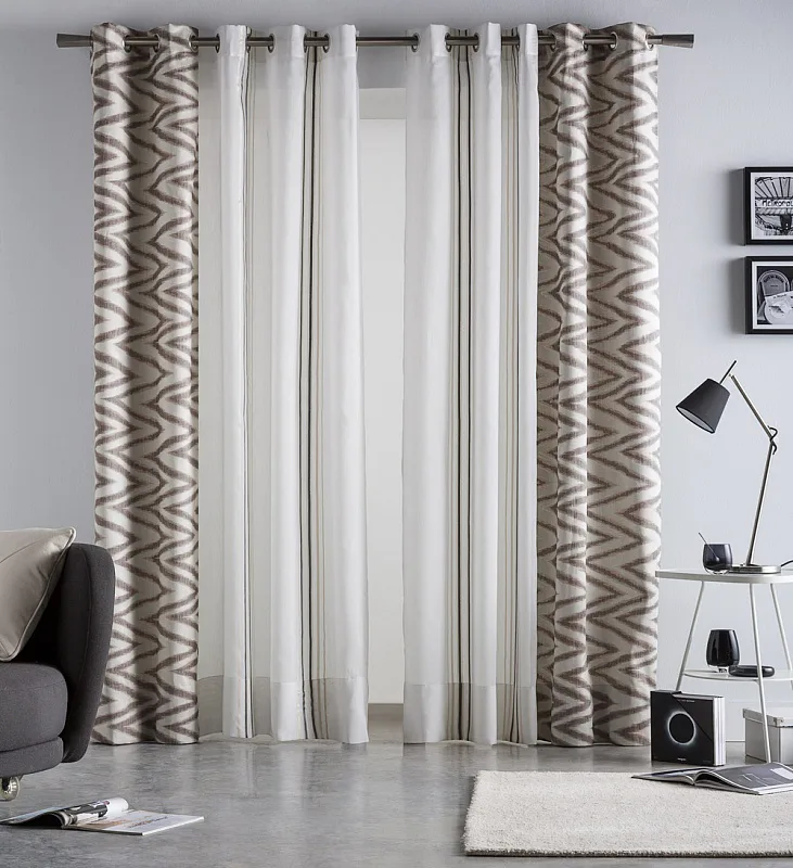 Limitovaná kolekce kombinovaných dekoračních závěsů přináší mimořádný designový kousek. Dodejte interiéru styl okouzlujícím závěsem ANABEL CHOCO. Dokonale sladěné odstíny hnědé a zlatavé barvy na částečně zatemňující designové části se skvěle doplňují s průhledným bílým tylem zdobeným svislými zlatavými a hnědými proužky. Obě části na sebe plynule navazují a tvoří tak originální celek. Jemný matný lesk dodává kombinovanému závěsu nadčasovou eleganci.