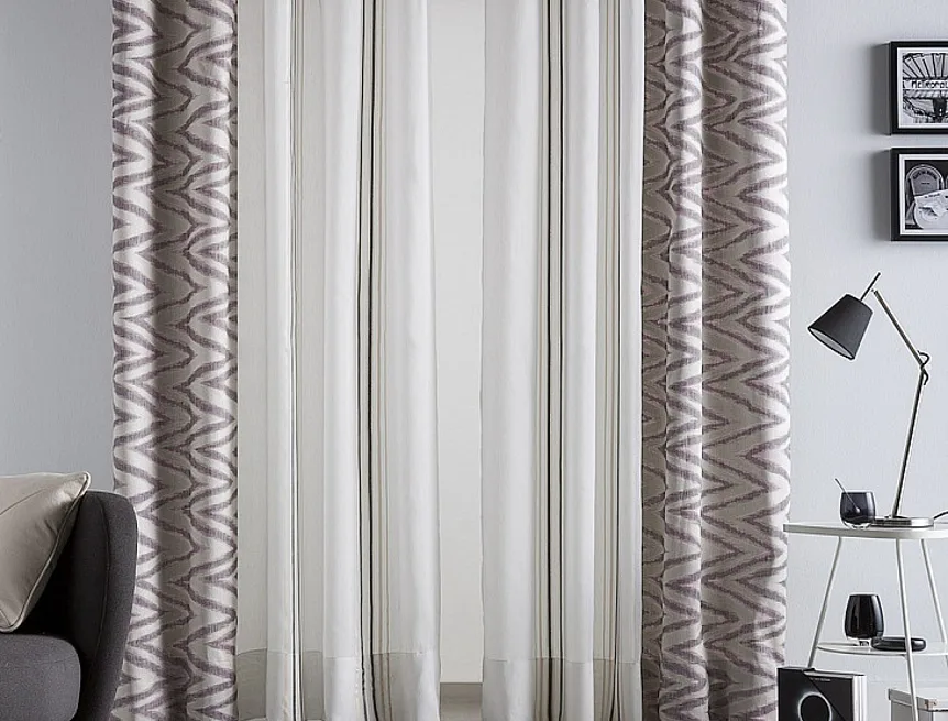 Limitovaná kolekce kombinovaných dekoračních závěsů přináší mimořádný designový kousek. Dodejte interiéru styl okouzlujícím závěsem ANABEL LILA. Dokonale sladěné odstíny starofialové a šedé barvy na částečně zatemňující designové části se skvěle doplňují s průhledným bílým tylem zdobeným svislými starofialovými a šedobéžovými proužky. Obě části na sebe plynule navazují a tvoří tak originální celek. Jemný matný lesk dodává kombinovanému závěsu nadčasovou eleganci.