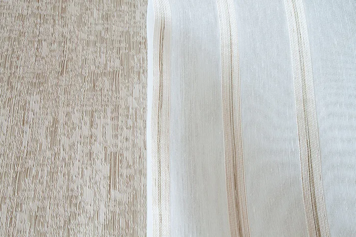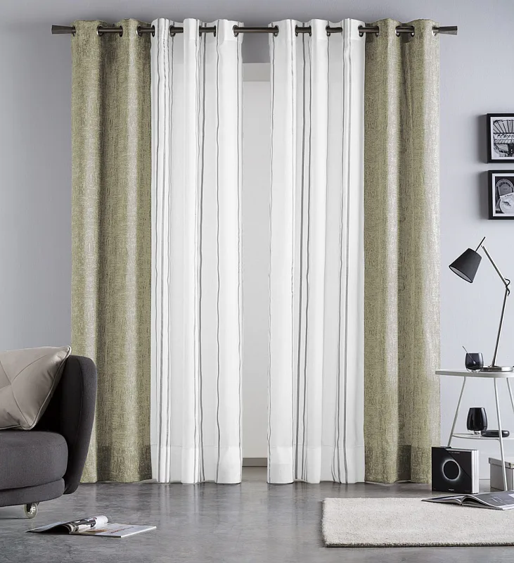 Limitovaná kolekce kombinovaných dekoračních závěsů přináší mimořádný designový kousek. Dodejte interiéru styl okouzlujícím závěsem MARTINA SAND. Dokonale sladěné odstíny zlatavé a krémové barvy na částečně zatemňující designové části se skvěle doplňují s průhledným bílým tylem zdobeným svislými zlatavými proužky. Obě části na sebe plynule navazují a tvoří tak originální celek. Jemný matný lesk dodává kombinovanému závěsu nadčasovou eleganci.