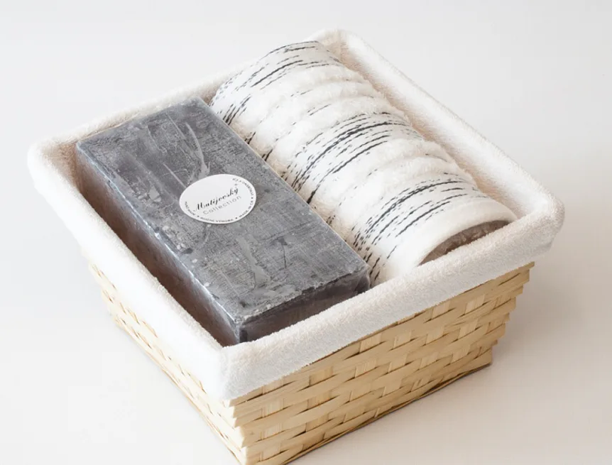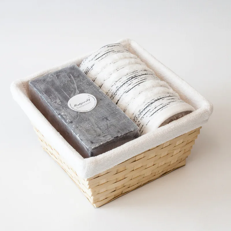 Proutěný košík a bílá textilní vsadka jsou součástí dárkového balení.