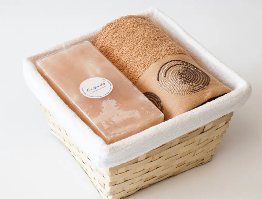 Balení obsahuje barevně sladěný set ručníku a ručně vyráběné vonné svíčky.