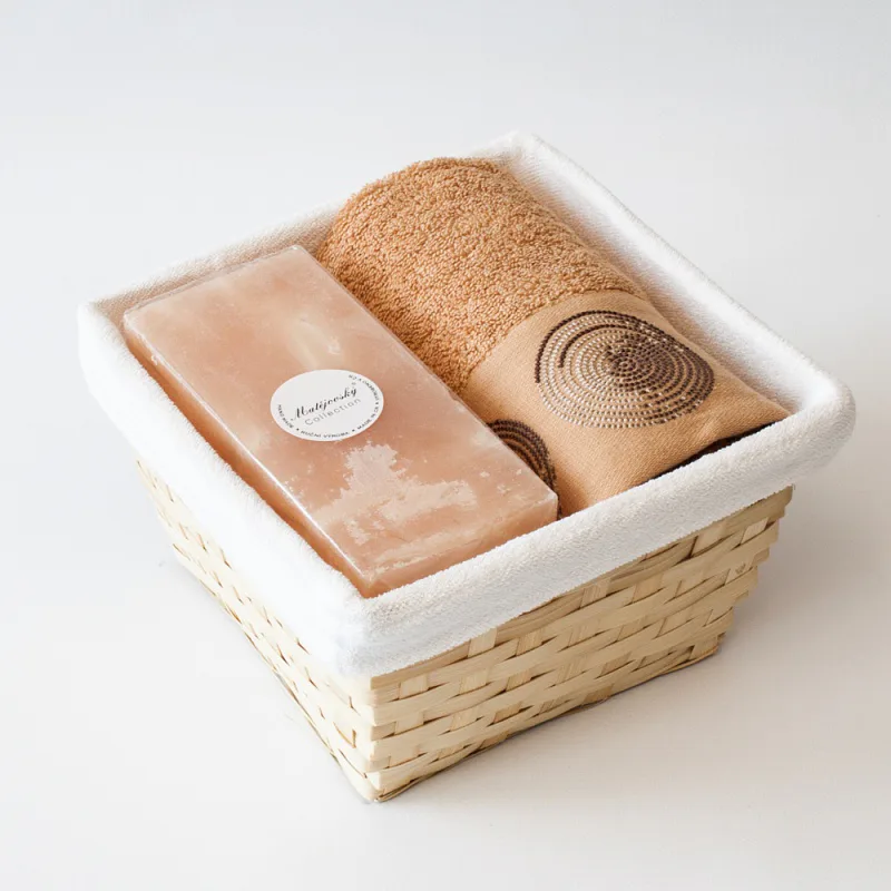 Proutěný košík a bílá textilní vsadka jsou součástí dárkového balení.