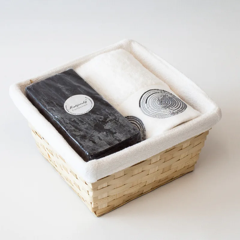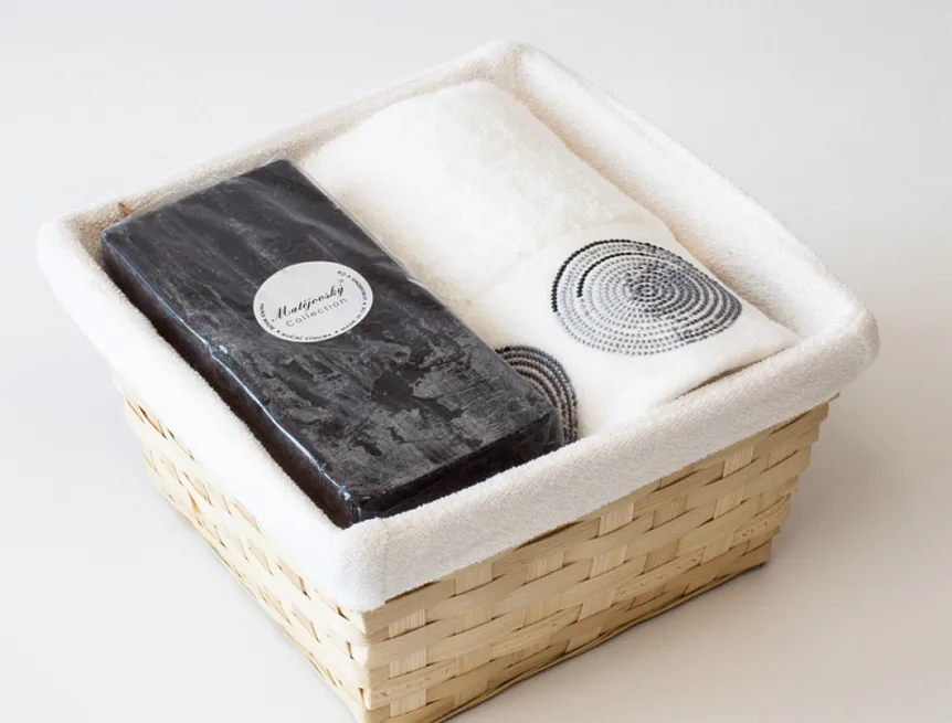 Proutěný košík a bílá textilní vsadka jsou součástí dárkového balení.