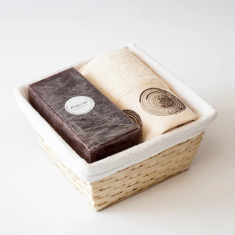 Balení obsahuje barevně sladěný set ručníku a ručně vyráběné vonné svíčky.