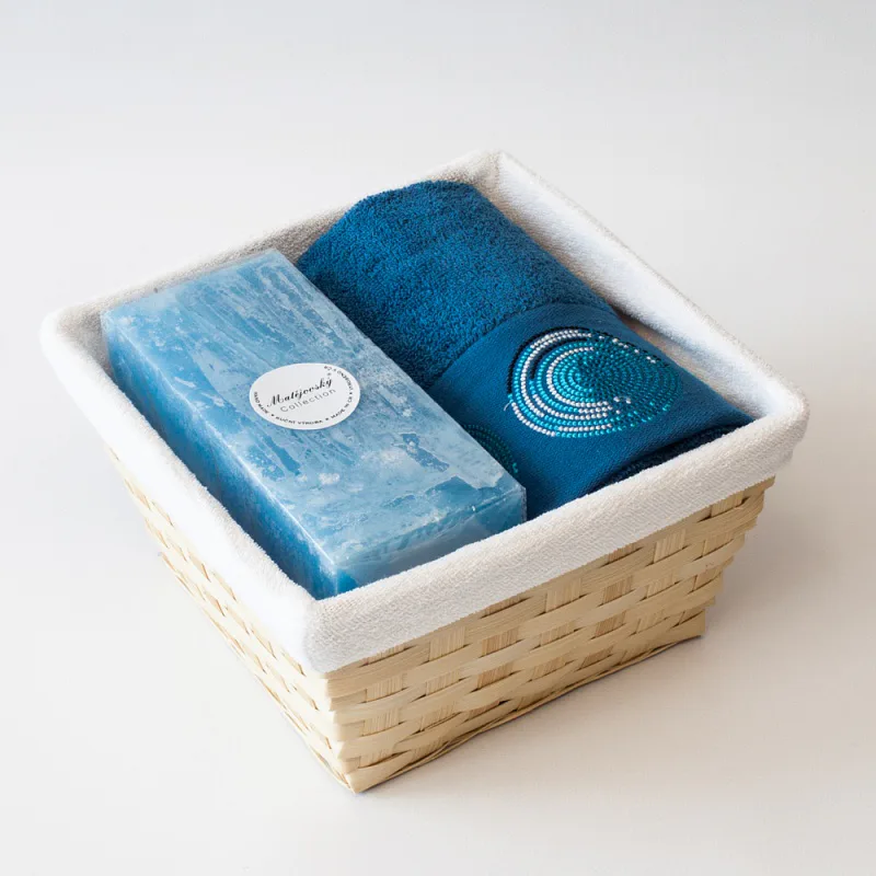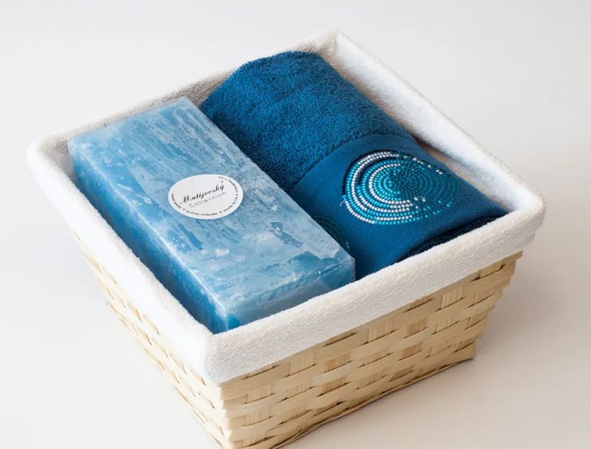 Balení obsahuje barevně sladěný set ručníku a ručně vyráběné vonné svíčky.