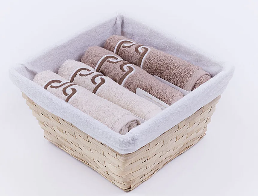 Košík s textilní vsadkou je součástí balení. Ručníky jsou opatřeny poutkem.