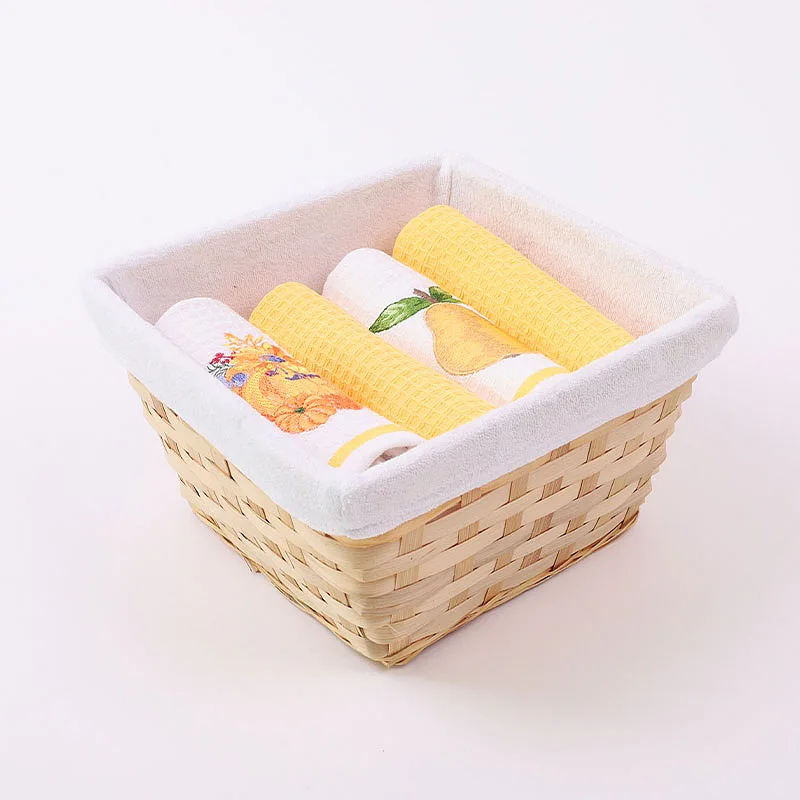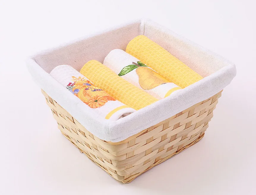 Proutěný košík s textilní vsadkou je spolu s utěrkami zabalen v celofánu a doplněn ozdobnou mašlí.