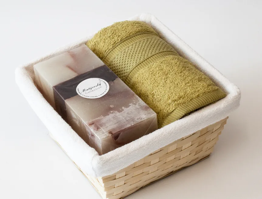 Balení obsahuje barevně sladěný set ručníku a ručně vyráběné vonné svíčky.