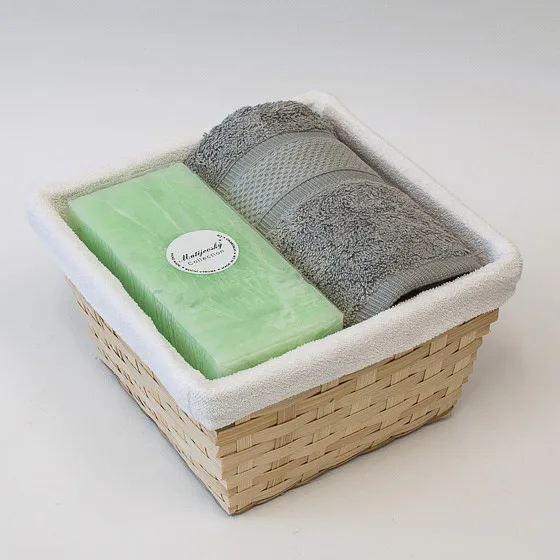 Proutěný košík a bílá textilní vsadka jsou součástí dárkového balení.