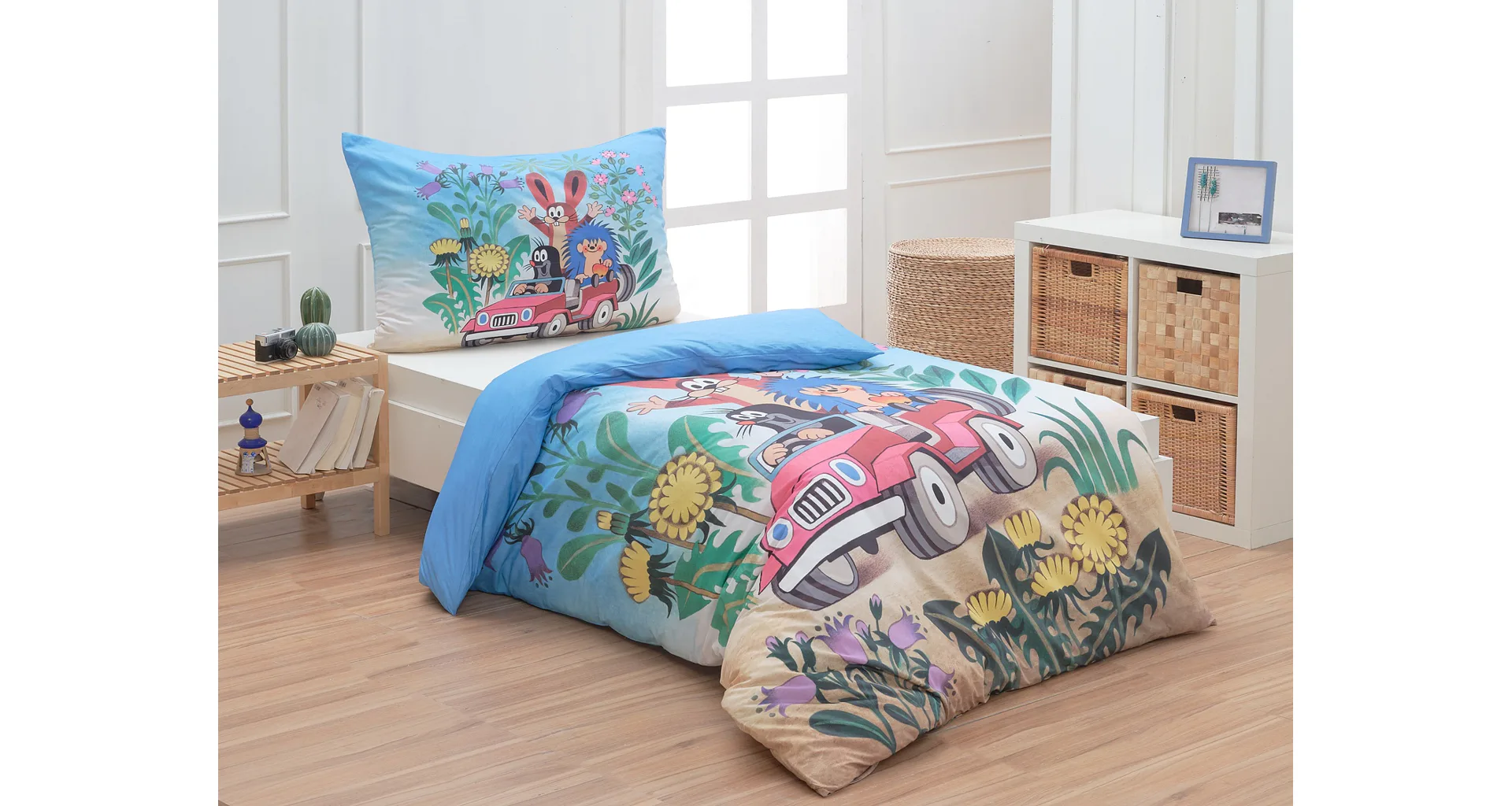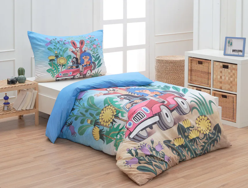 Krtko v aute sprevádza deti mnohých generácií, tie dnešné neopúšťa ani v spánku. Detská posteľná bielizeň s veselými postavičkami Krtka a jeho kamarátov v autíčku rozveselí detskú postieľku a deťom sa v nej bude krásne zaspávať. Mamičky zase ocenia vysokokvalitný materiál. Posteľná bielizeň je vyrobená z tej najkvalitnejšej 100 % bavlny. Je vybavená pohodlným zipsovým uzáverom.
