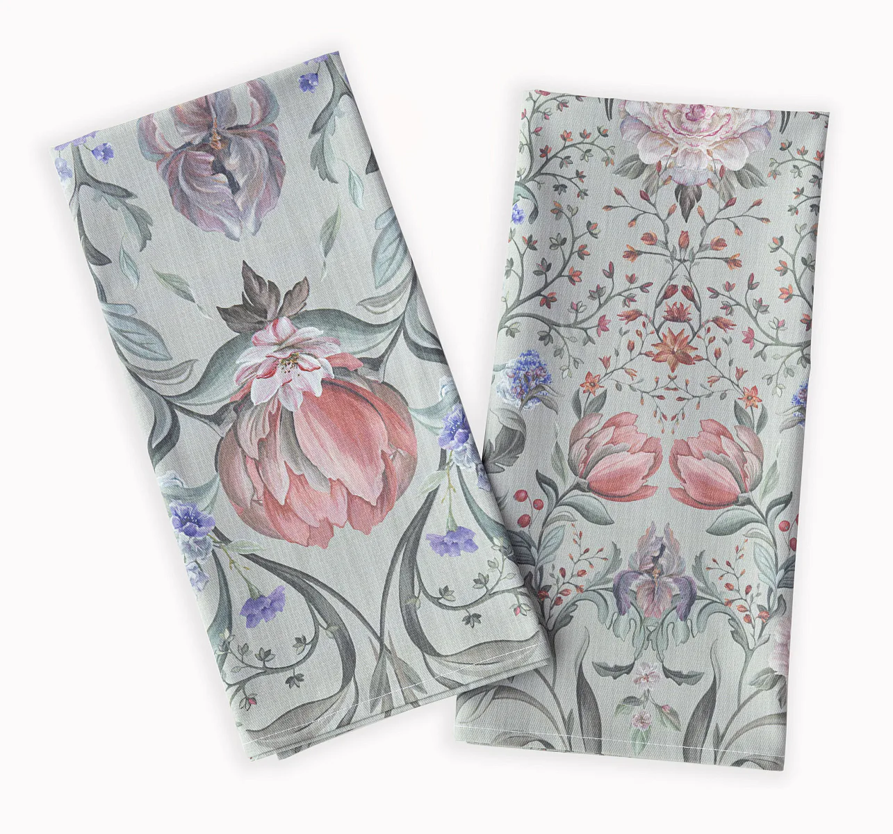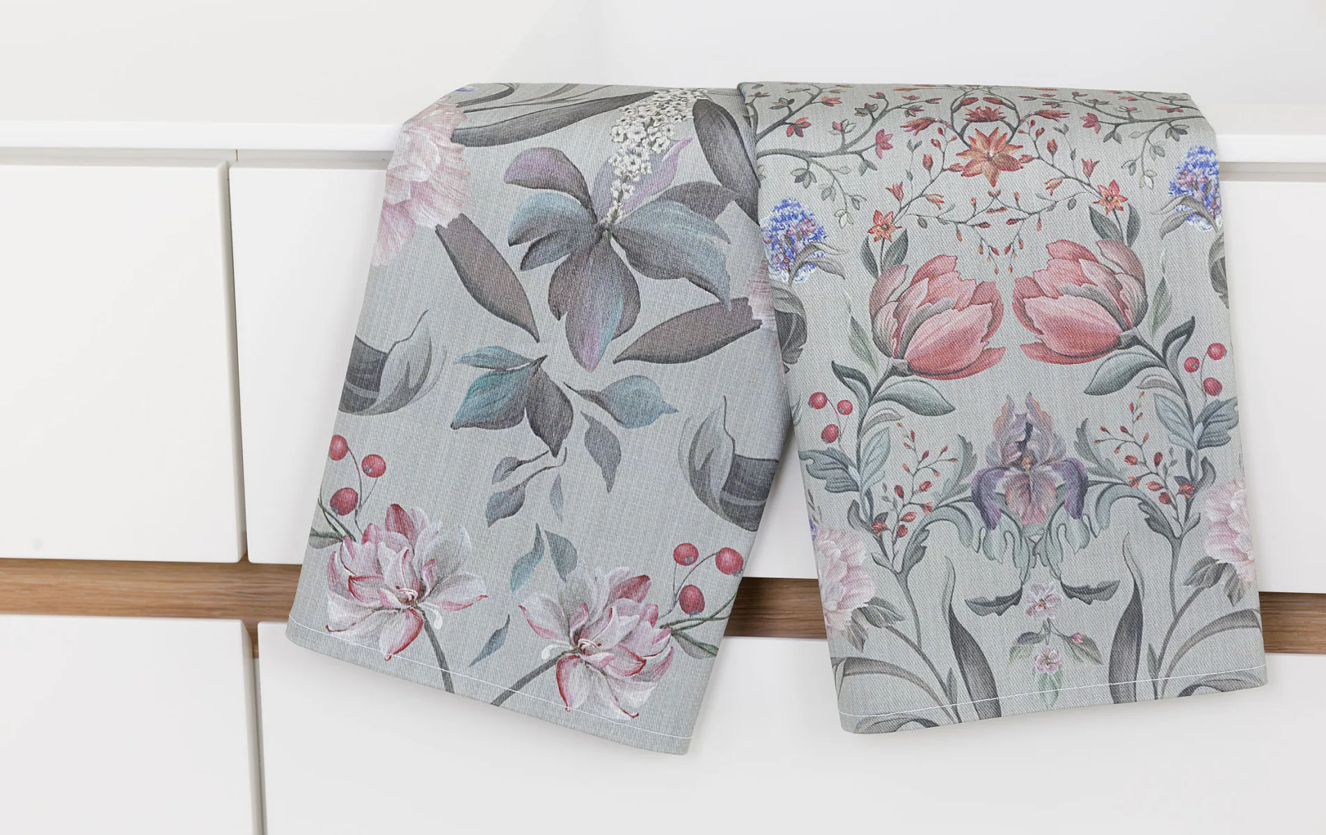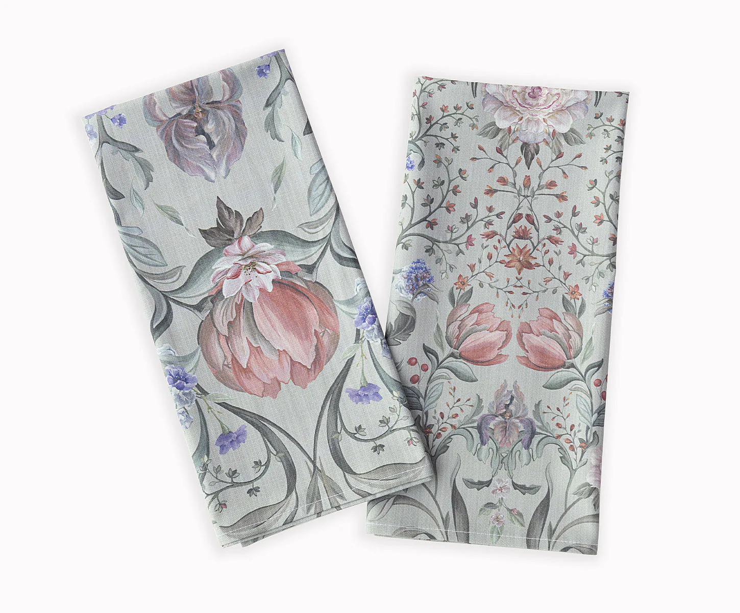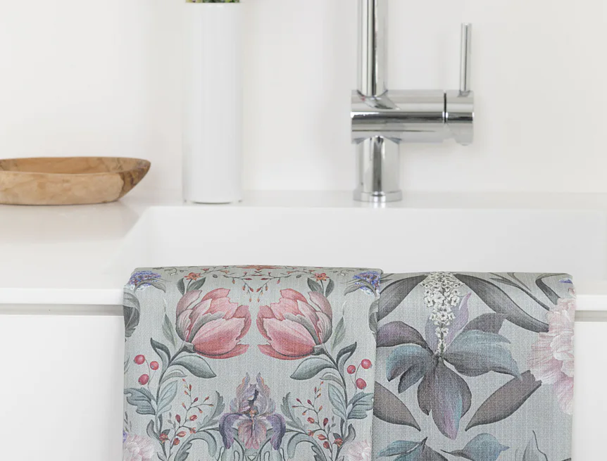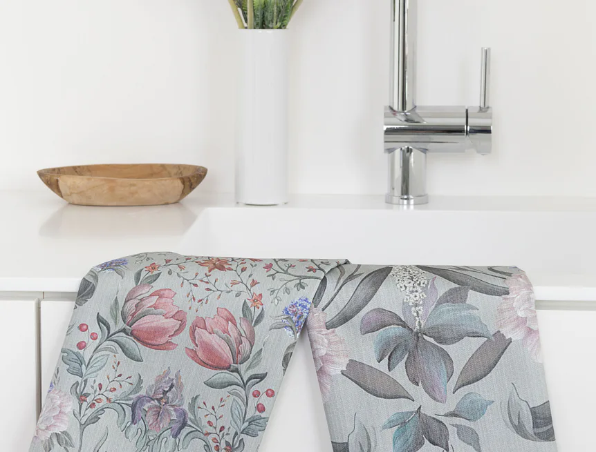 Potisk: jednostranný, obě utěrky zachycují stejný florální motiv s odlišnou velikostí květin