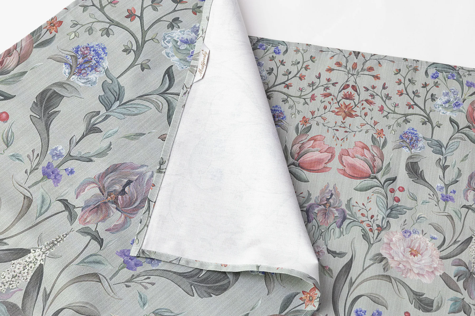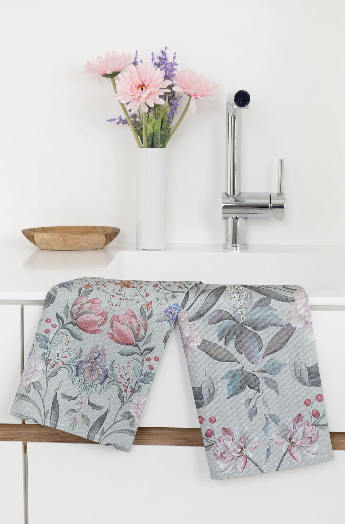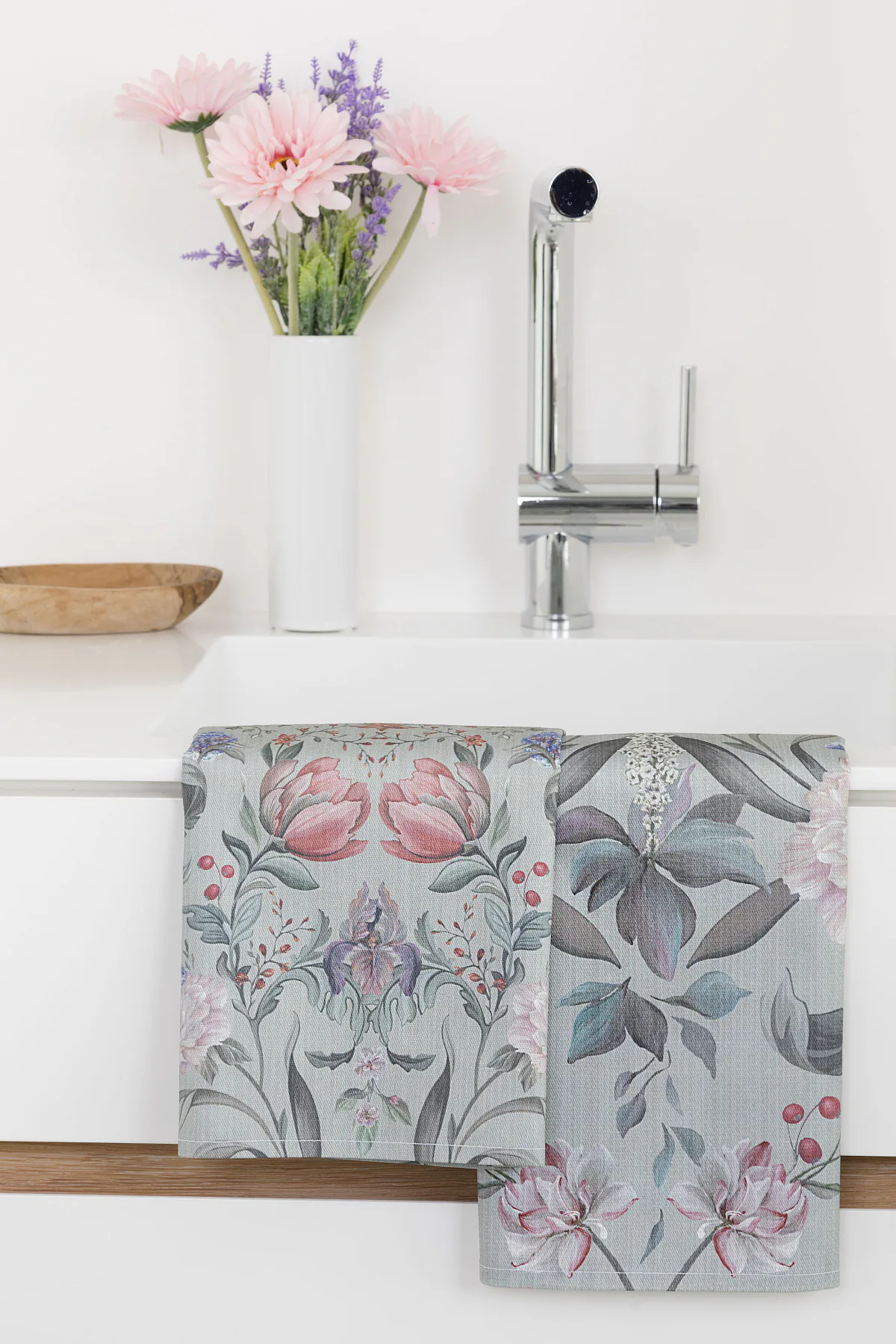 Potisk: jednostranný, obě utěrky zachycují stejný florální motiv s odlišnou velikostí květin