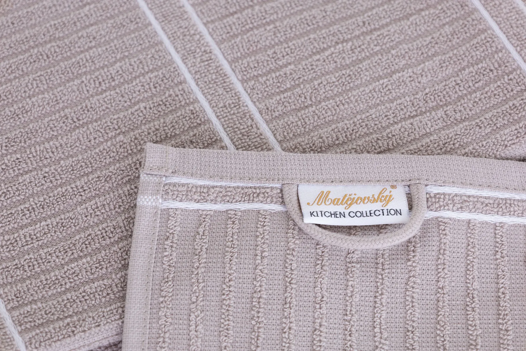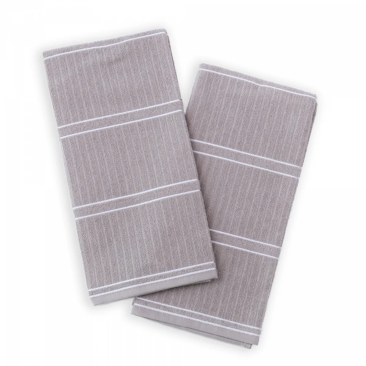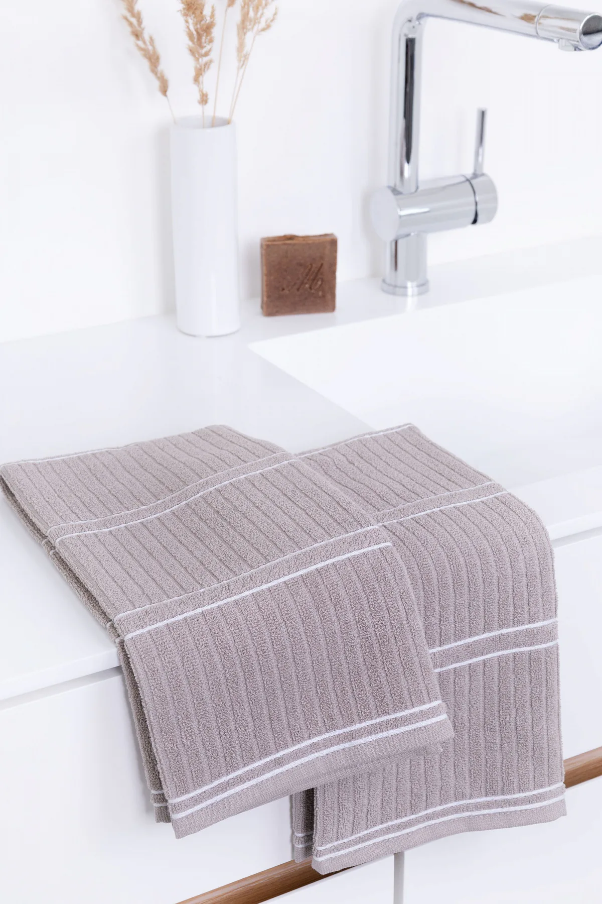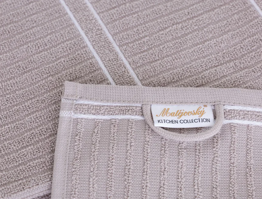 Kuchyňské utěrky Arona upoutají vaši pozornost moderním designem - vytkaný proužkovaný vzor vyniká na lícové straně smyčkového froté. Spodní stranu utěrky tvoří odlehčené froté v inverzním provedení. Originální design utěrek podtrhuje vodorovně vyšitá bílá linka. Utěrky jsou navrženy tak, aby měly ideální absorpční vlastnosti a současně rychle schly. Utěrky jsou ze všech čtyř stran lemované a jsou opatřeny praktickým poutkem.