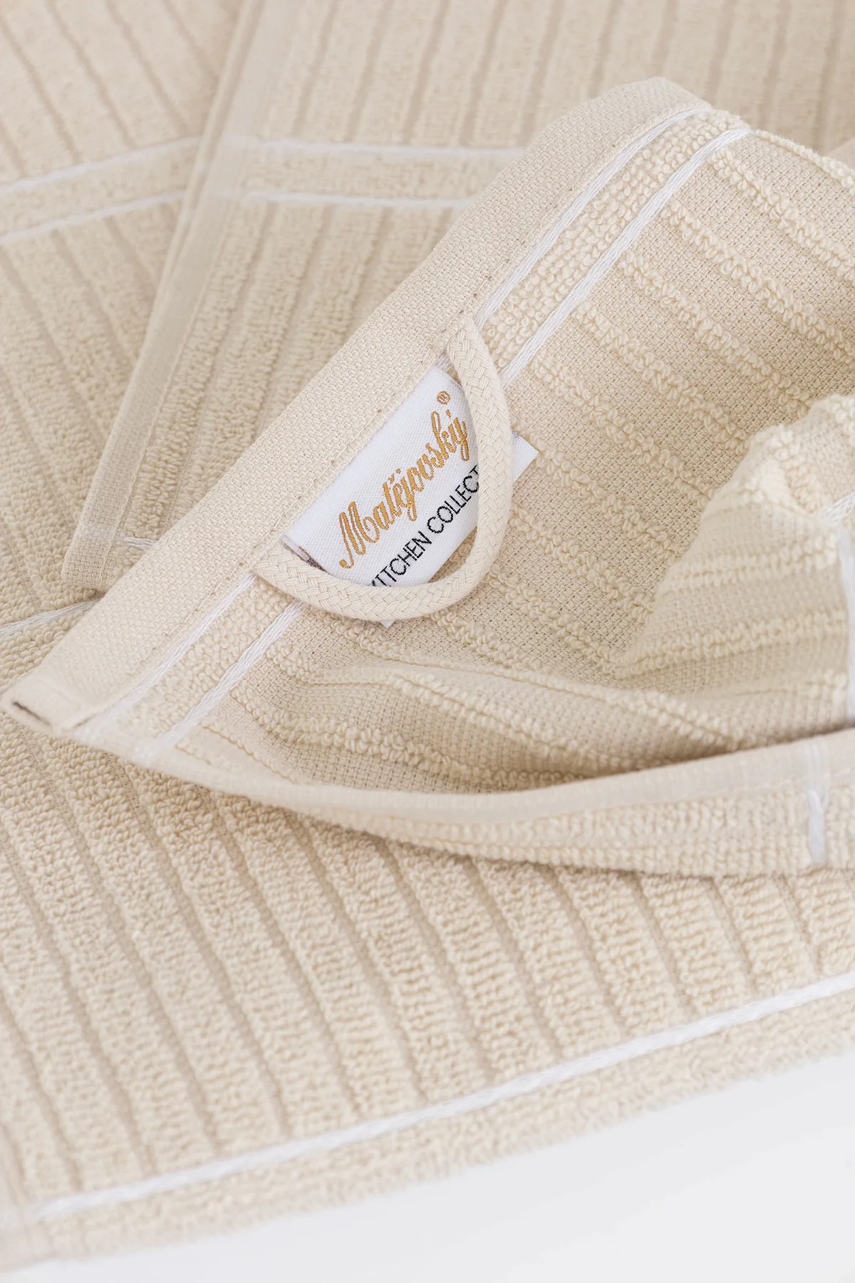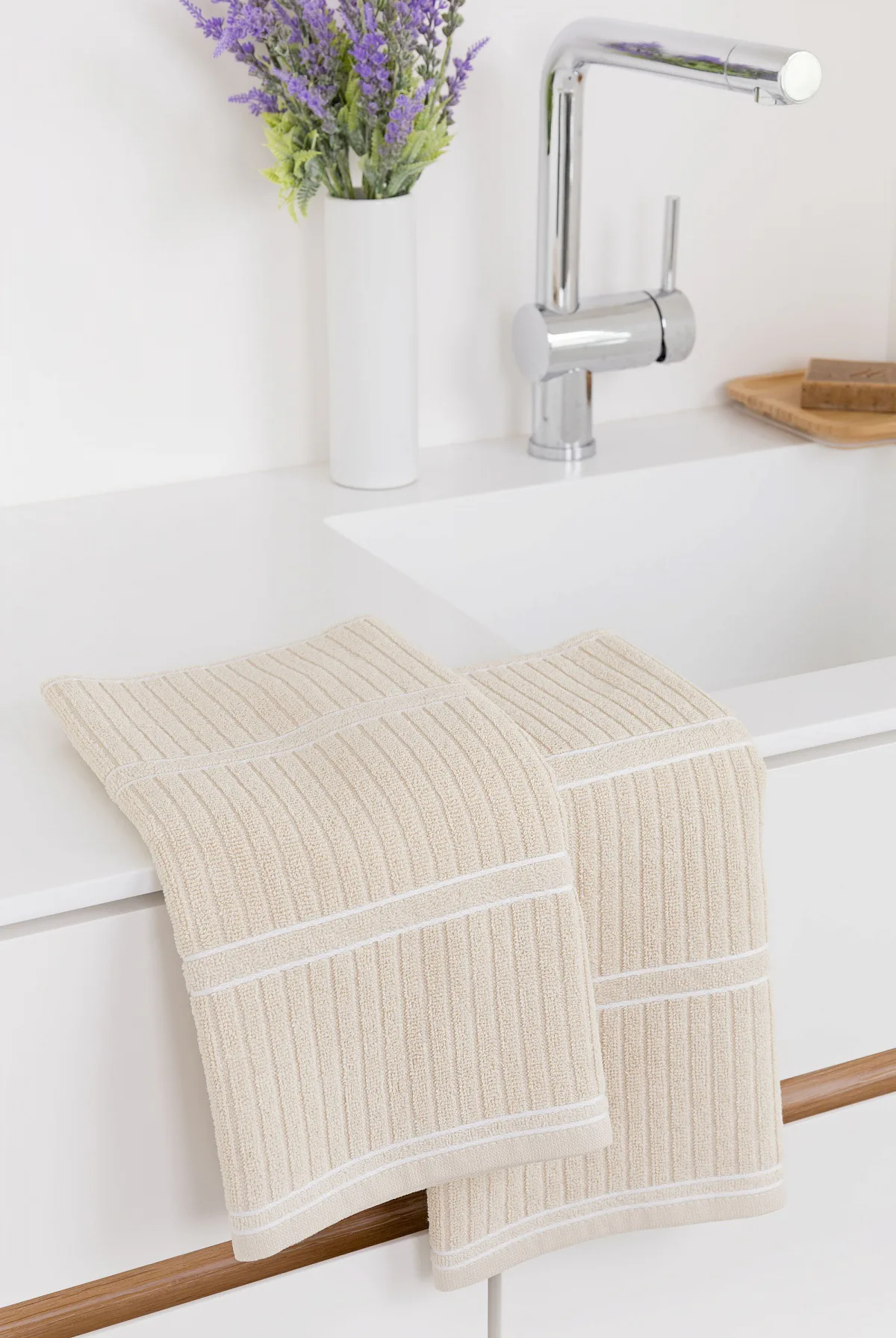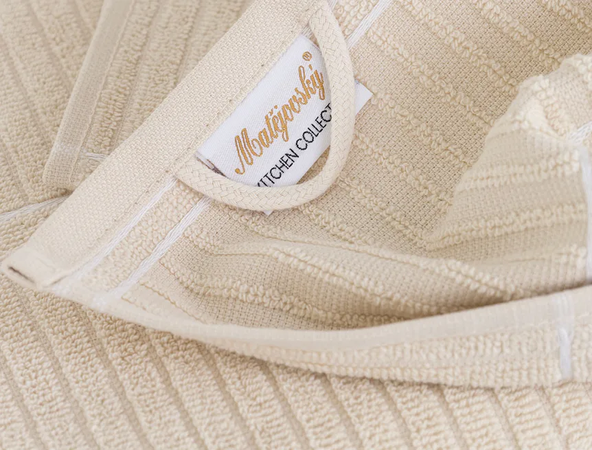 Kuchyňské utěrky Arona upoutají vaši pozornost moderním designem - vytkaný proužkovaný vzor vyniká na lícové straně smyčkového froté. Spodní stranu utěrky tvoří odlehčené froté v inverzním provedení. Originální design utěrek podtrhuje vodorovně vyšitá bílá linka. Utěrky jsou navrženy tak, aby měly ideální absorpční vlastnosti a současně rychle schly. Utěrky jsou ze všech čtyř stran lemované a jsou opatřeny praktickým poutkem.