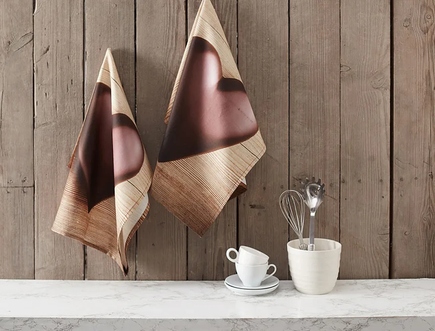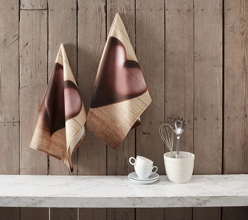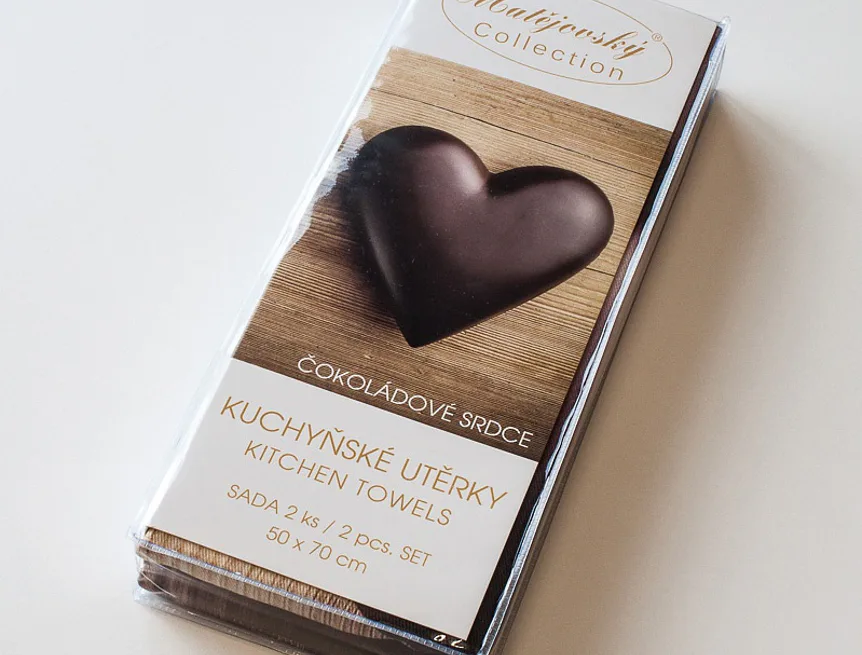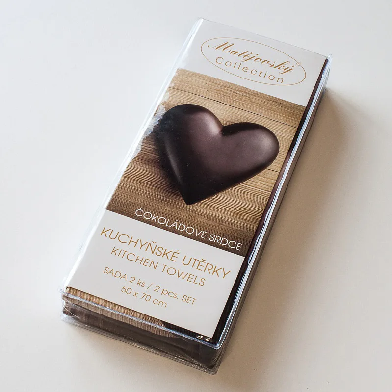 Nová exkluzivní kolekce designových kuchyňských utěrek přináší oblíbený vzor ČOKOLÁDOVÉ SRDCE. Okoulující hnědé tóny v kombinaci s lahodným čokoládovým motivem osvěží každý moderní interiér kuchyně.