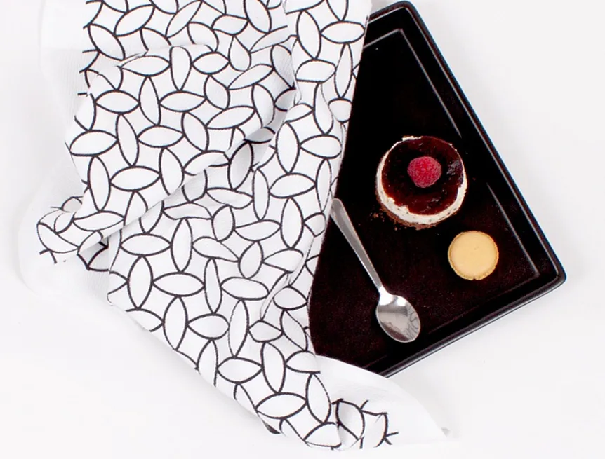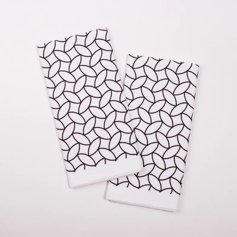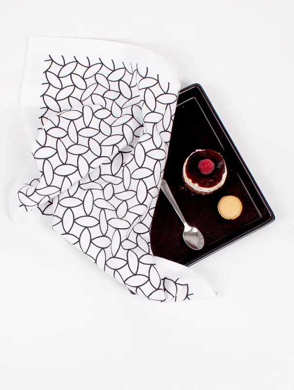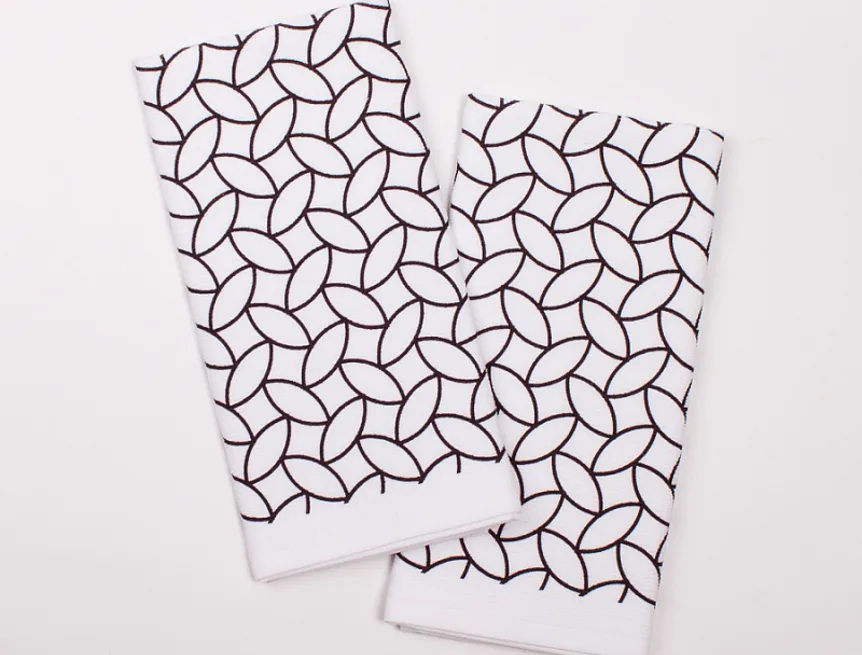Kuchyňské utěrky jsou zajímavé svým praktickým provedením. Vrchní strana je hladká s jemnou vlnkovou strukturou, spodní stranu tvoří hebké bílé froté. Jednoduchý geometrický motiv v černobílé verzi stylově doplní každý moderní interiér kuchyně. Utěrky mají všechny čtyři strany lemované a jsou opatřeny praktickým poutkem pro zavěšení.